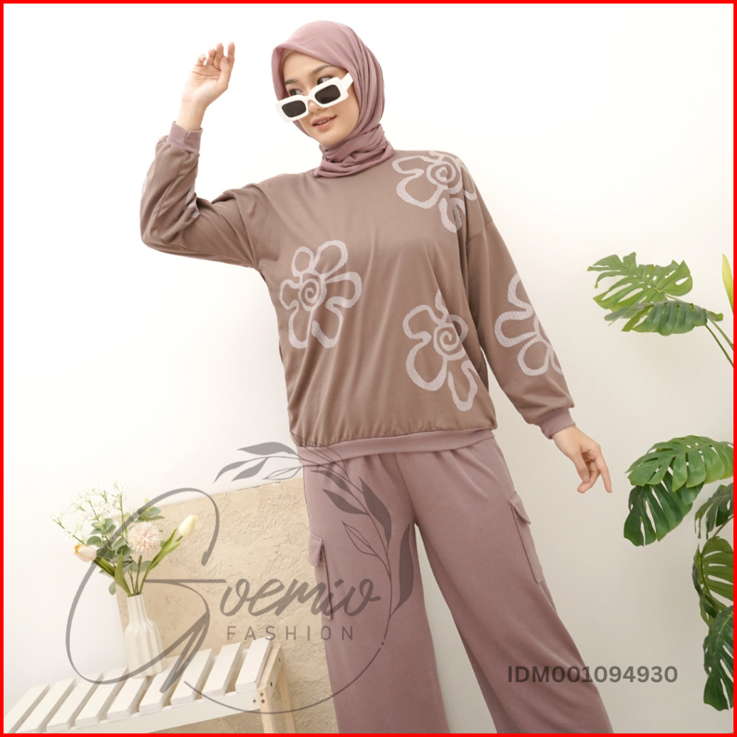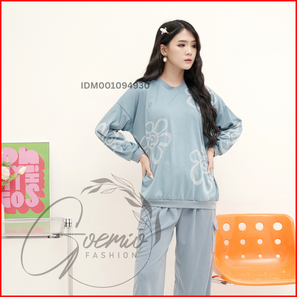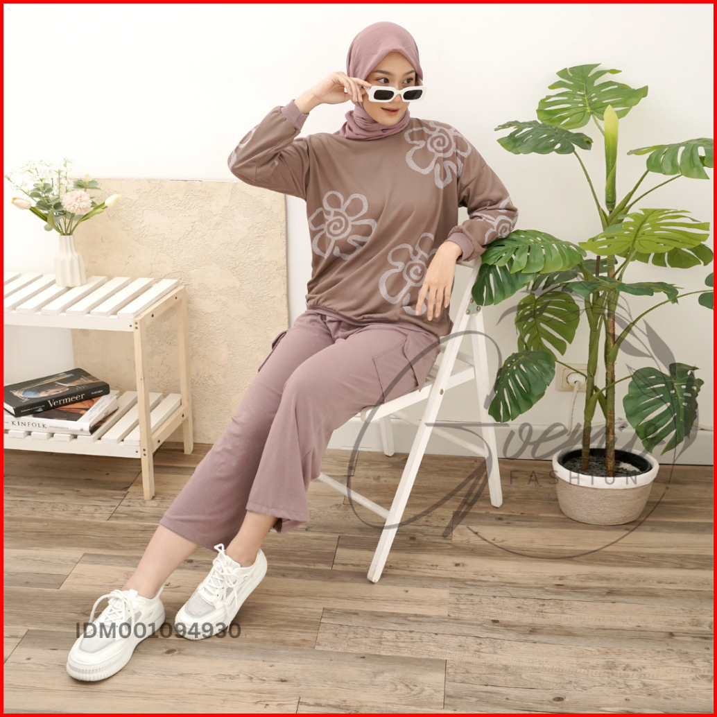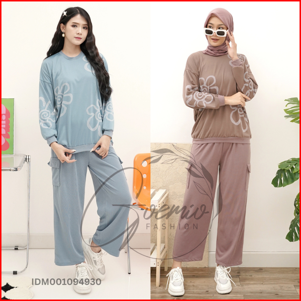 Ilook Ld 120 One Set Daisy Setelan Katun Knit Combi Atasan Motif Bunga Lengan Panjang Dan Celana Panjang Wanita