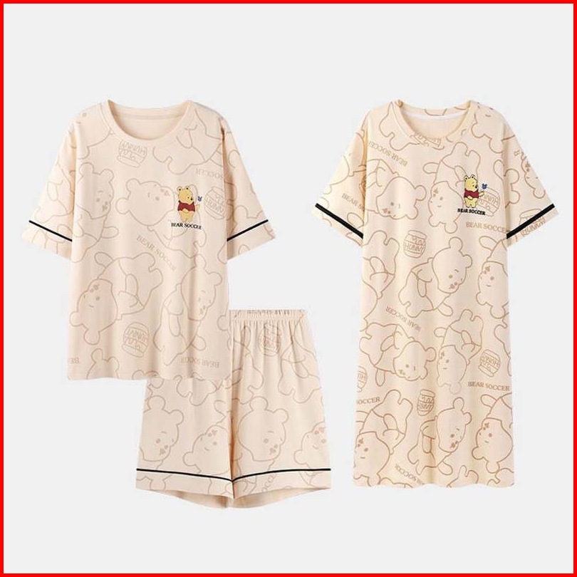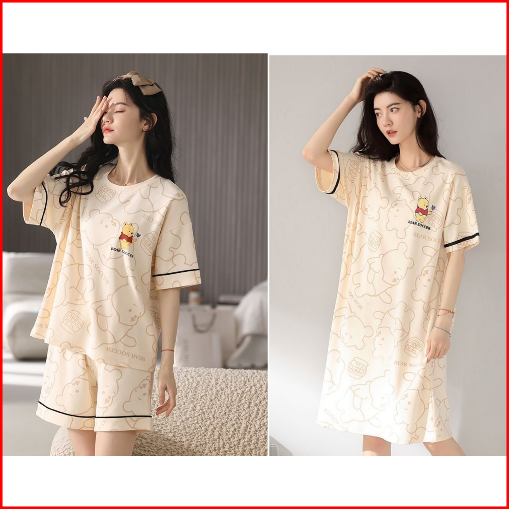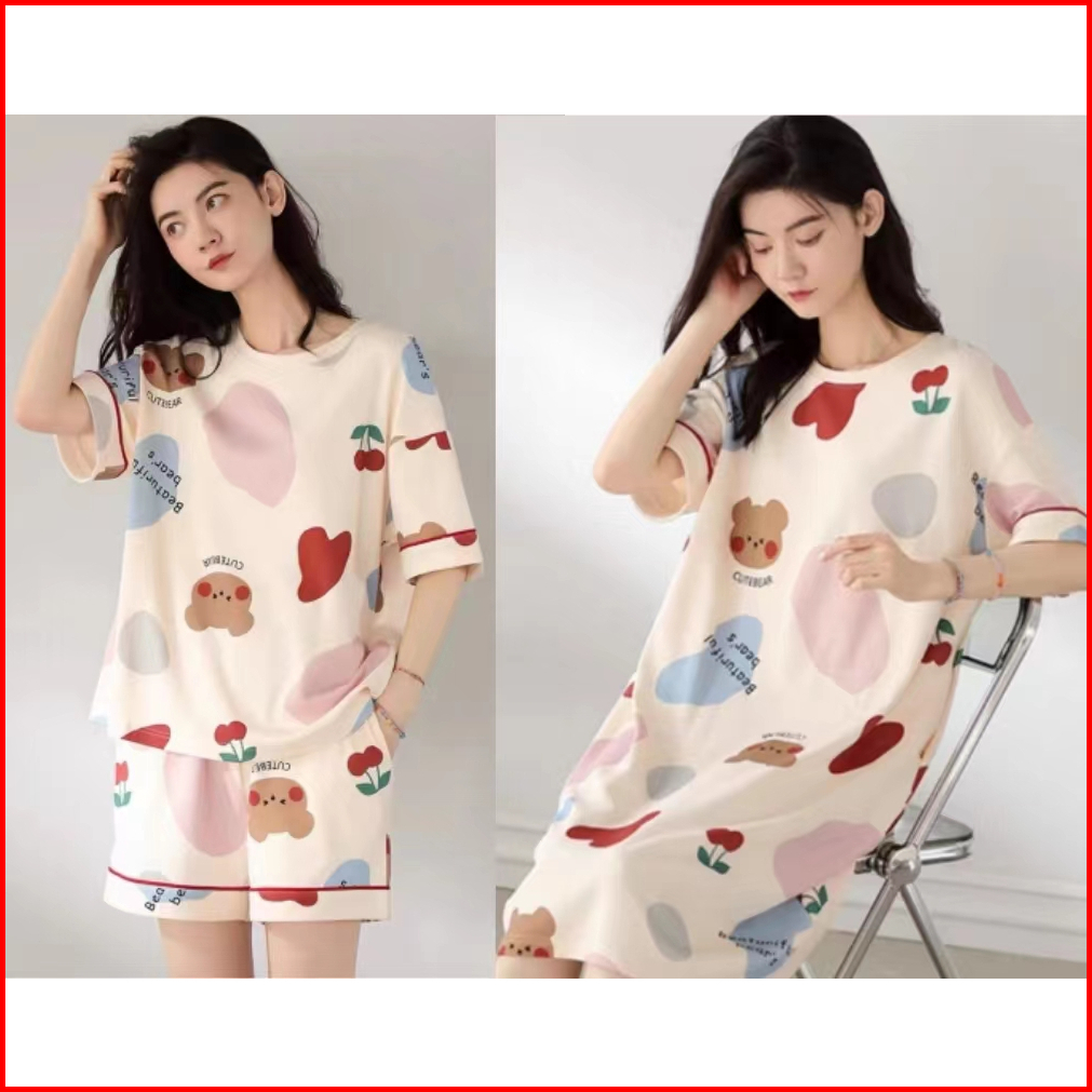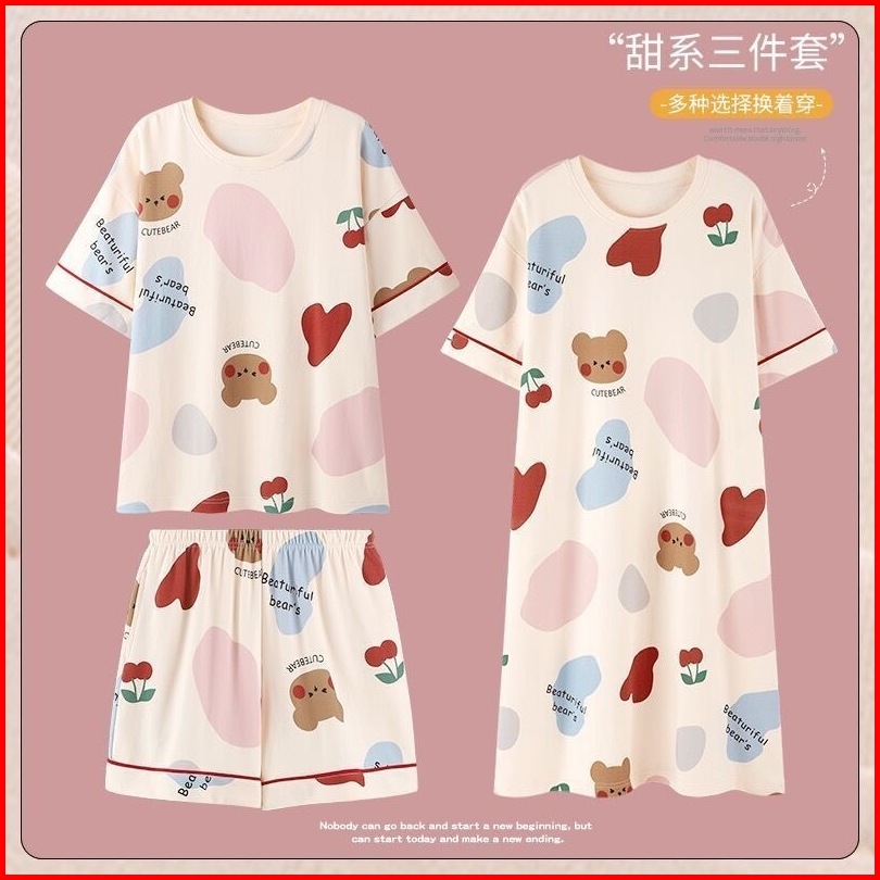 Lovera Baju Tidur 3in1 Piyama Dewasa Serba Nyaman Model Daster Dan Set Celana Pendek Desain Modis Dengan Motif Menawan