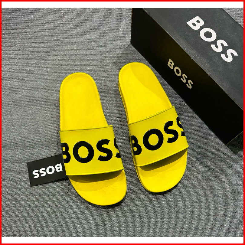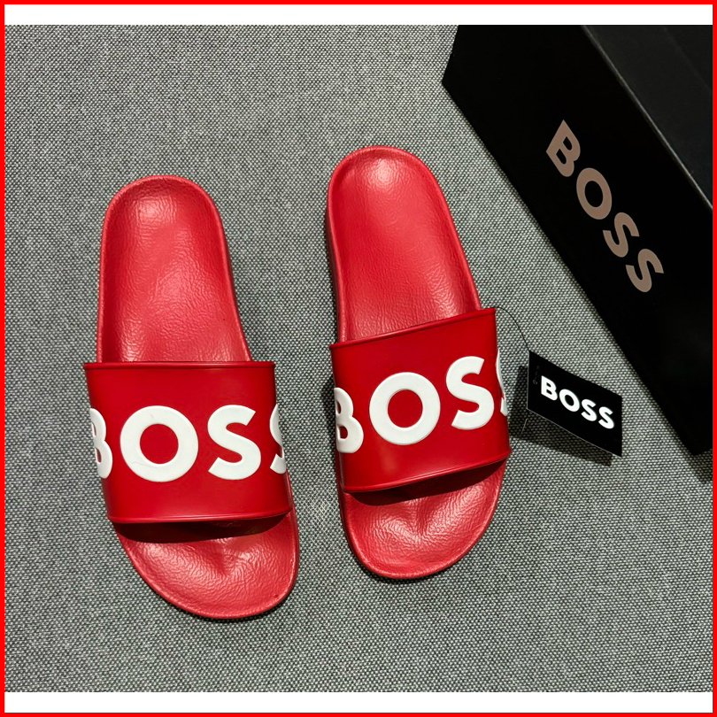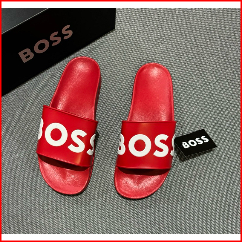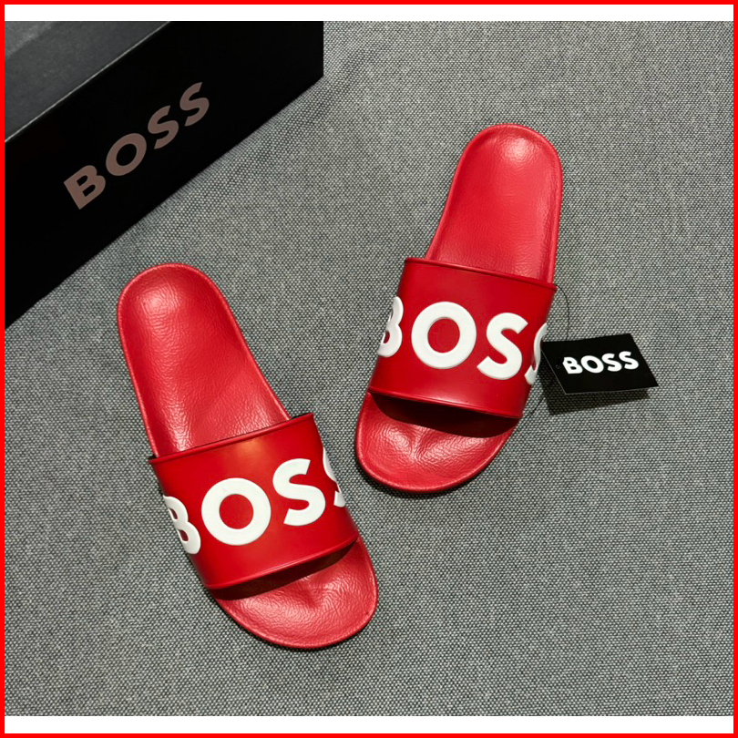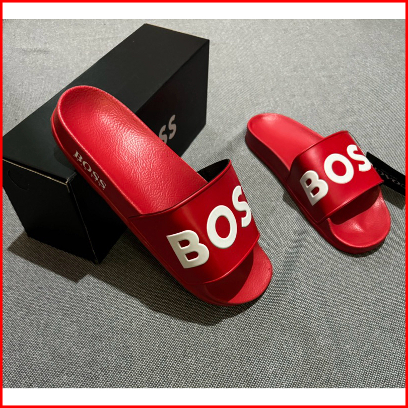 Sandal Slip On Premium Thebos Merah Tulisan Putih Fre Boxs