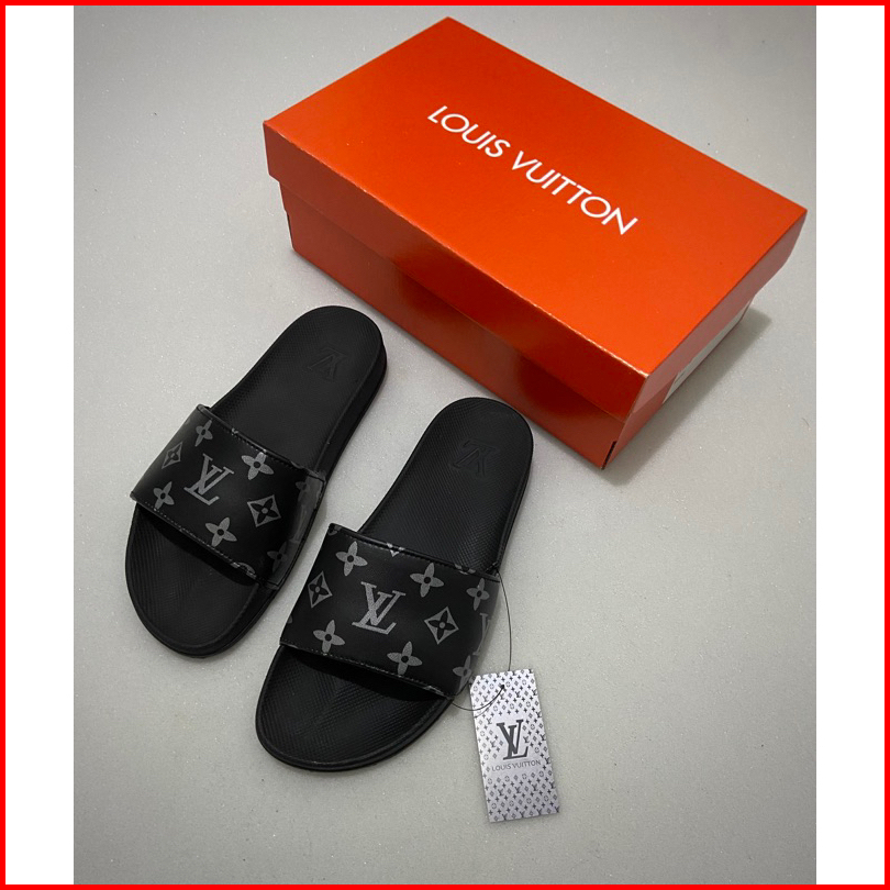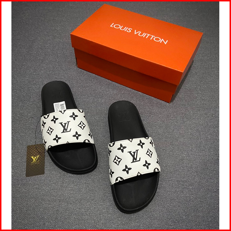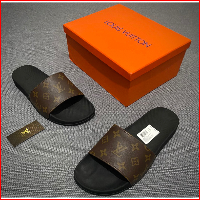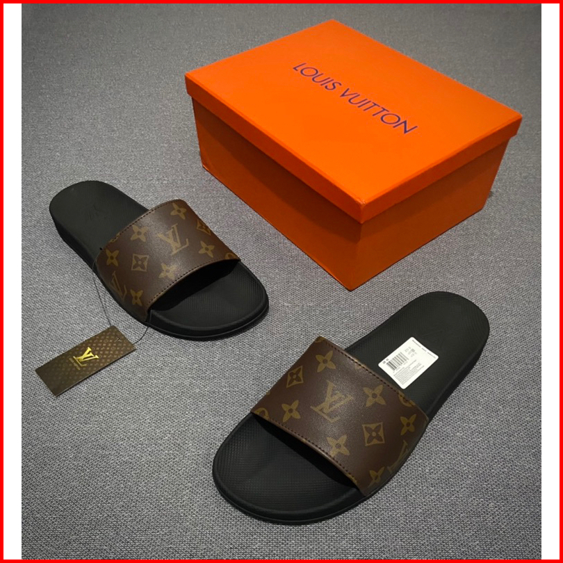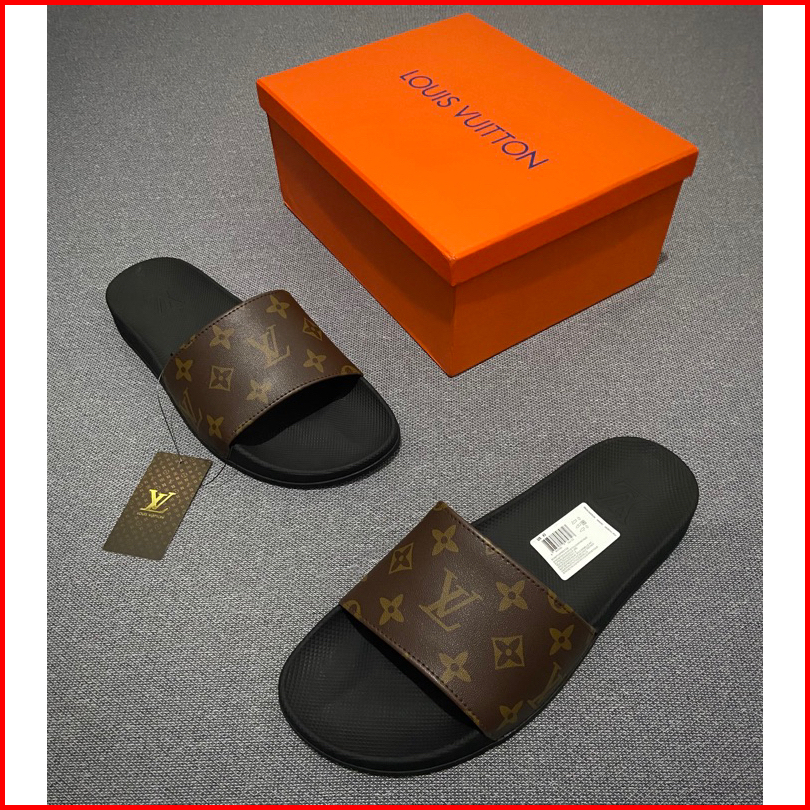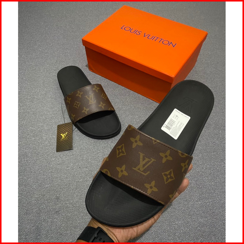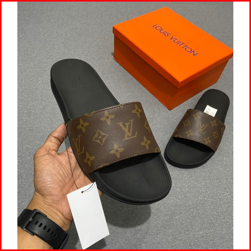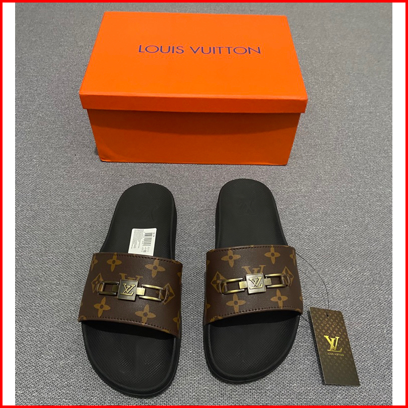 Sandal Slip-on Premium L Vong Asesoris Logo Besi Coklat List Crem Free Boxs