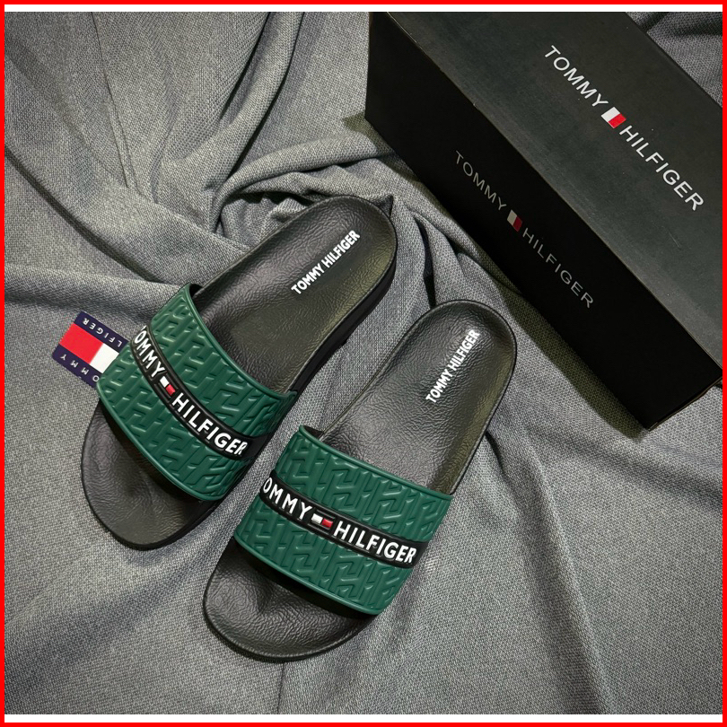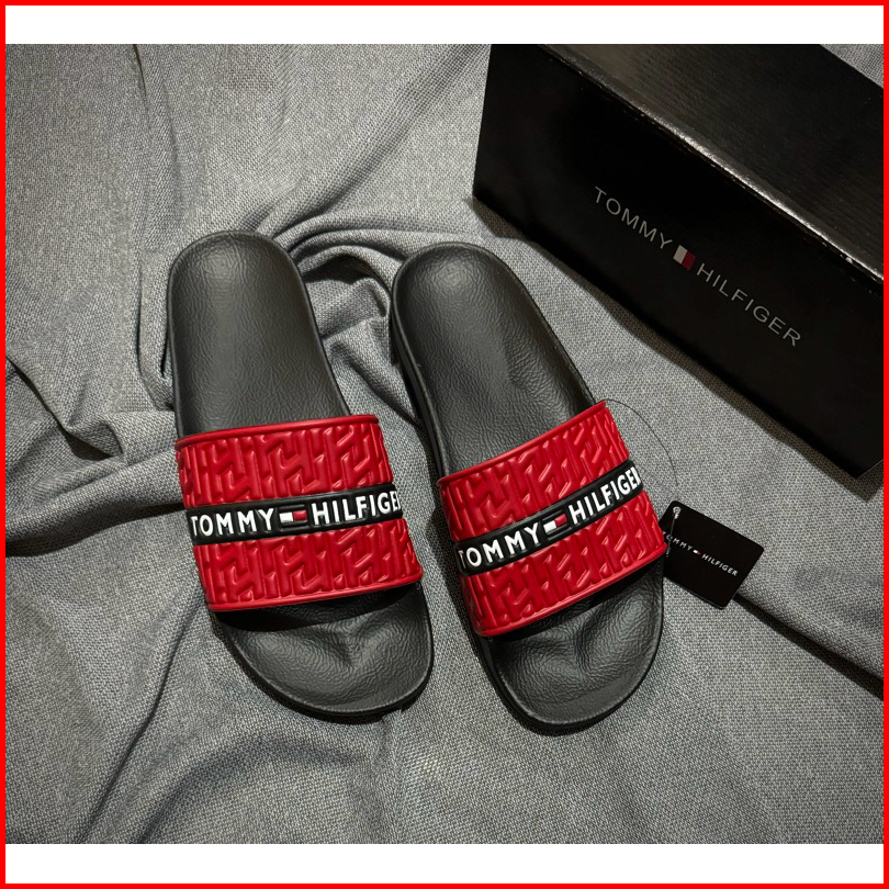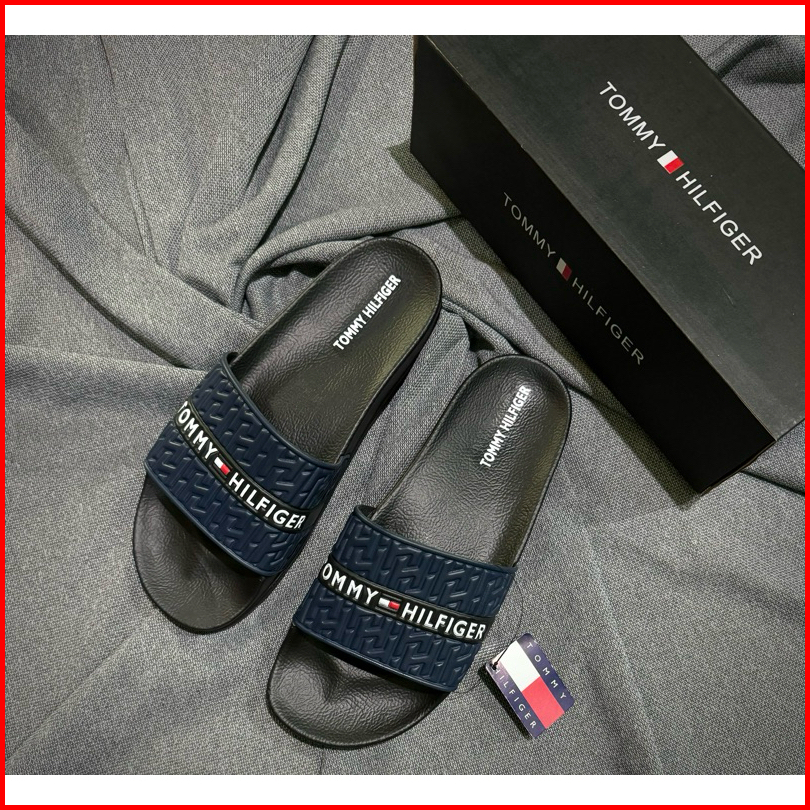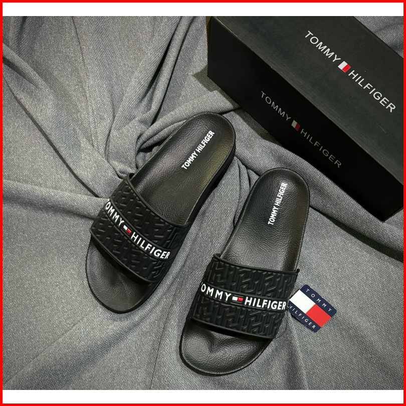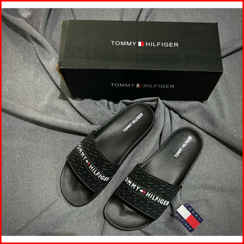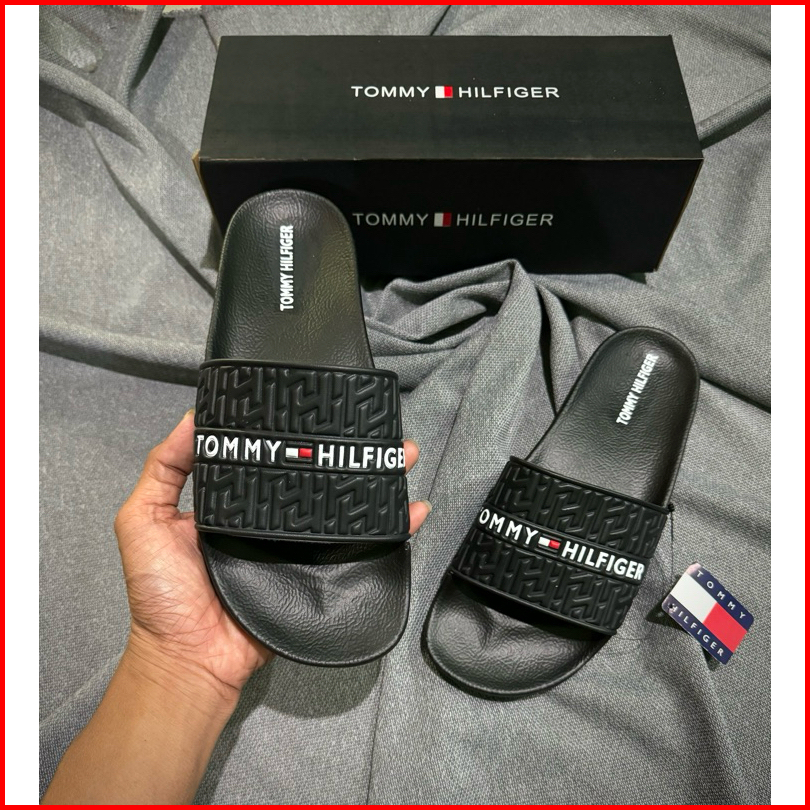 Sandal Slip On Premium Tomihilfiger Motif Embos Hitam Lis Putih Fre Boxs