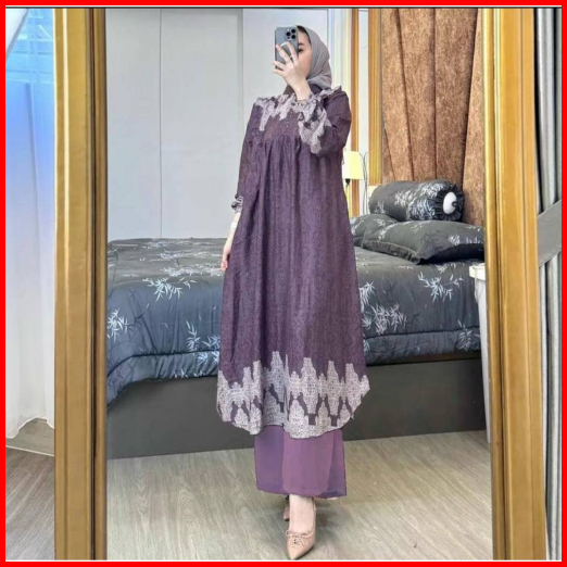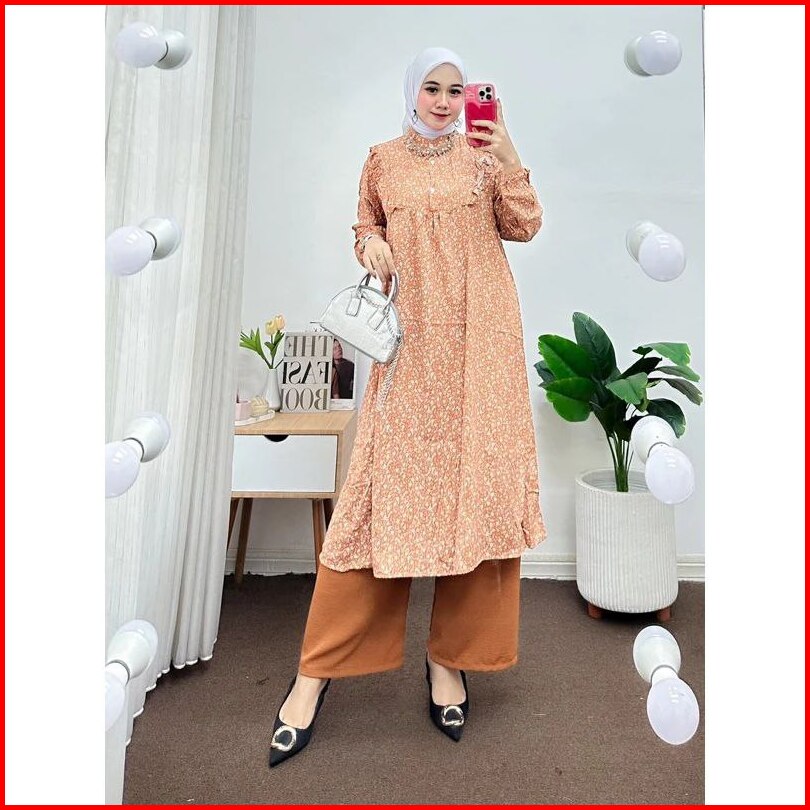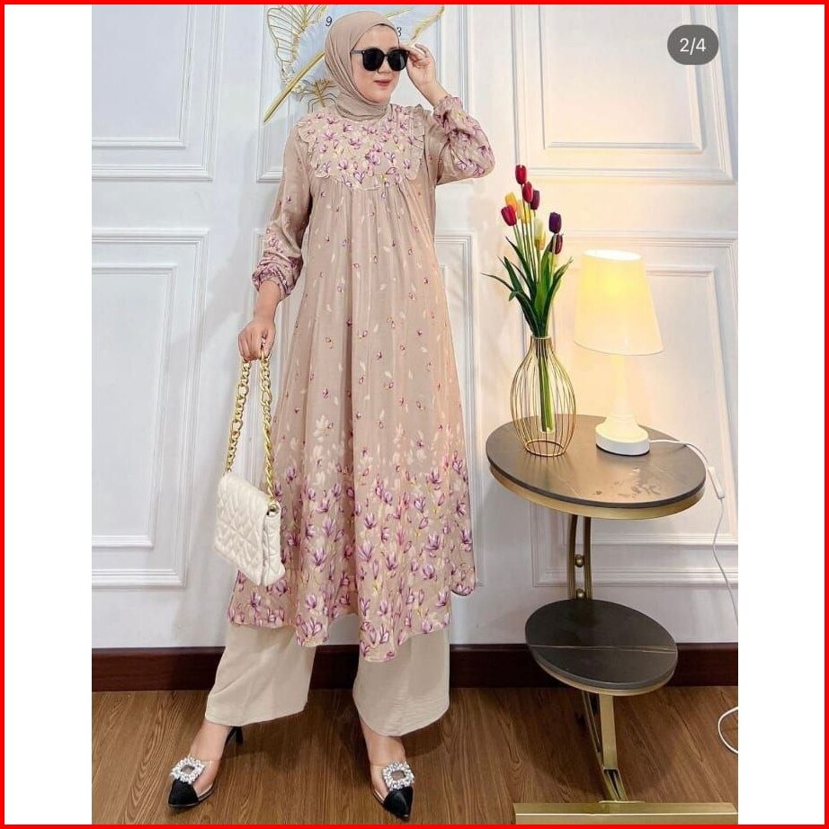 Setelan Panjang Muslim Wanita Atasan Tunik Long Oneset Celana Kulot One Set Kekinian Motif Bunga Terbaru Matt Rayon Prem