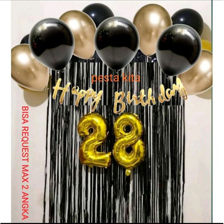 DEKORASI ULANG TAHUN PERNAK PERNIK ULANG TAHUN DEKOR ULTAH PAKET DEKORASI ULANG TAHUN 1 TIRAI HITAM 1 BANNER LATIN 2 AN