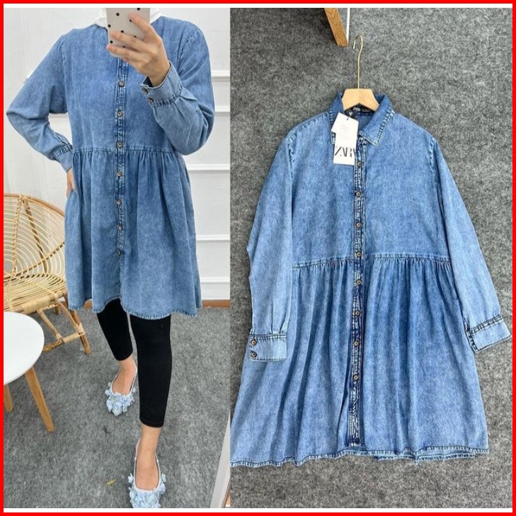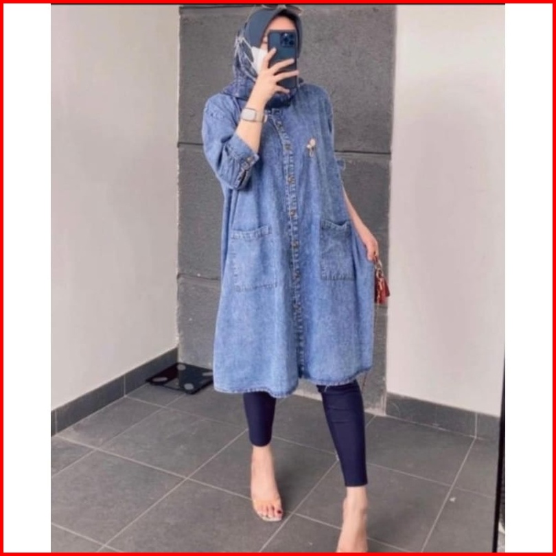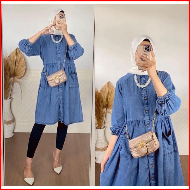 Adeline Tunik Wanita Jeans Wash Long Tunik Midi Dress Denim Dodia