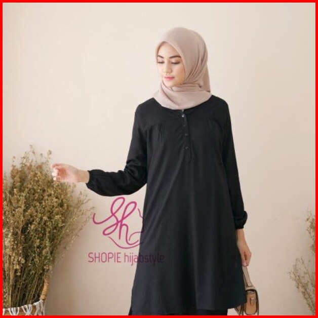 Tunik Rayon Polos Hitam Wanita Lengan Panjang Bahan Adem Atasan Muslim Busui Friendly Lengan Karet