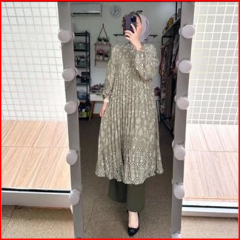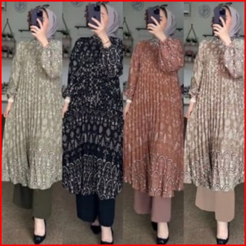 New Oneset Long Tunik Plisket Kamila Setelan Tunik Panjang Wanita Oneset Jumbo Lengan Panjang