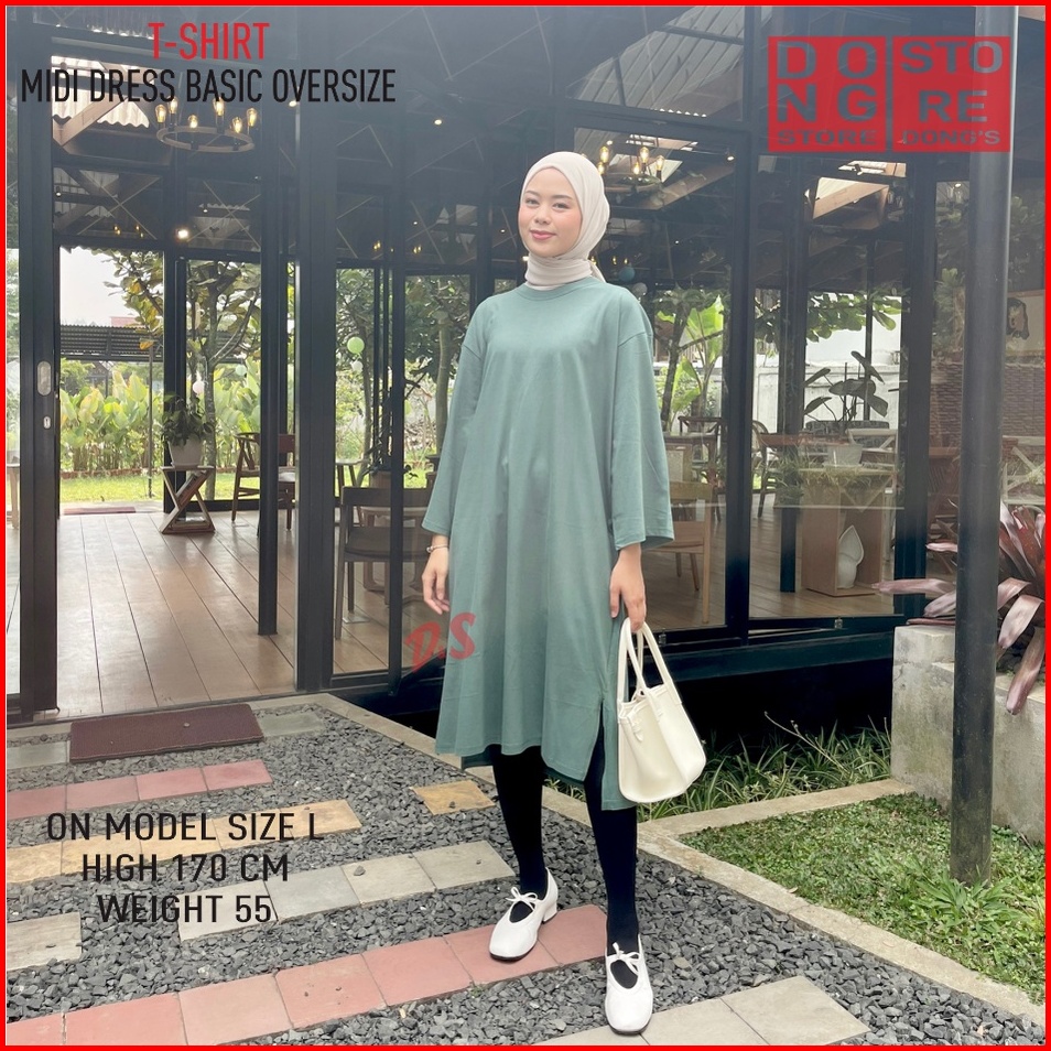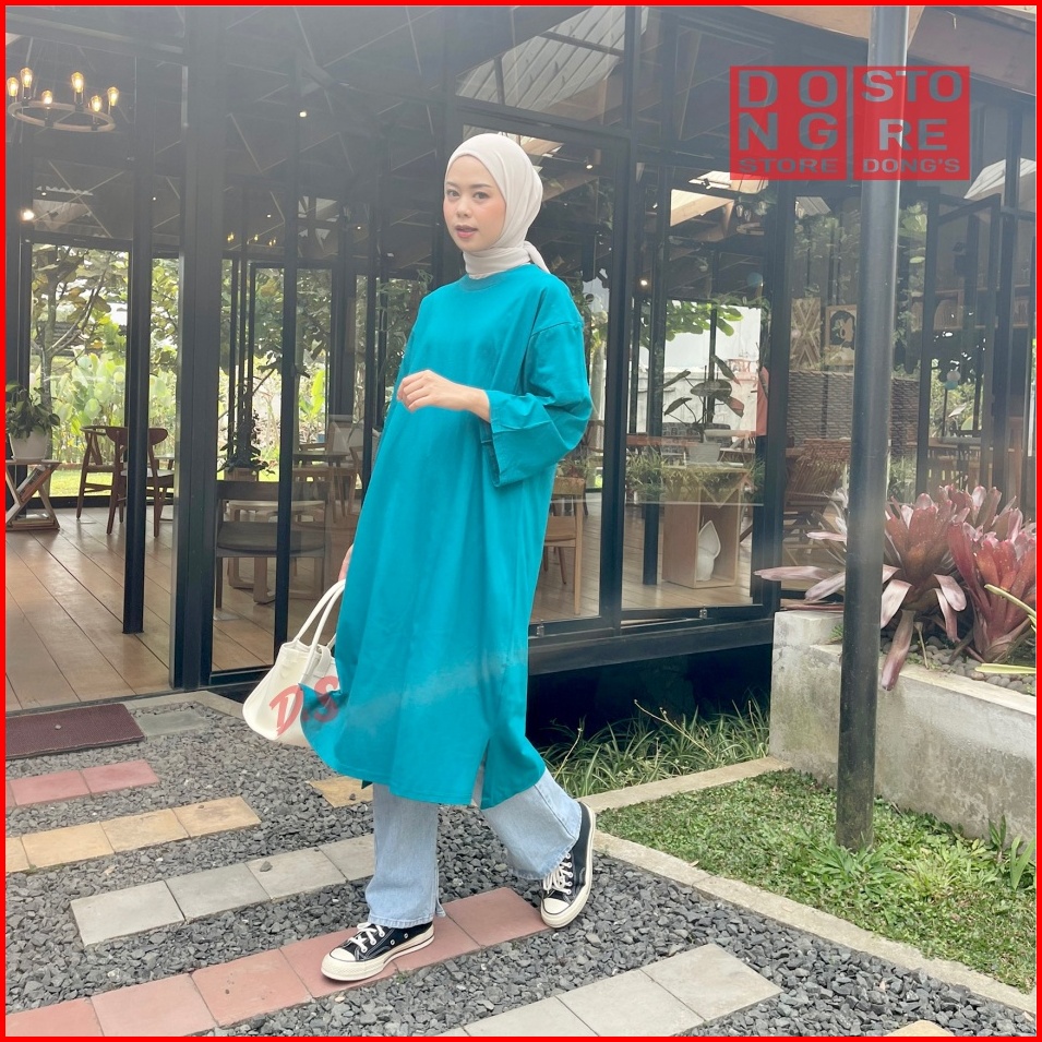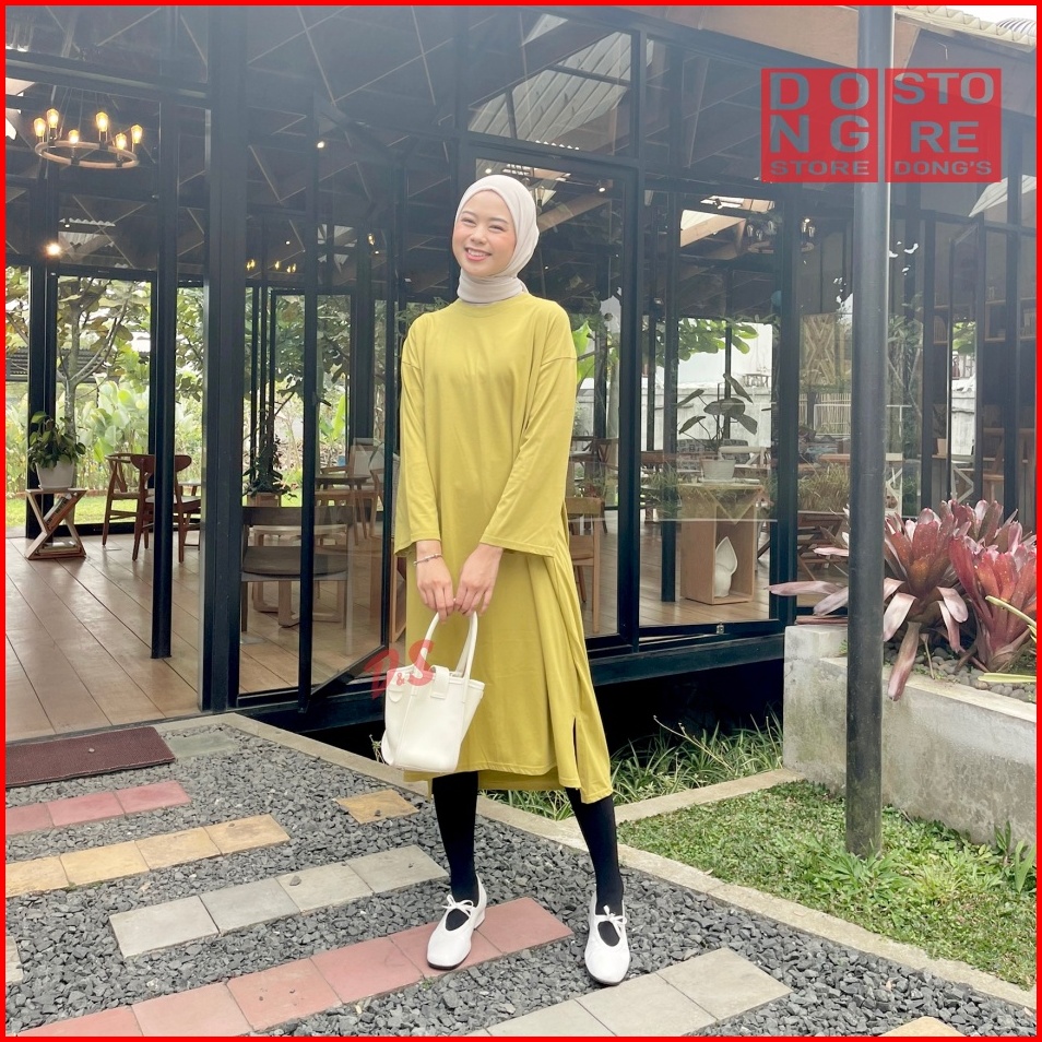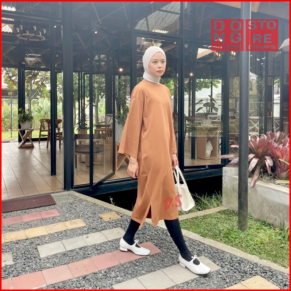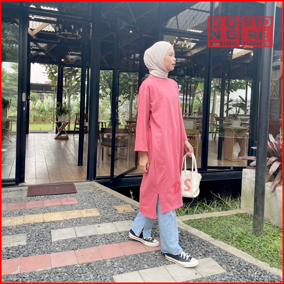 Kaos Polos Tunik Wanita Tshirt Midi Long Dress Baju Muslim Oversize Belah Samping High Slits Cotton Combad 24s Premium
