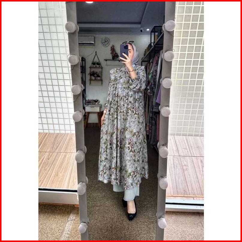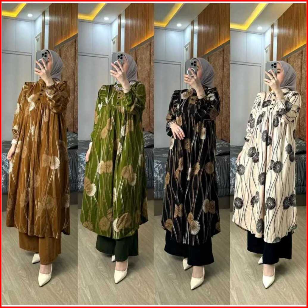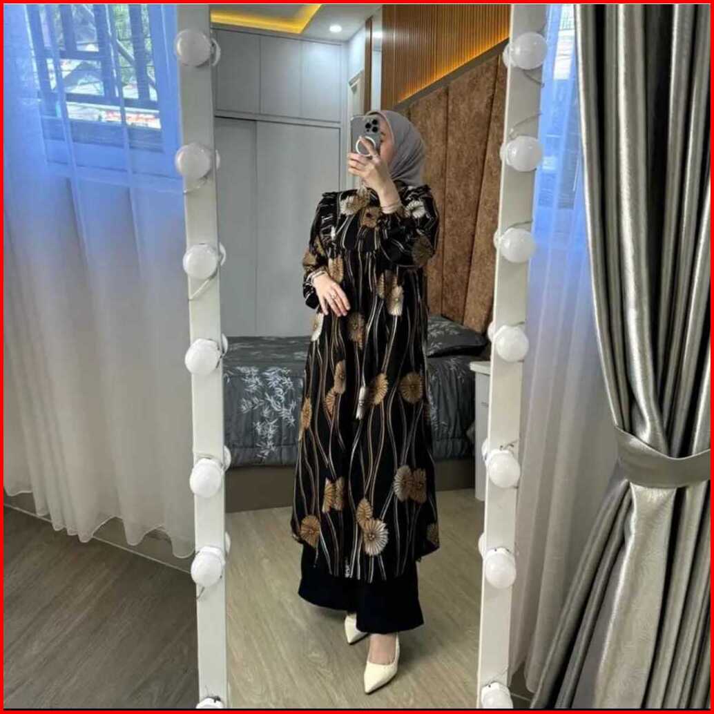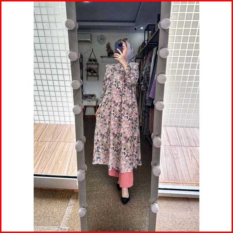 Amel - Setelan Monica Hasna Oneset Midi Long Tunik Rayon Celana Cringkle Busui Freindly Jumbo