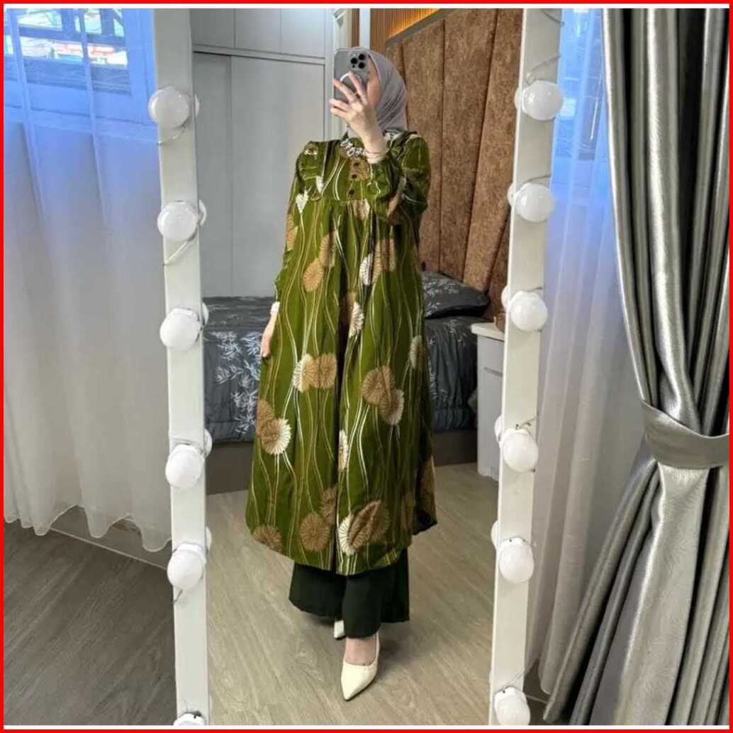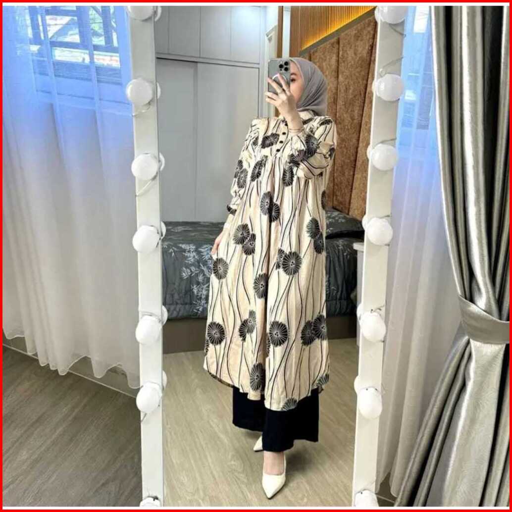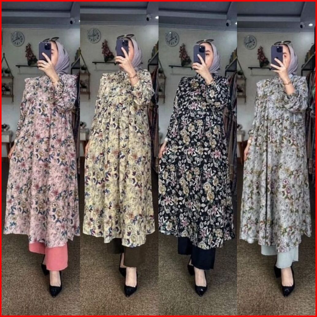 Amel - Setelan Monica Hasna Oneset Midi Long Tunik Rayon Celana Cringkle Busui Freindly Jumbo