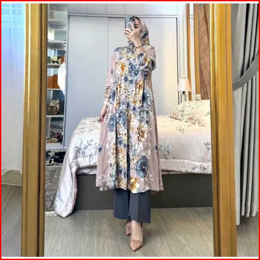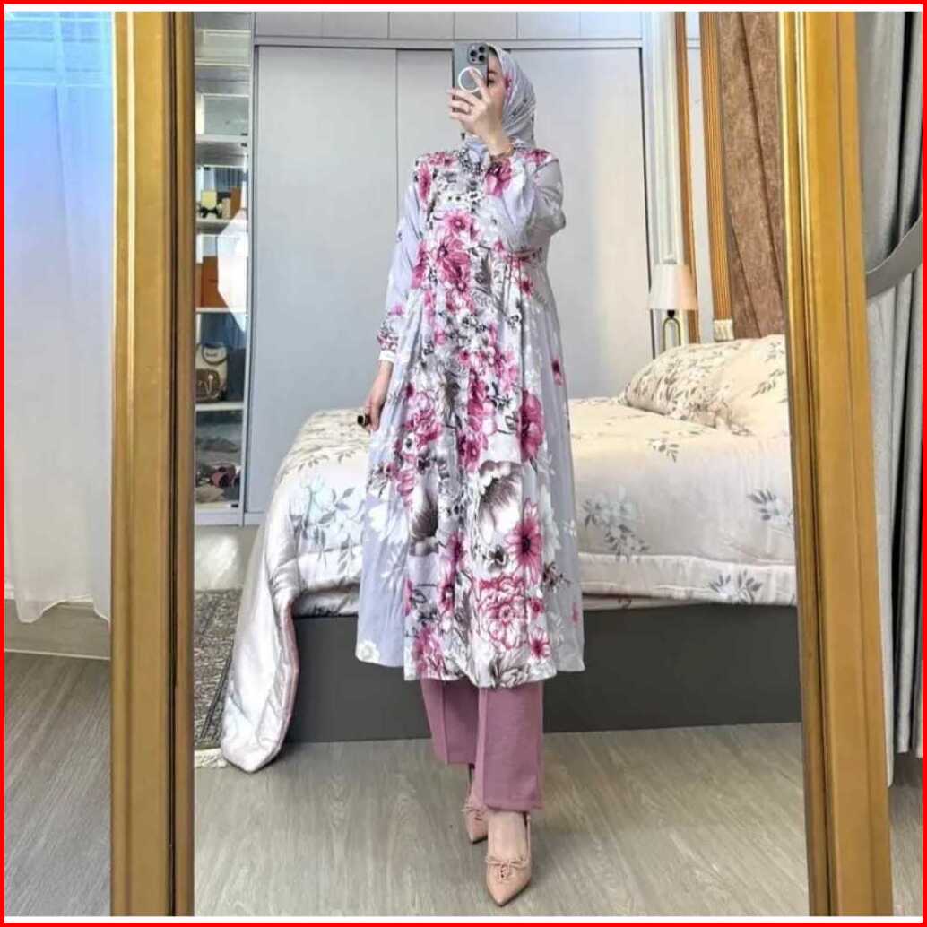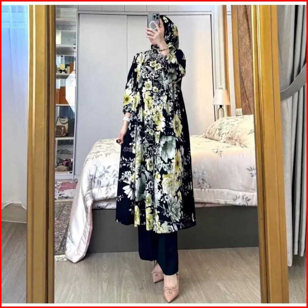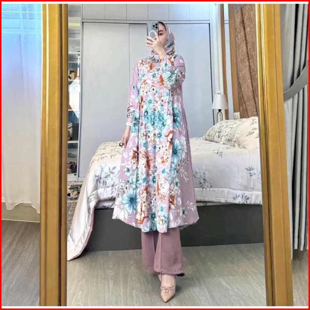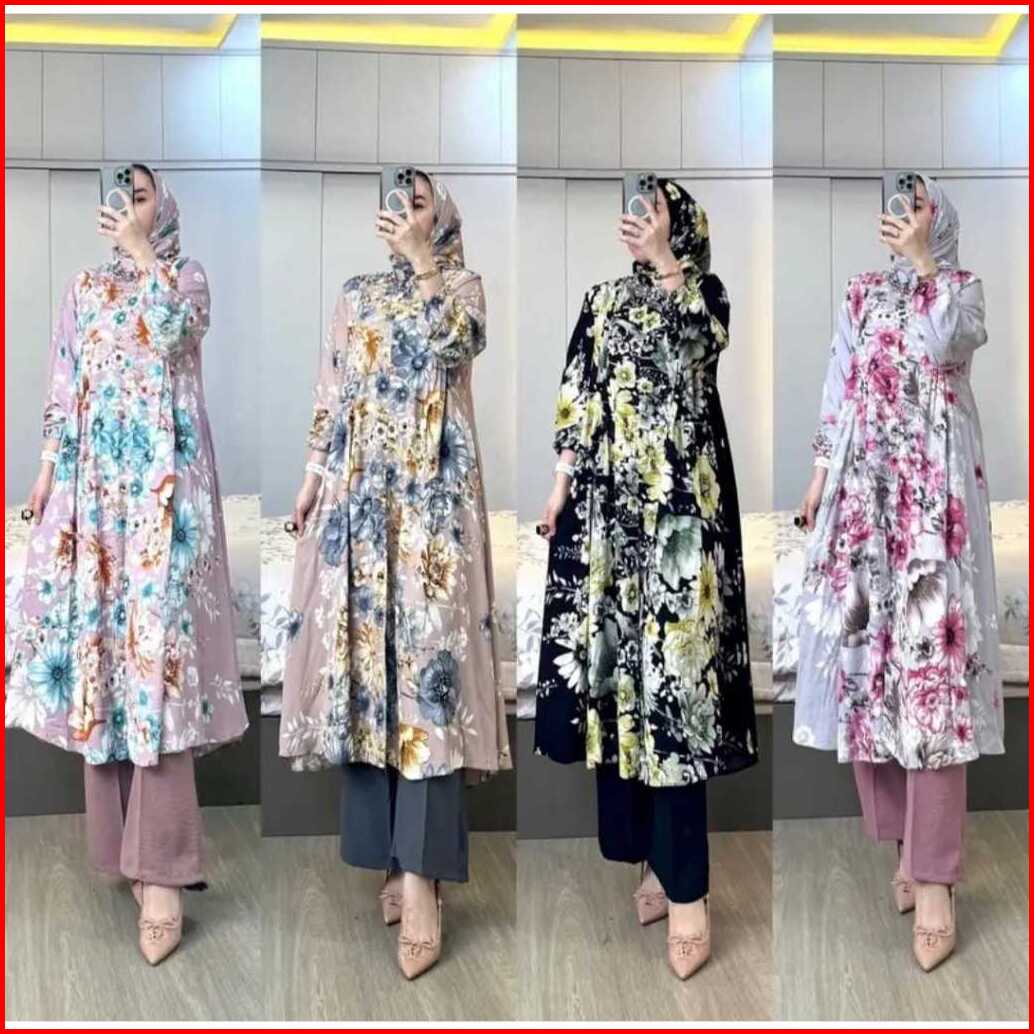 Amel - Setelan Florist Set Hijab Long Tunik Rayon Diamond Celana Cringkle Premium Busui Freindly Jumbo