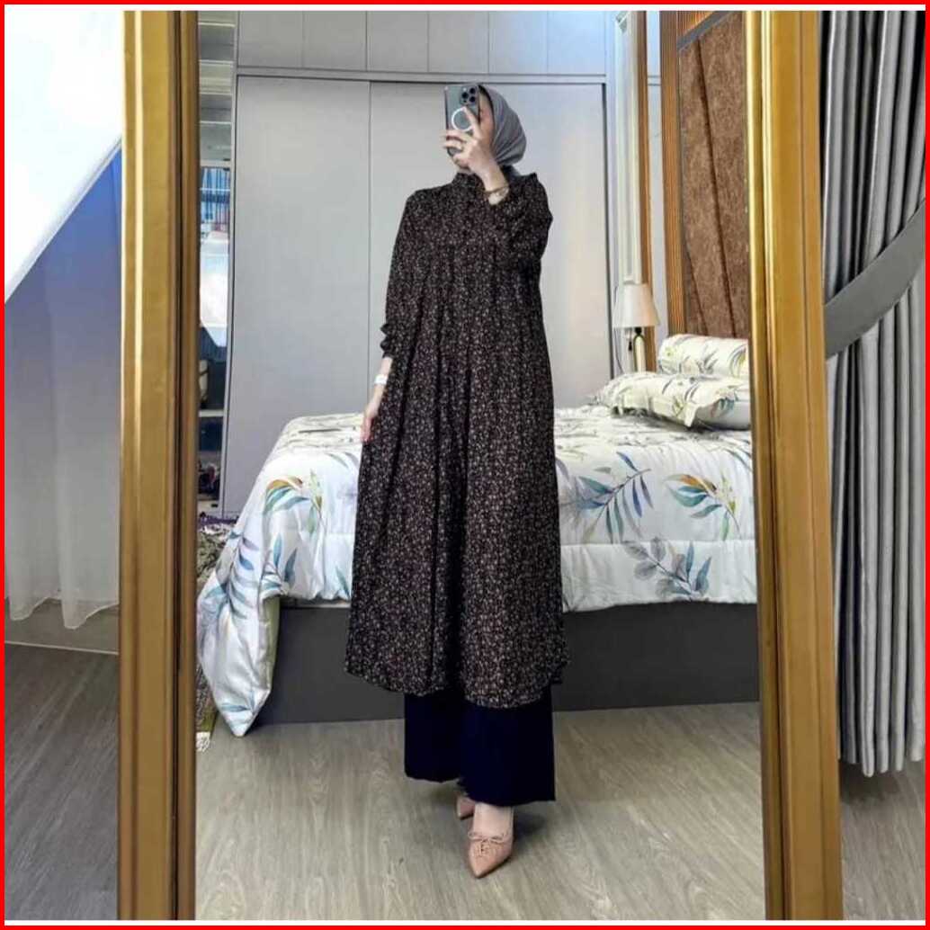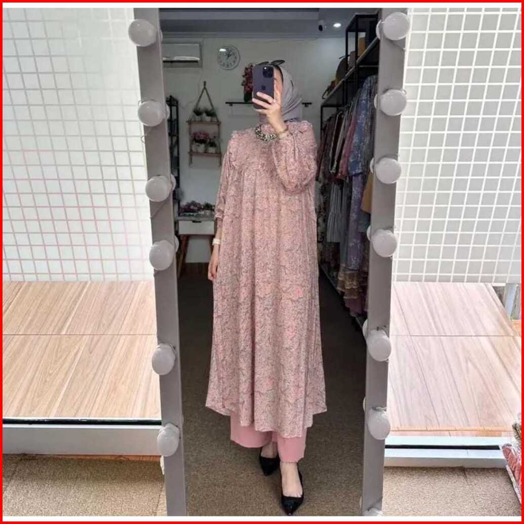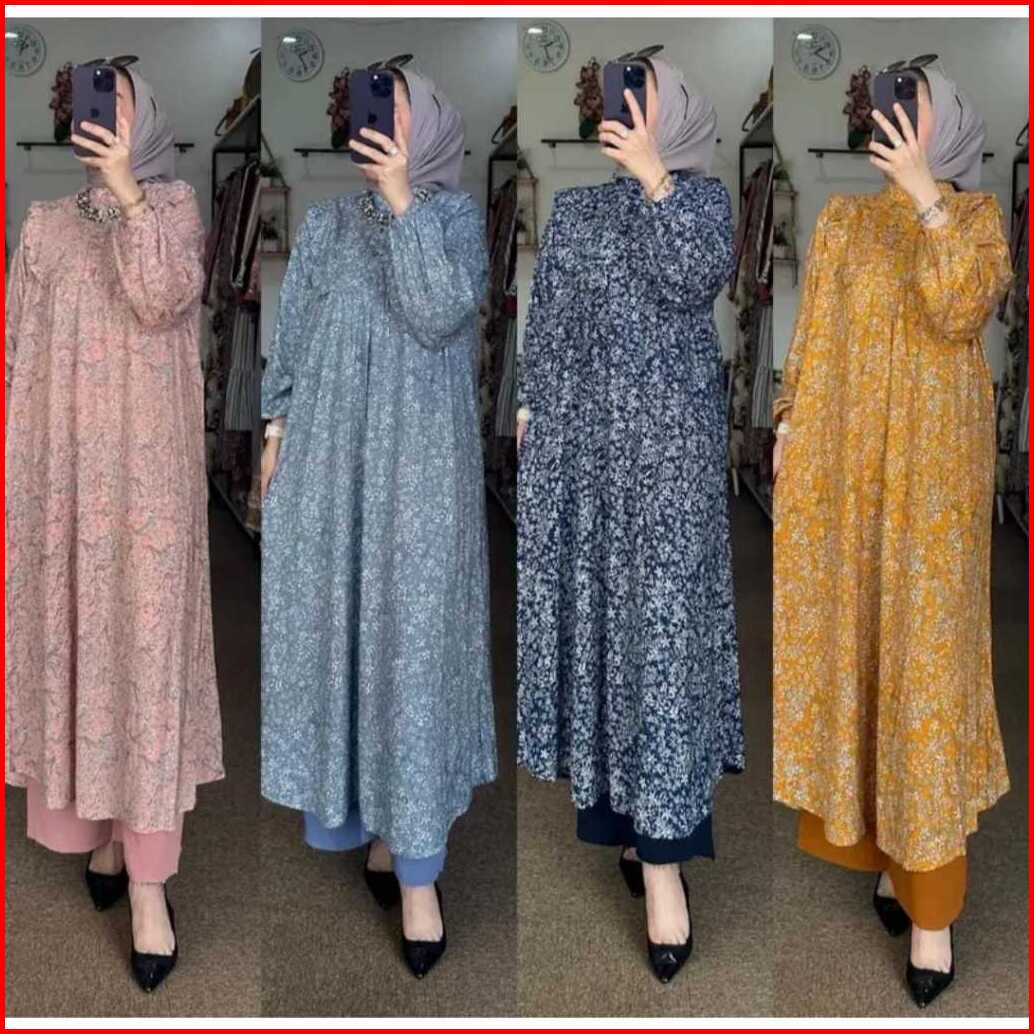 Amel - Setelan Sakura Oneset Long Tunik Rayon Diamond Celana Cringkle Premium Busui Freindly Jumbo