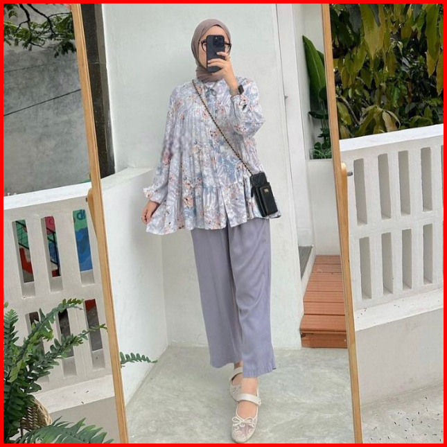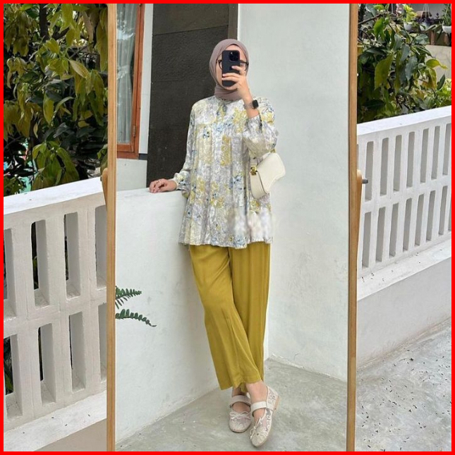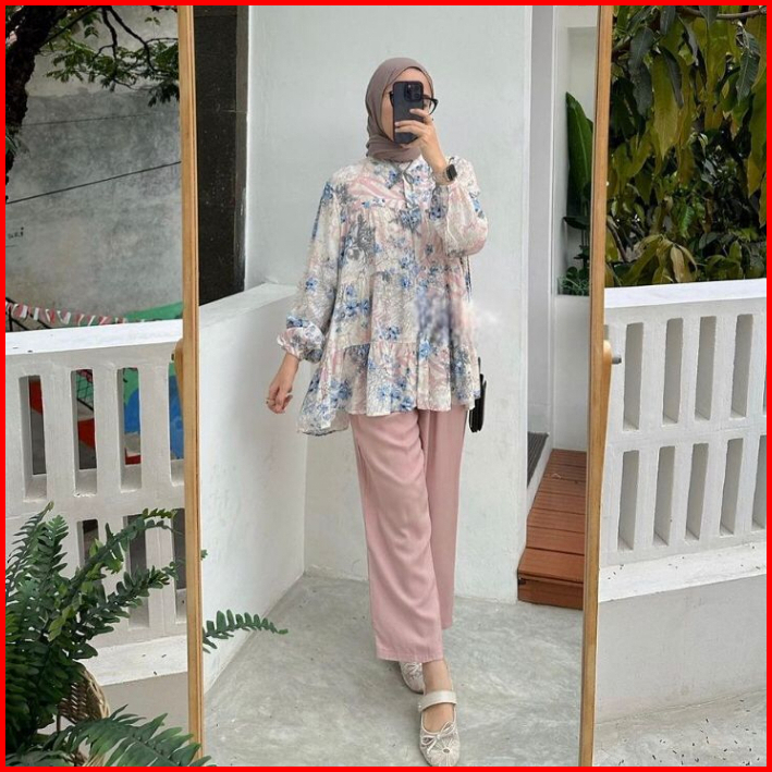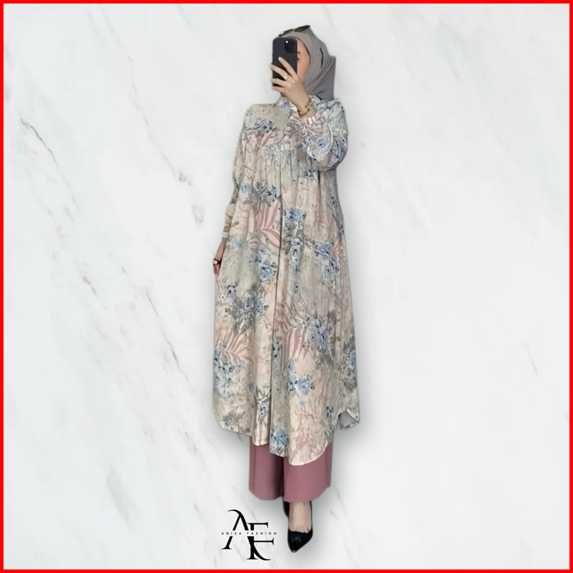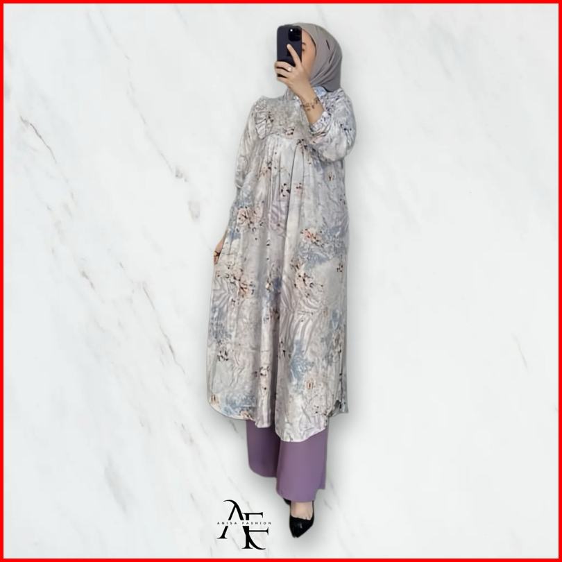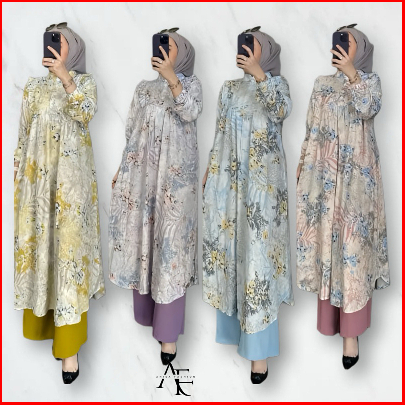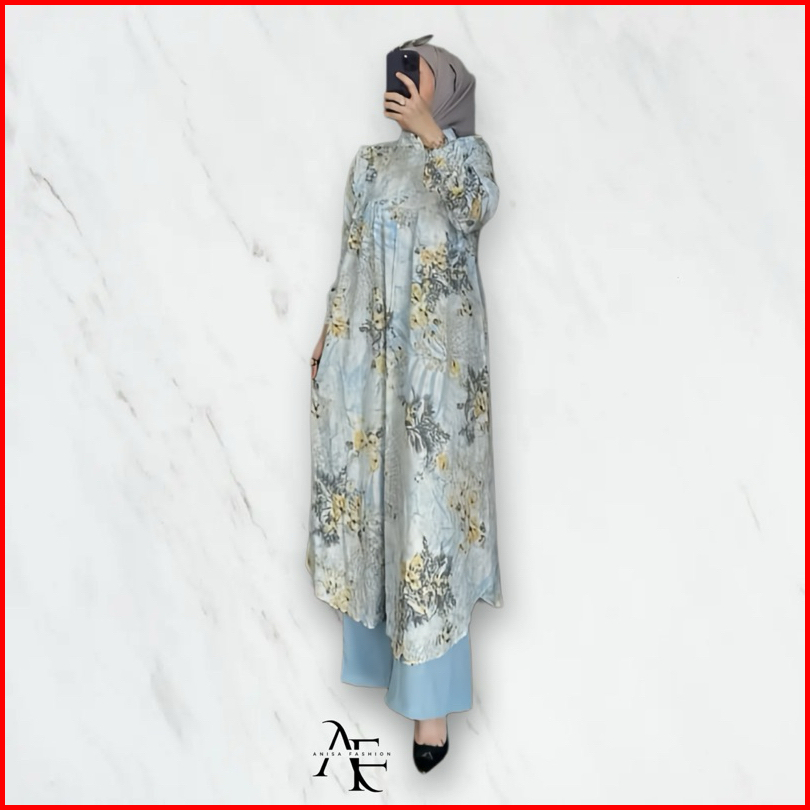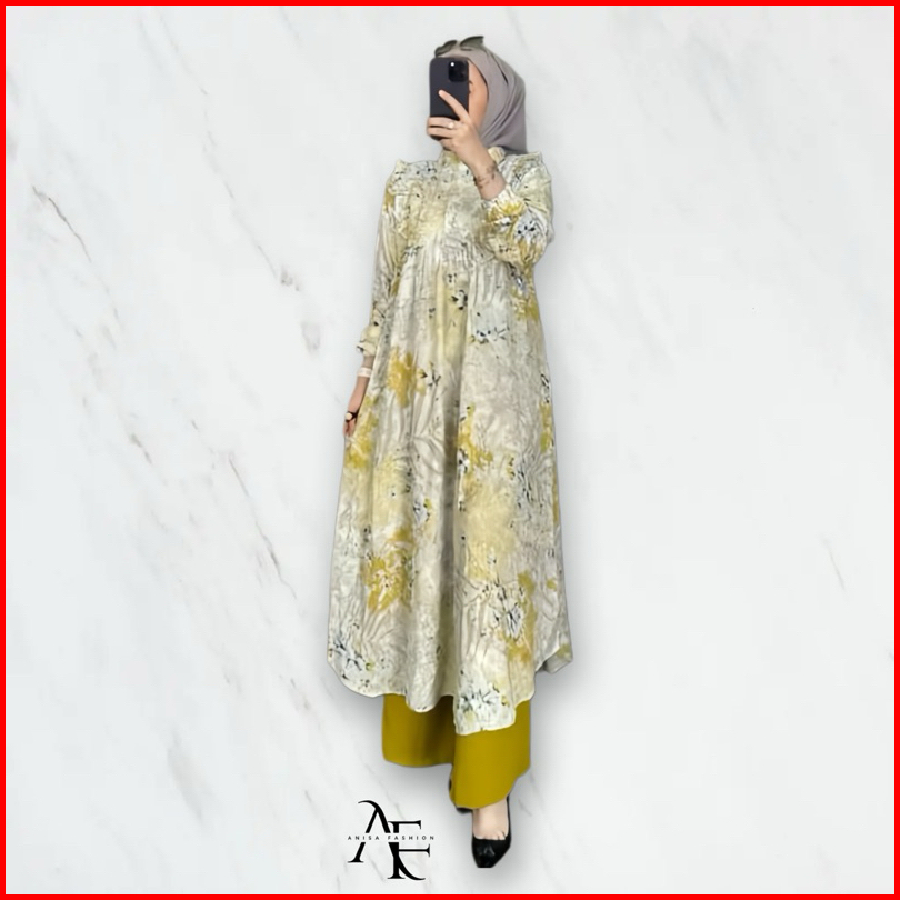 One Set Aluna Long Tunik Rayon - Setelan Tunik Rayon Motif Bunga New Celana Crinkle Premium - One Set Wanita Terbaru