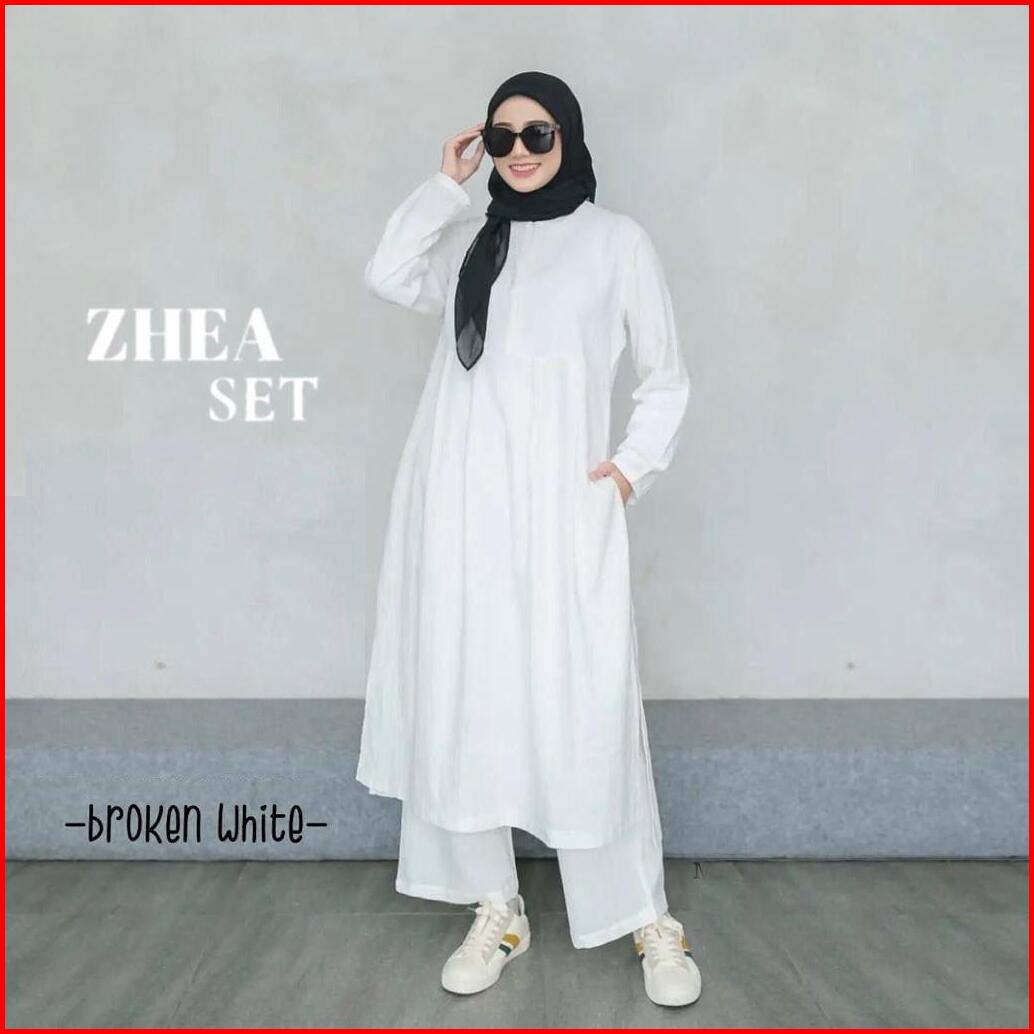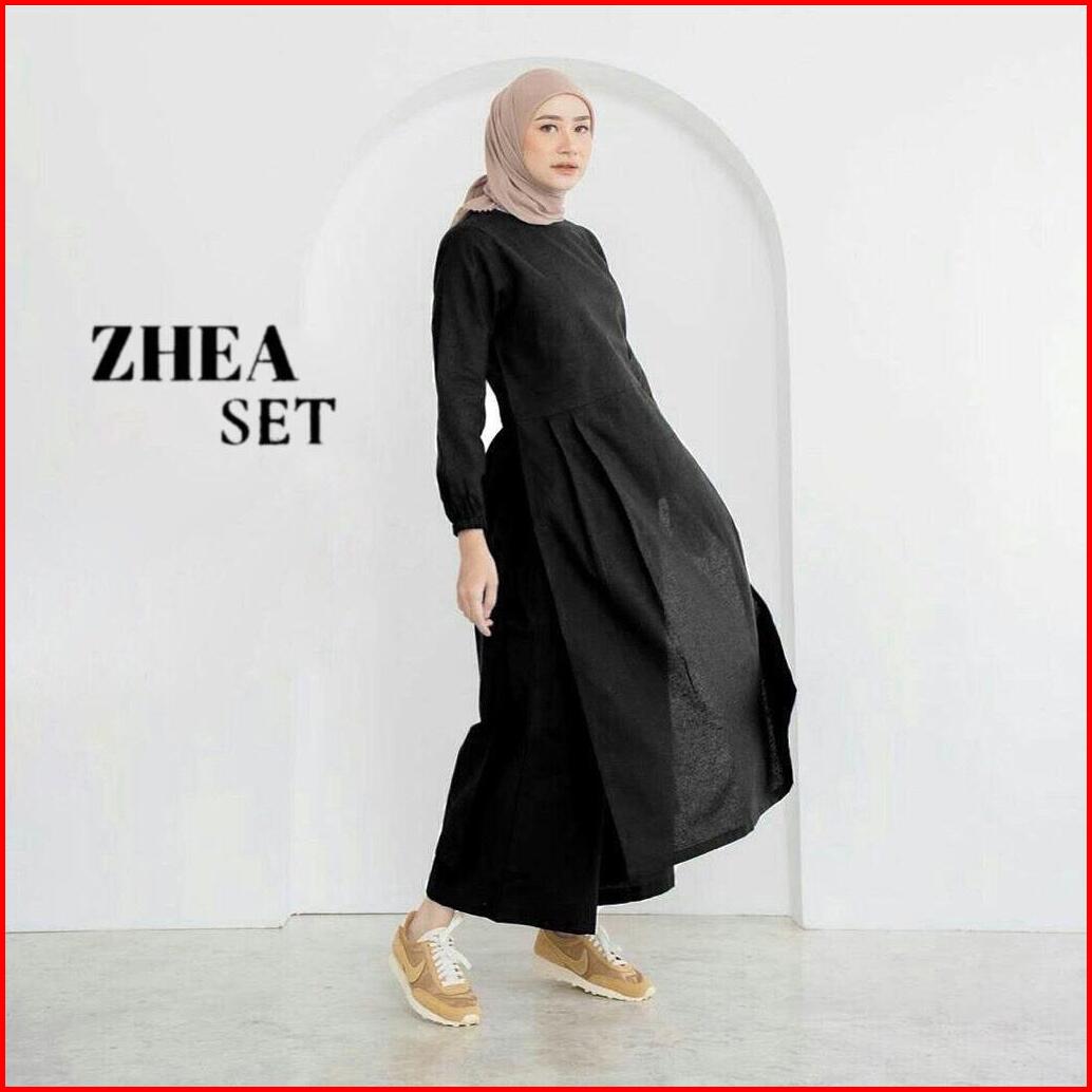 Zhea Setelan Long Tunik Celana Kulotbahan Katun Linen Fashion Muslim One Set Set Wanita Kekinian