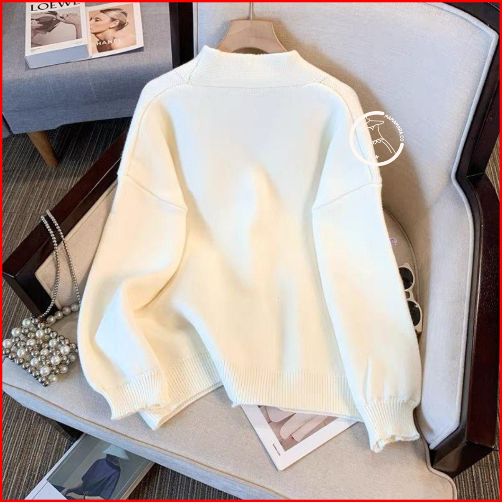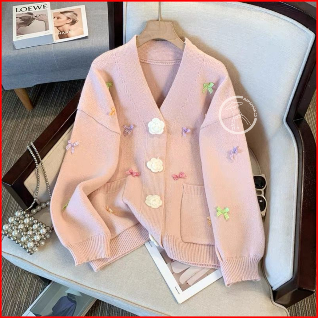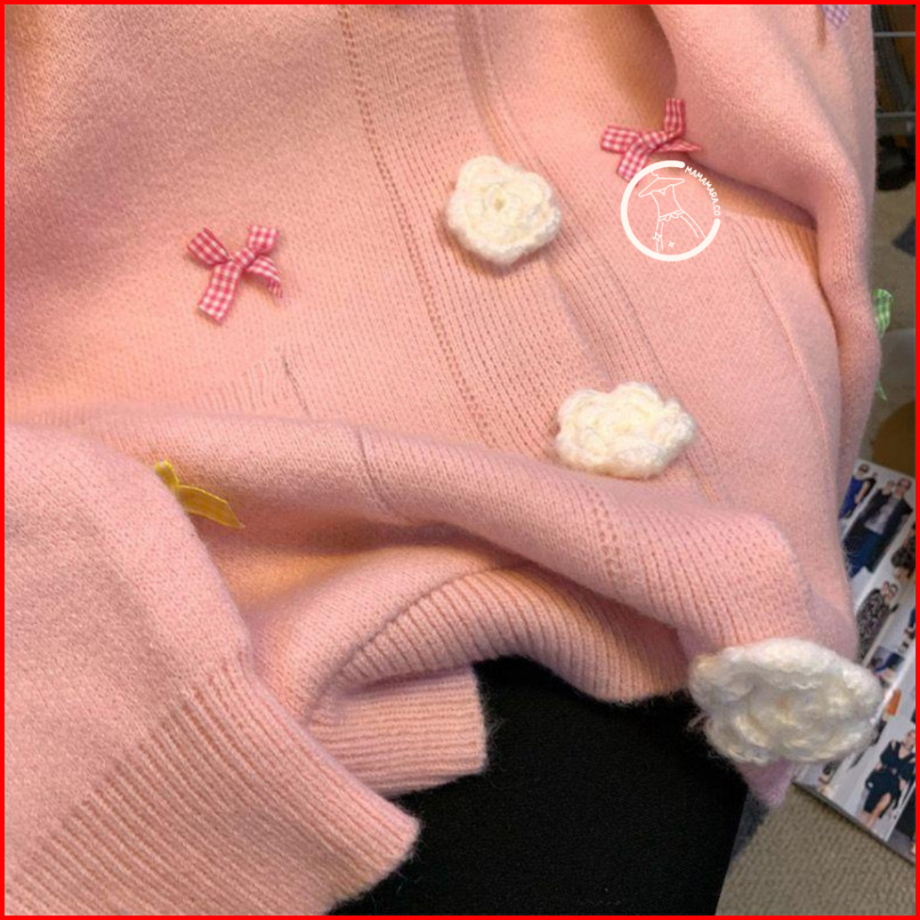 Mamamara - Cardigan Rajut Pinky Pastel Lembut Oversized Bunga Pita V-neck Santai Wol