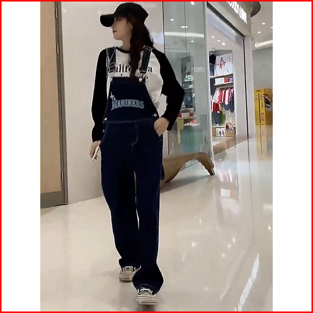 Jumpsuit Denim Wanita Berwarna Biru Tua Dengan Bordir Huruf-huruf