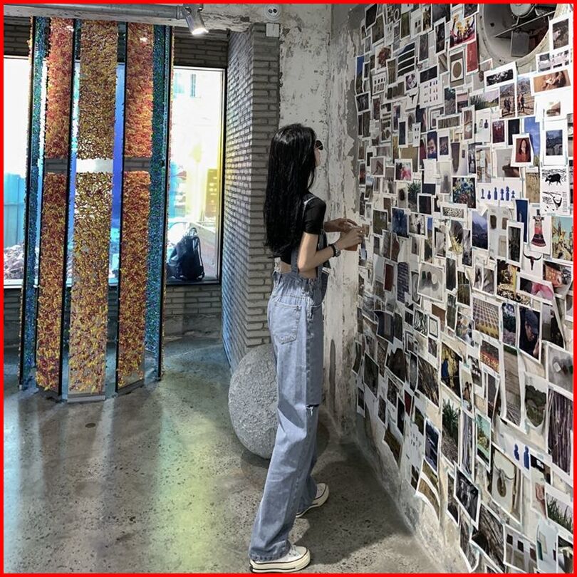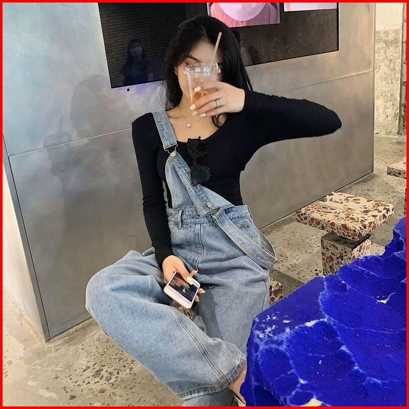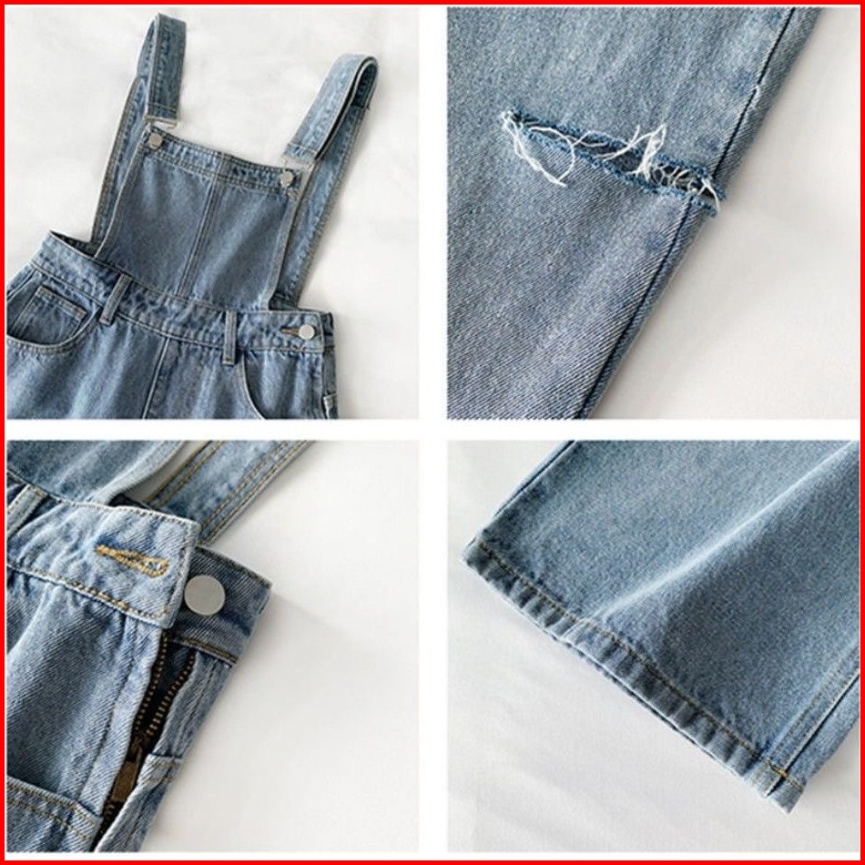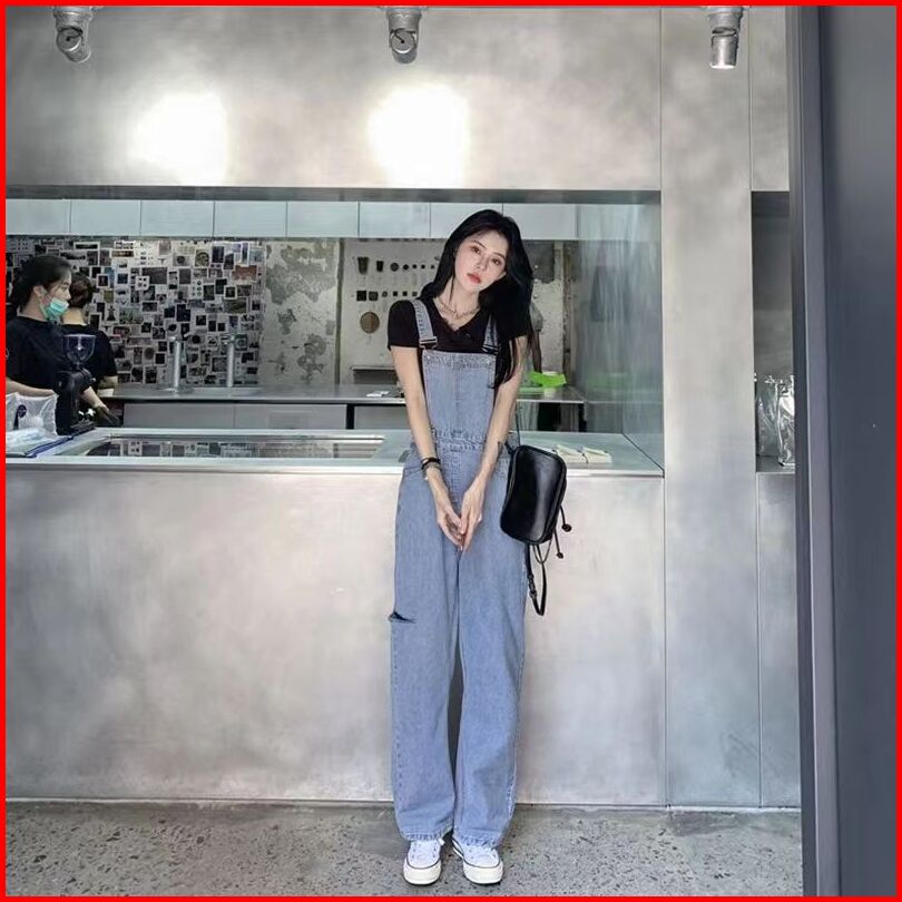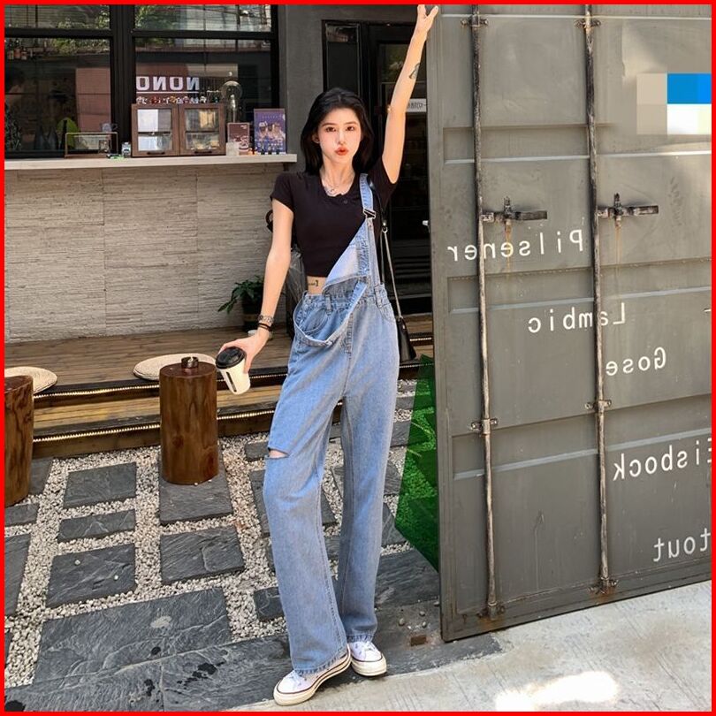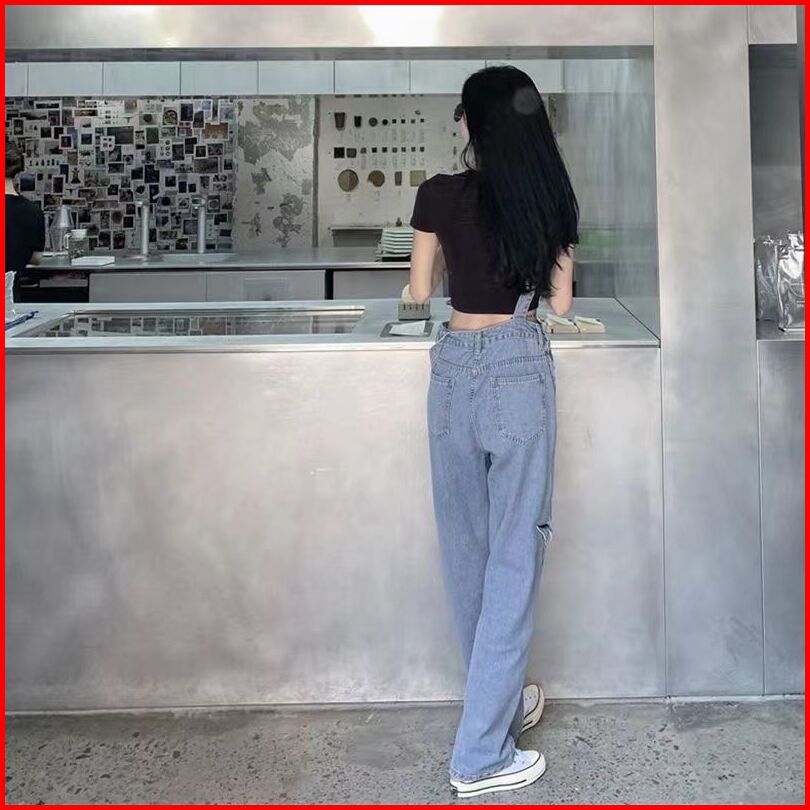 Celana Dungaree Wanita Berwarna Biru Muda Dengan Lobang