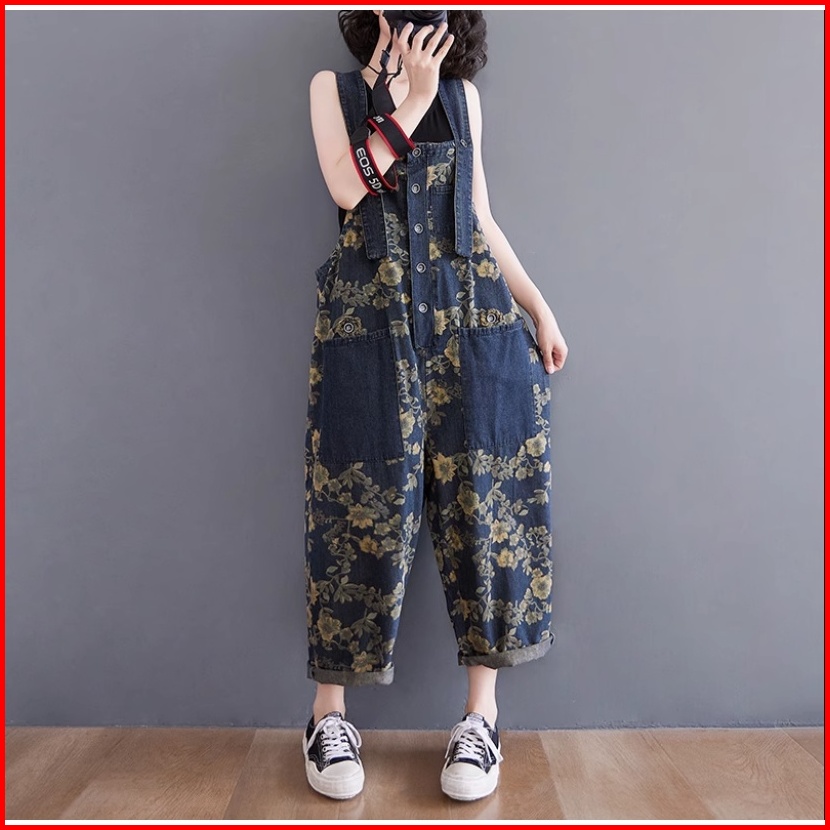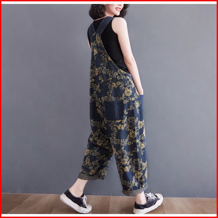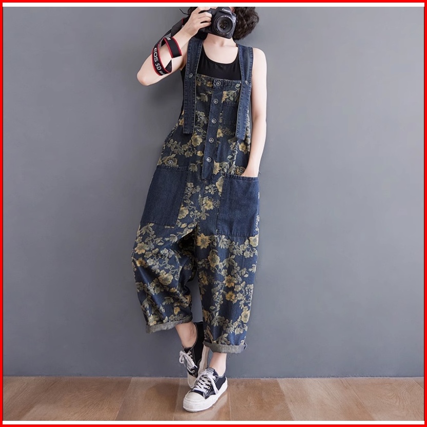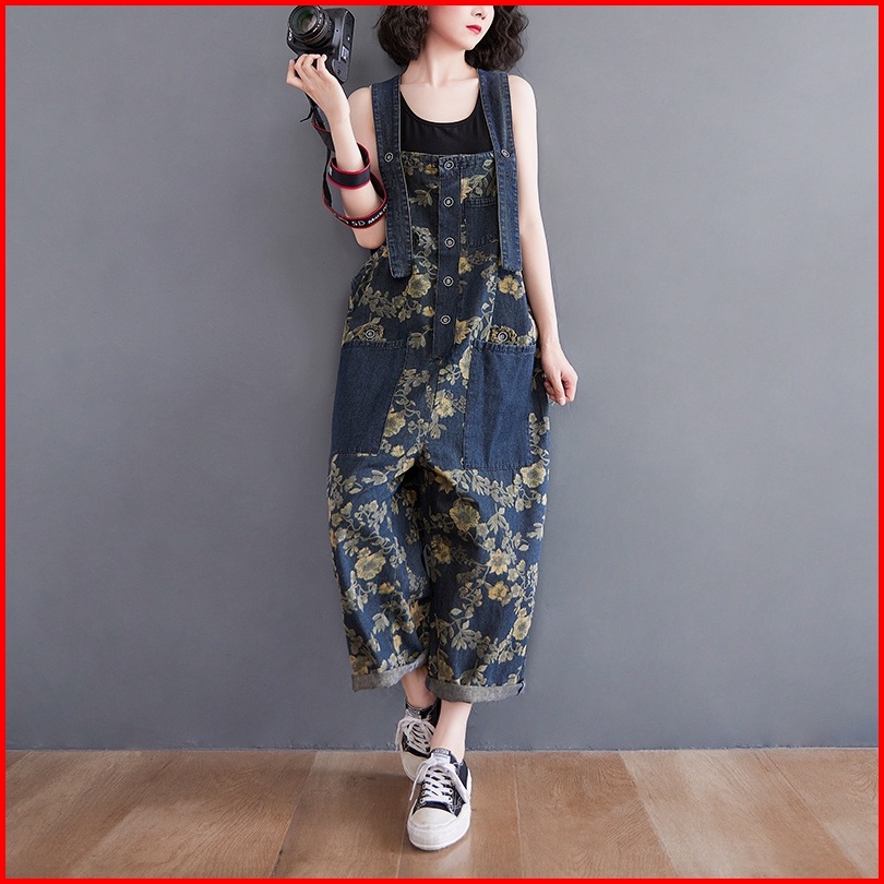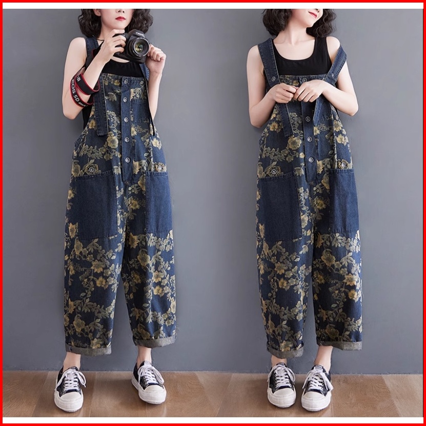 Lc214 Oversized Jumpsuit Jeans Floral Motif Bunga Fashion Retro Terbaru