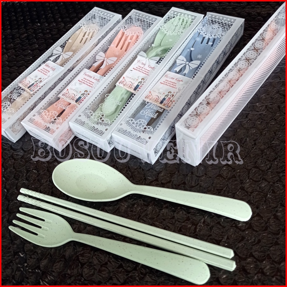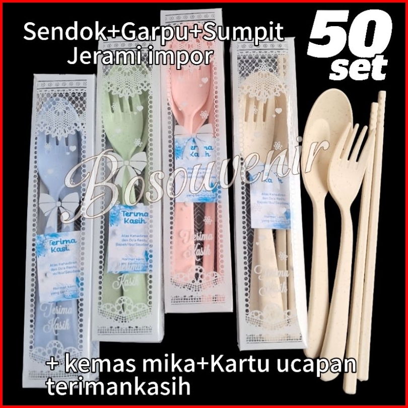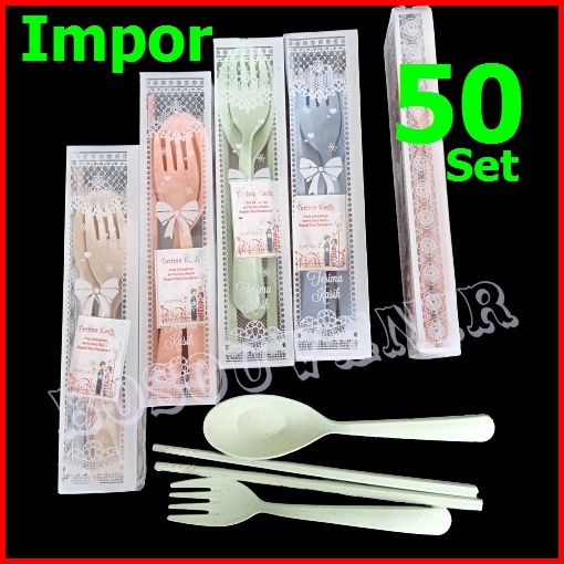 Isi 50 Set Souvenir Sendok Garpu Sumpit Travel Jerami Impor Mika Motif