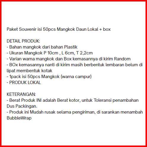 Souvenir Mangkok Daun Plastik Isi 50 Pcs