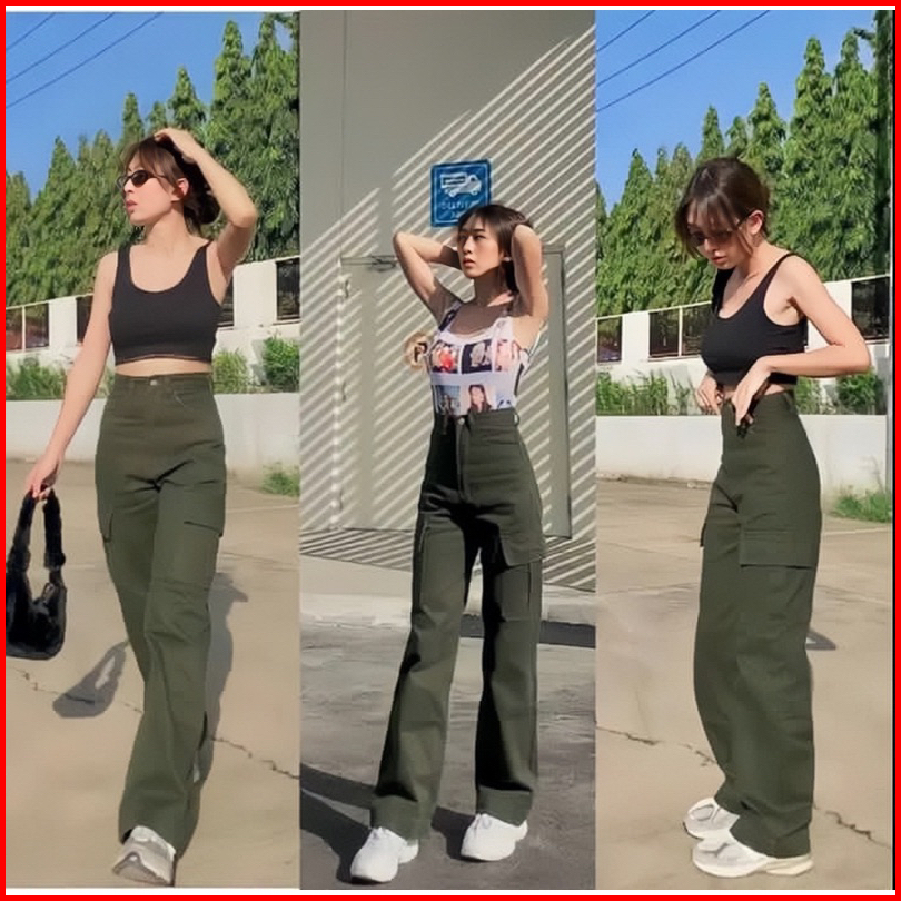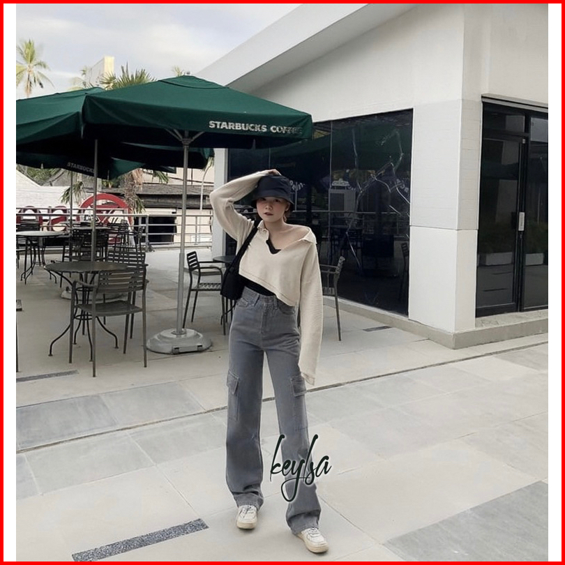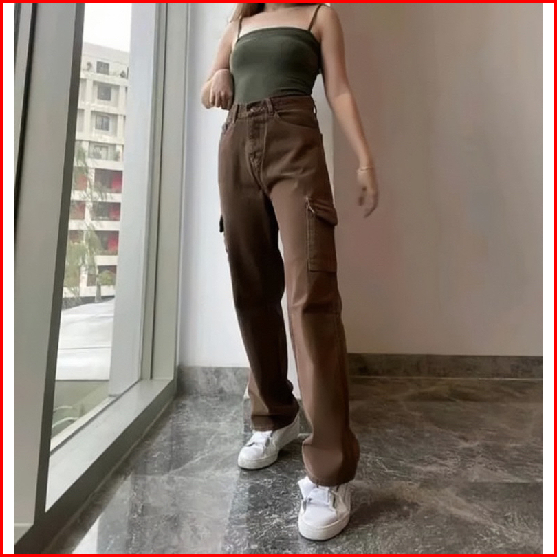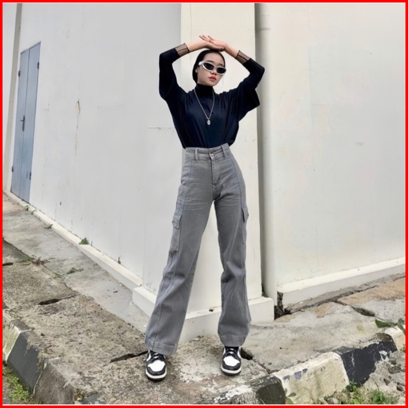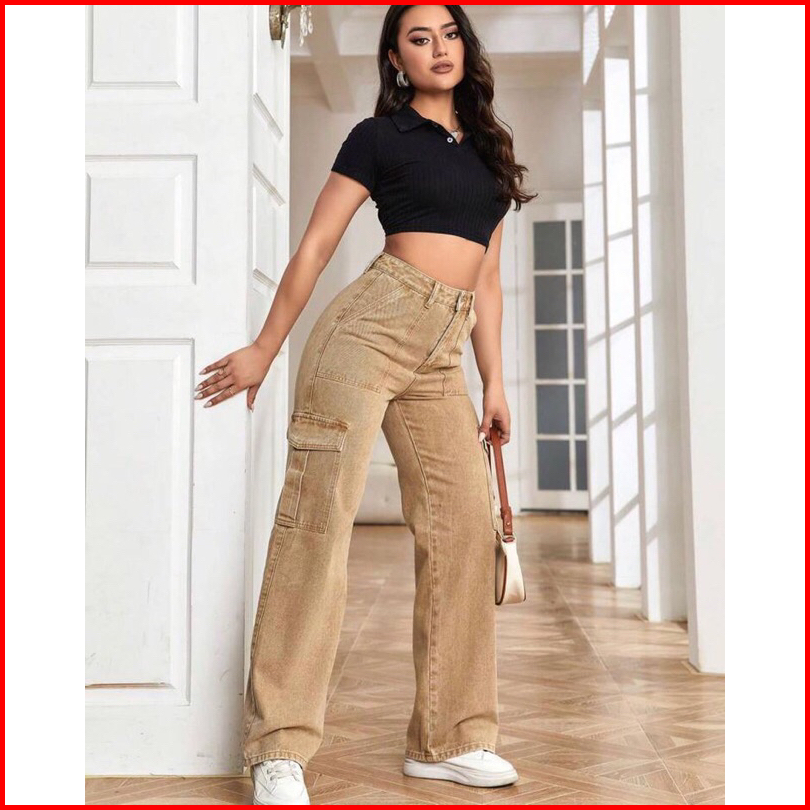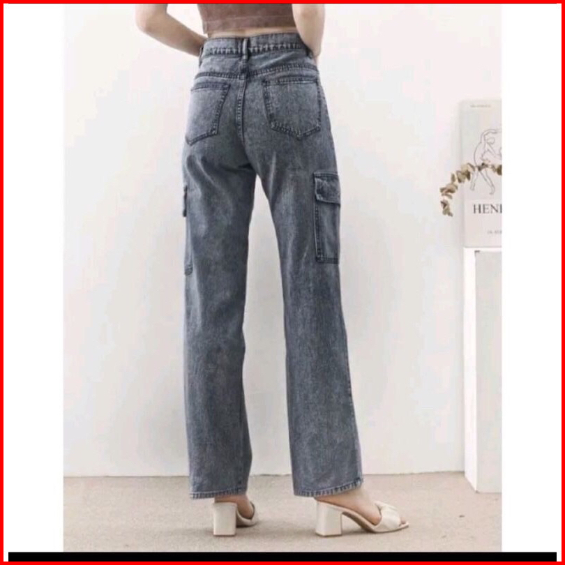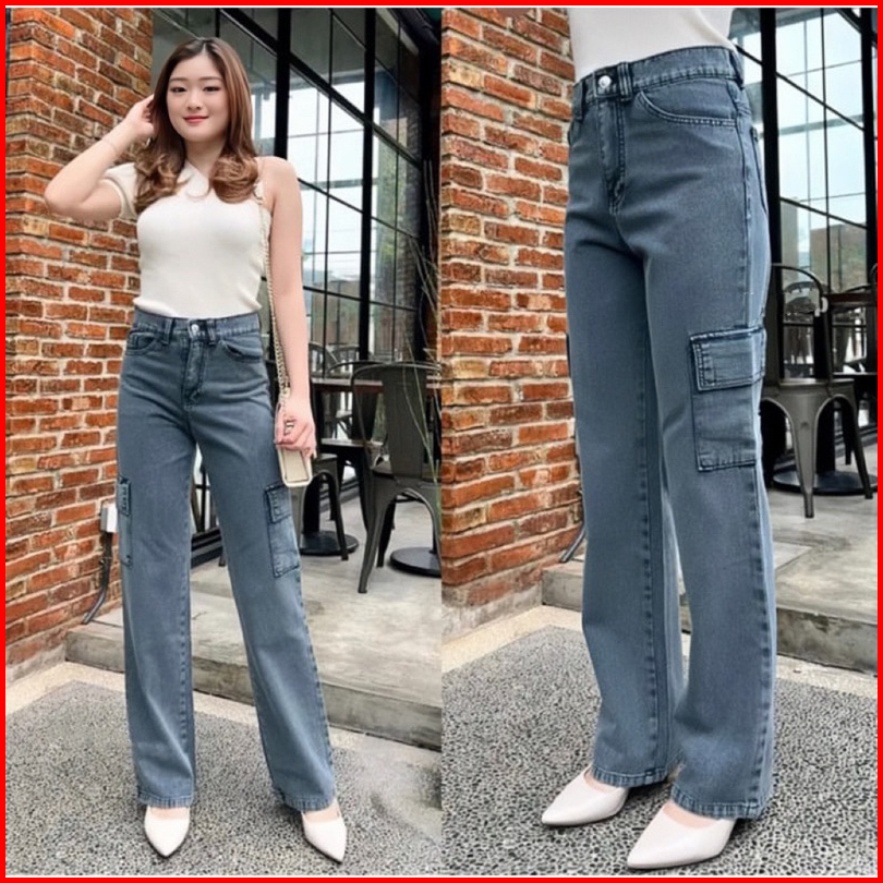 Celana Cargo Highwaist Loose Jeans Wanita Premium