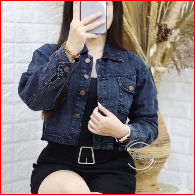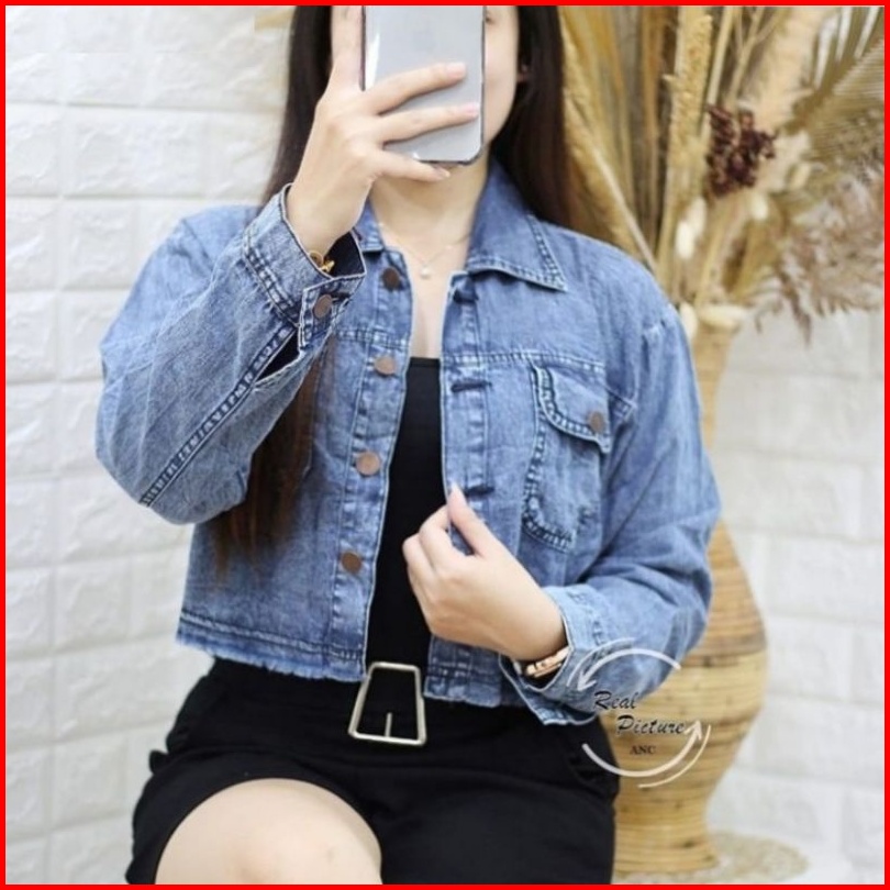 Jaket Jeans Wanita Rawis Jaket Jeans Crop Pita Belakang Jaket Jeans Pita Belakang