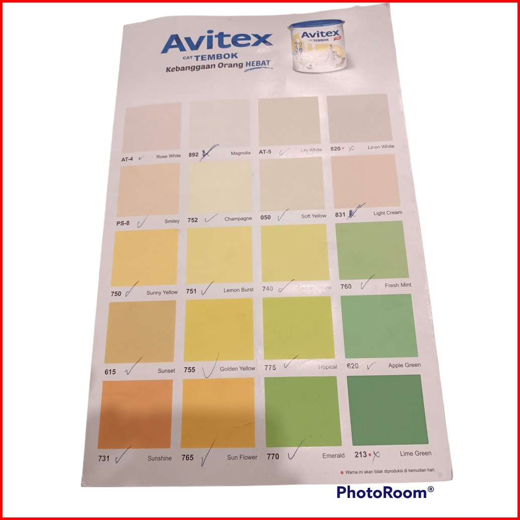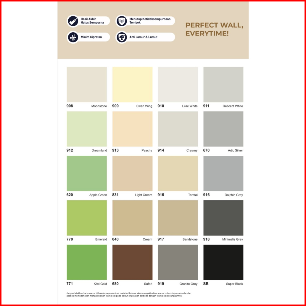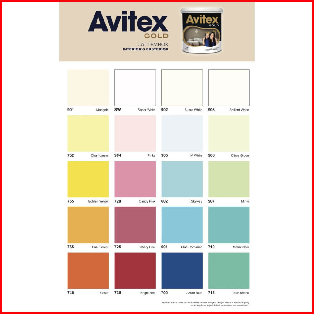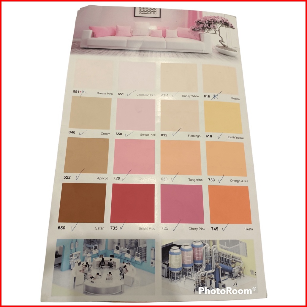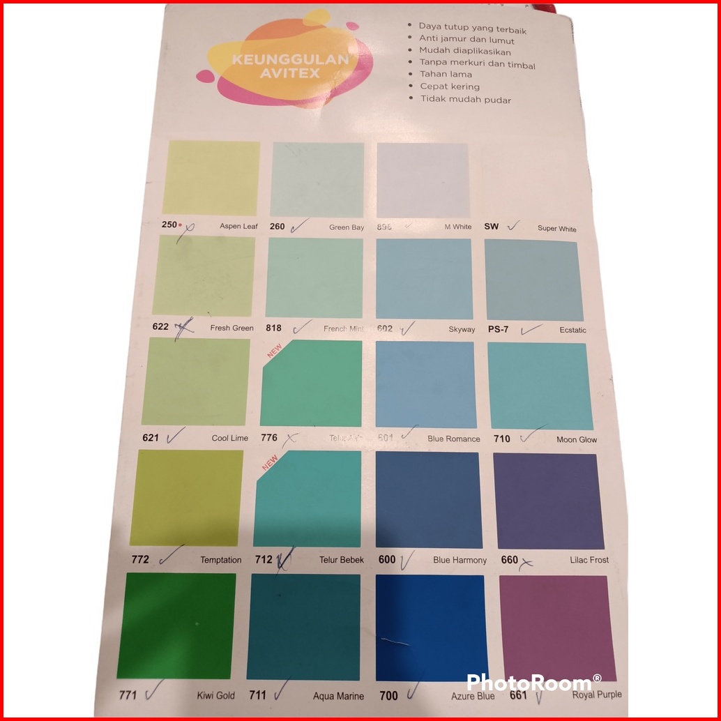 INDACO ENVI PUTIH A, ARIES GOLD PUTIH B, ARIES GOLD PUTIH A, AVITEX GOLD PUTIH B, AVITEX GOLD PUTIH A, 600 BLUE HARMONY, 610 EARTH YELLOW, 620 APPLE GREEN, 650 SWEET PINK, 660 LILAC FROST, 670 ARTIC SILVER, 671 MIDNIGHT, 675 MODERN GREY, 680 SAFARI, 700 AZURE BLUE, 710 MOON GLOW, 720 CANDY PINK, 725 CHERRY PINK, 730 ORANGE JUICE, 731 SUNSHINE, 735 BRIGHT RED, 740 LEMON YELLOW, 745 FIESTA, 750 SUNNY YELLOW, 755 GOLDEN YELLOW, 765 SUNFLOWER, 770 EMERALD, 771 KIWI GOLD, 831 LIGHT CREAM, SW SUPER WHITE, SB SUPER BLACK, 896 MW/PUTIH SALJU, 901 MARIGOLD, 902 SUPRA WHITE, 903 BRILIANT WHITE, 752 CHAMPAGNE, 906 CITRUS GROVE, 602 SKYWAY, 907 MINTY, 601 BLUE ROMANCE, 712 TELUR BEBEK, 908 MOONSTONE, 909 SWAN WING, 910 LILAC WHITE, 911 RETICENT WHITE, 912 DREAMLAND, 913 PEACHY, 914 CREAMY, 915 TERATAI, 916 DOLPHIN GREY, 917 SANDSTONE, 918 MINIMALIS GREY, 919 GRANITE GREY