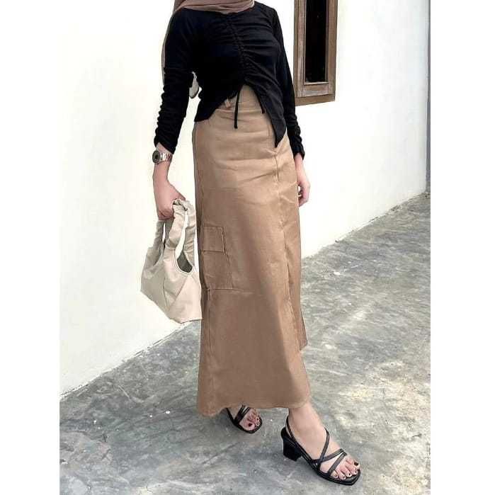 Rok Cargo Cewek Belah Skirt Bahan Katun Twill Melar Korean Style Rok Wanita Kekinian Rok Cargo Belah Twill