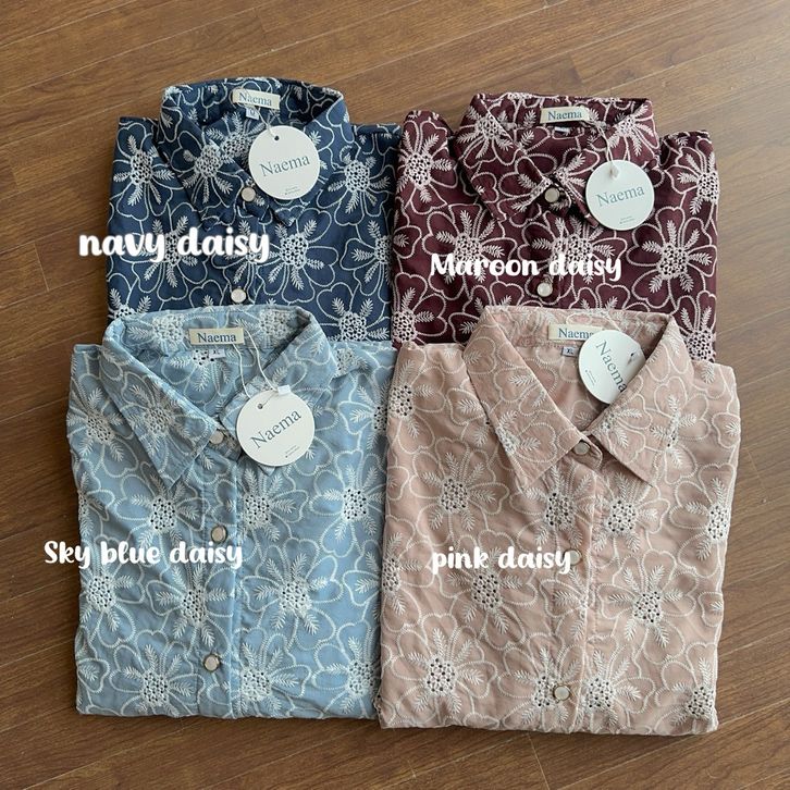 Baby blue embroidery , Latte embroidery, Bw embroidery, Burgundy embroidery, Dustypink embroidery , Black embroidery, Ivory flower , Peach flower, Black livia , Cream livia, Sky blue daisy , Navy daisy , Maroon daisy, Pink daisy , Latte daisy, Latte flower