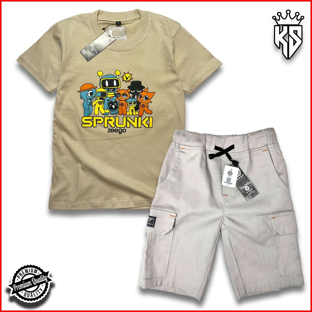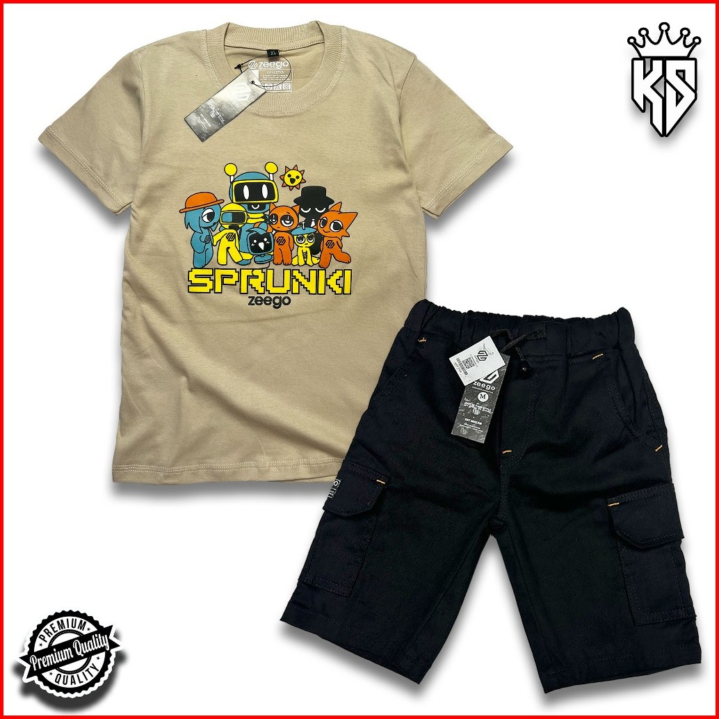 Setelan Baju Kaos Distro Motif Sprungki Dan Celana Cargo Pendek Anak Laki - Laki Usia 3 - 12 Tahun