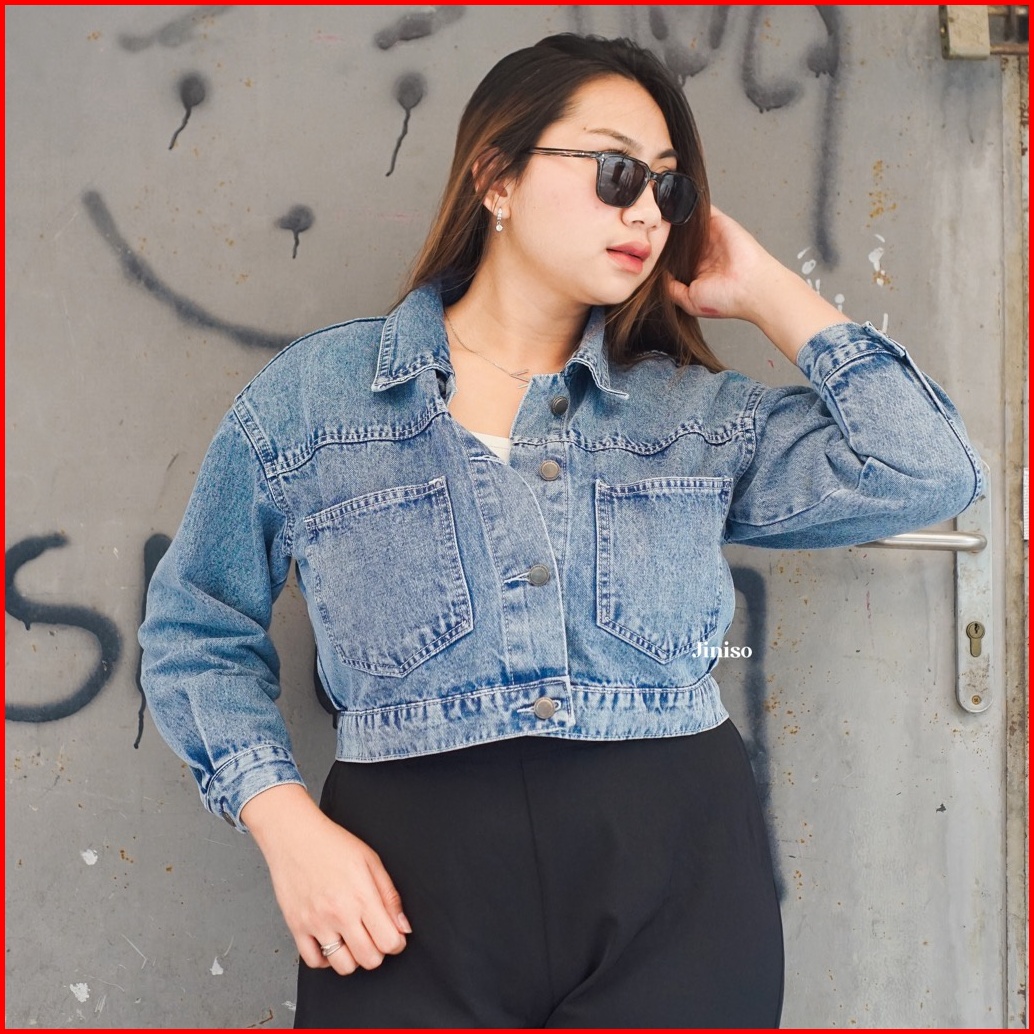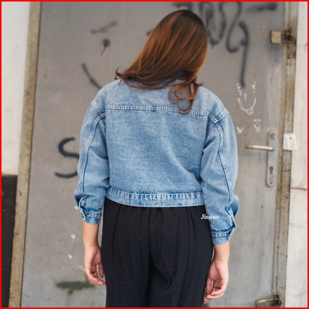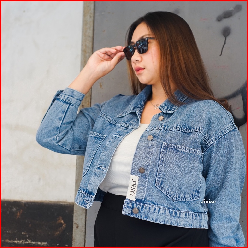 Jiniso Big Size Jaket Crop Jeans Oversize Pocket Blue Acid