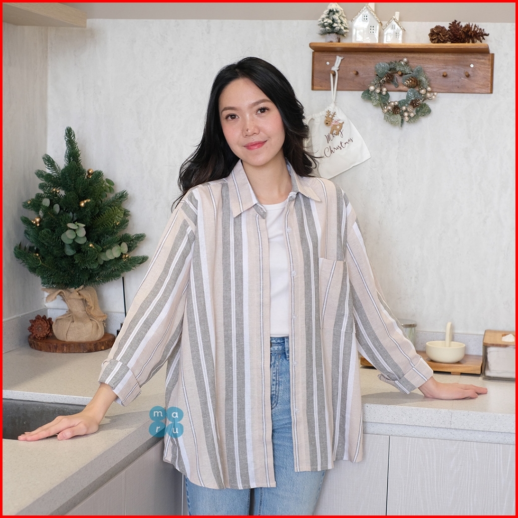 Dami Linen Stripes Shirt Kemeja Wanita Salur Linen Shirt Pakaian Kerja Atasan Formal Garis Cewek