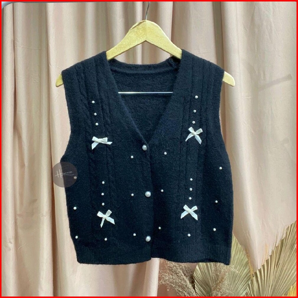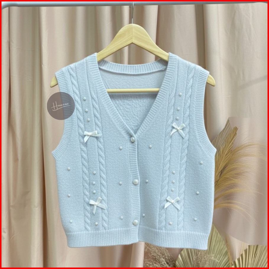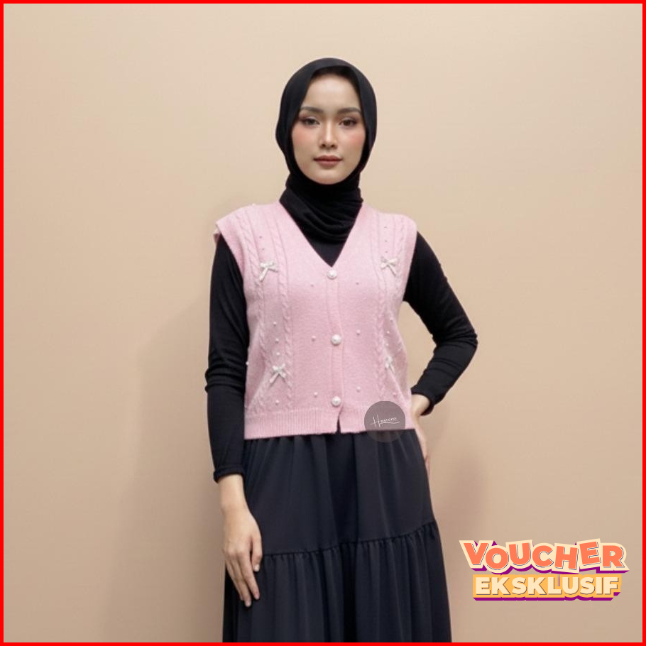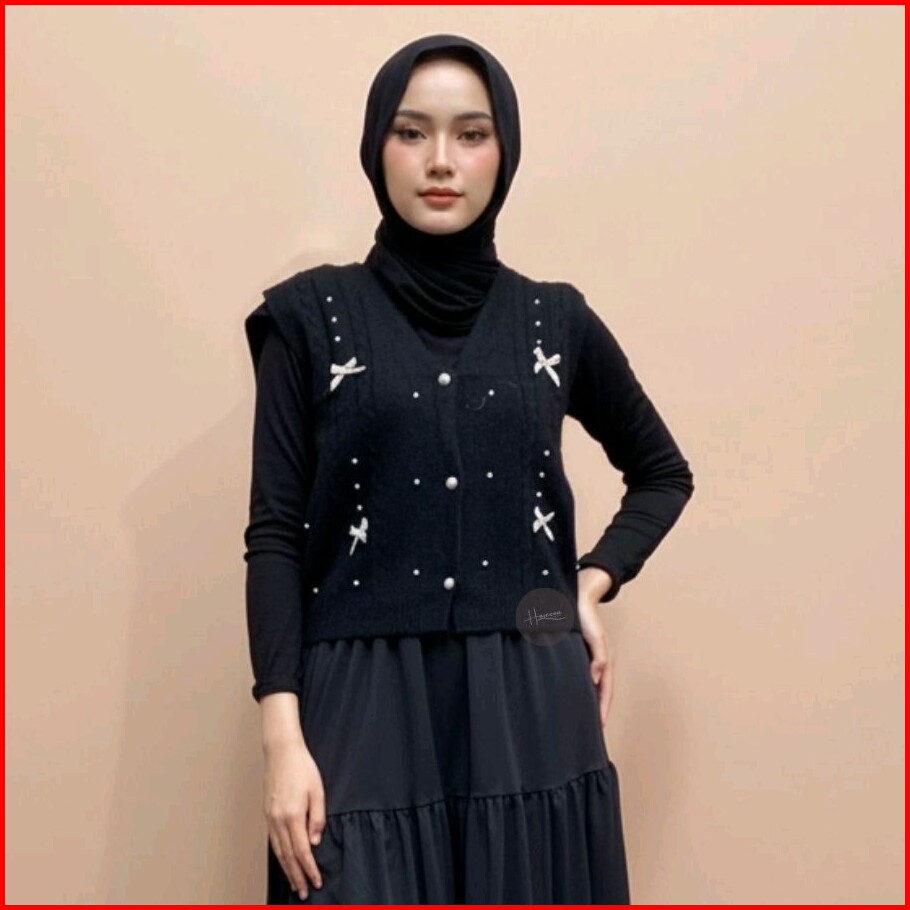 Haseena Vest Knit Pita Zoha Rompi Pearl Ribbon Basic Simpel Outer Wanita Rajut Halus