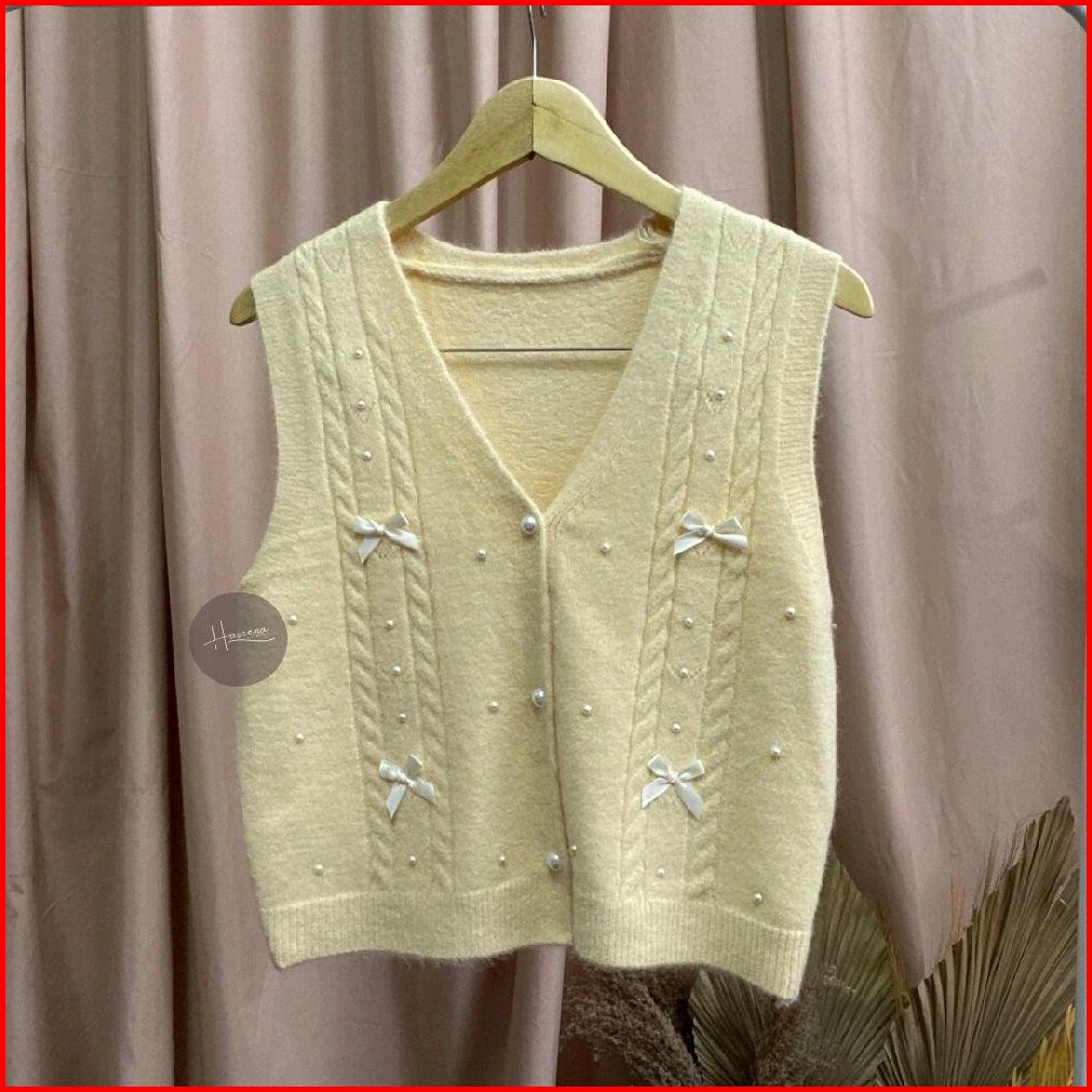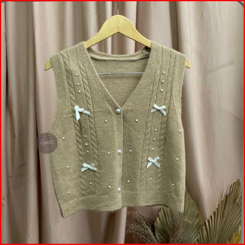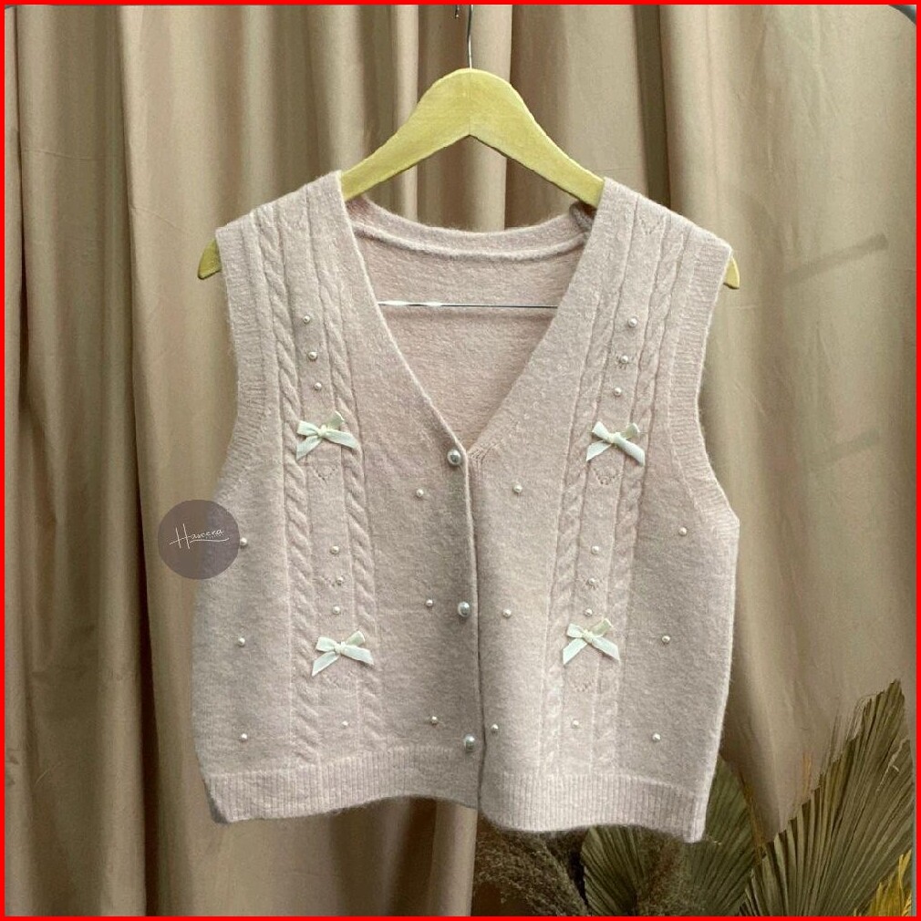 Haseena Vest Knit Pita Zoha Rompi Pearl Ribbon Basic Simpel Outer Wanita Rajut Halus