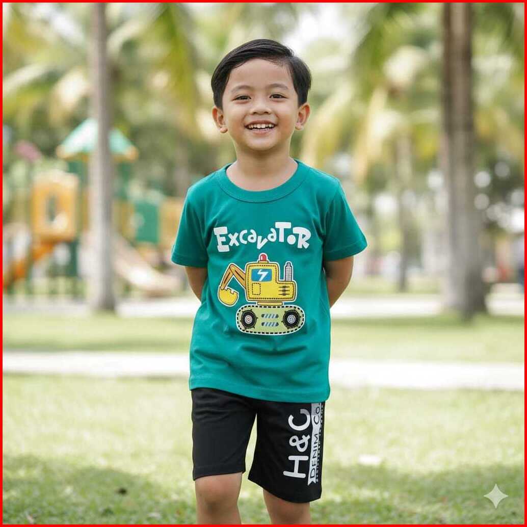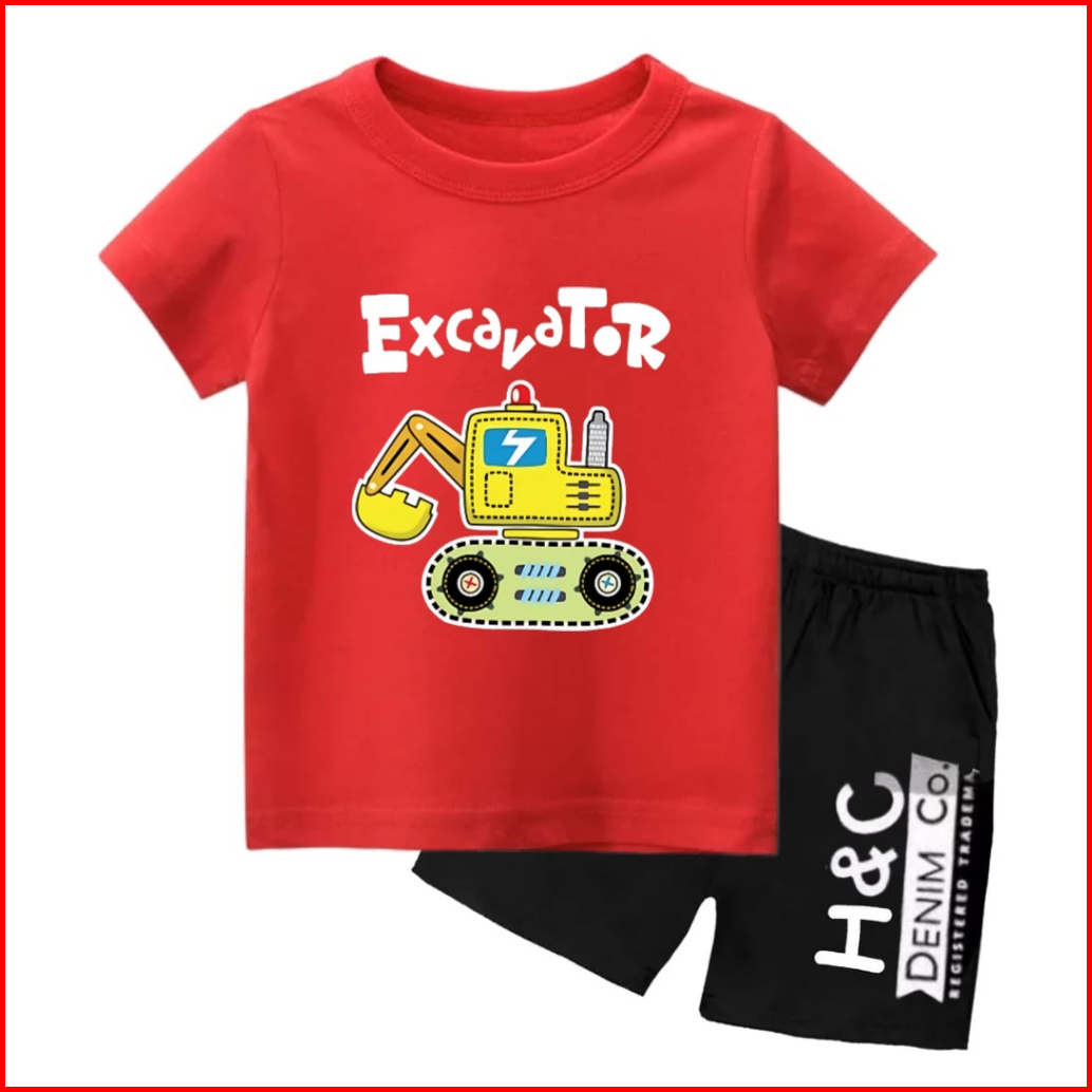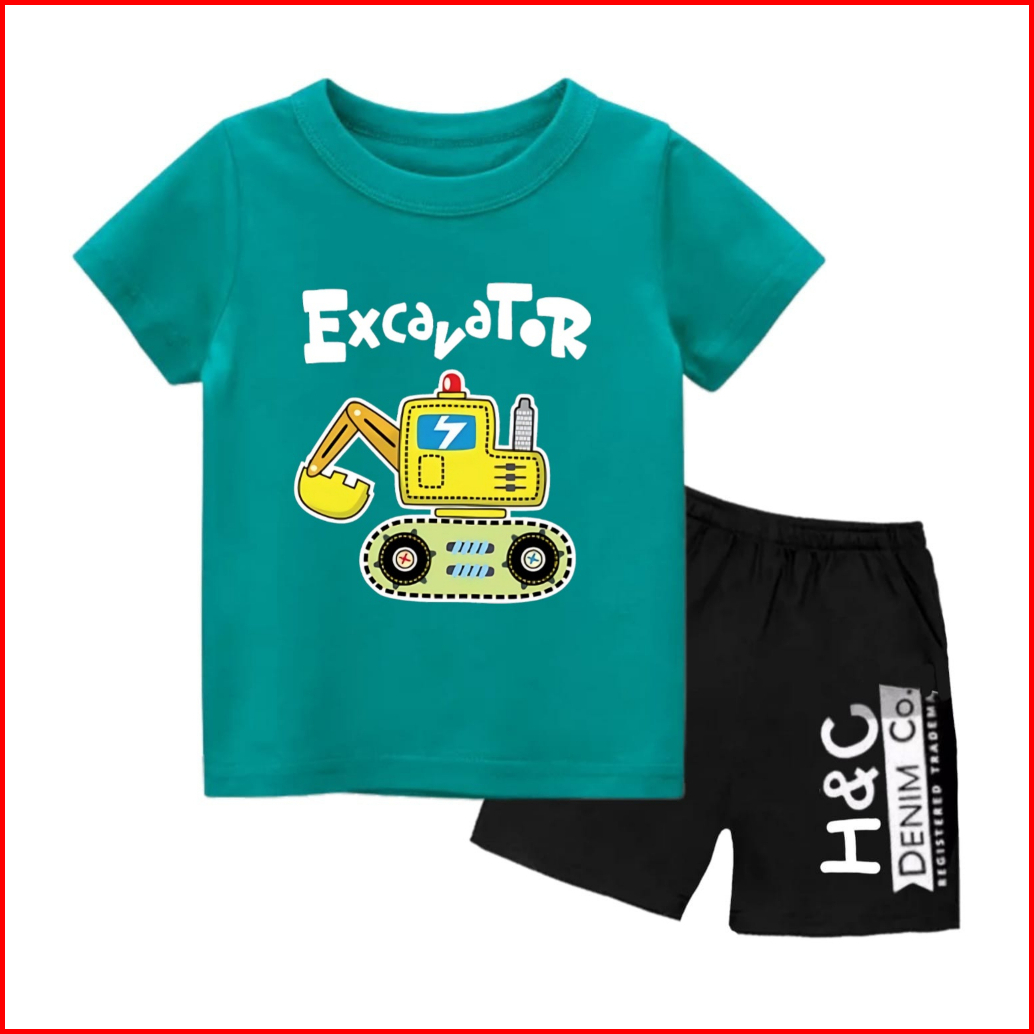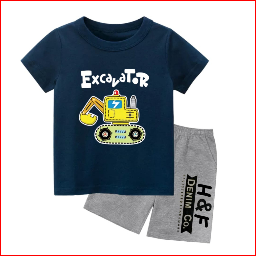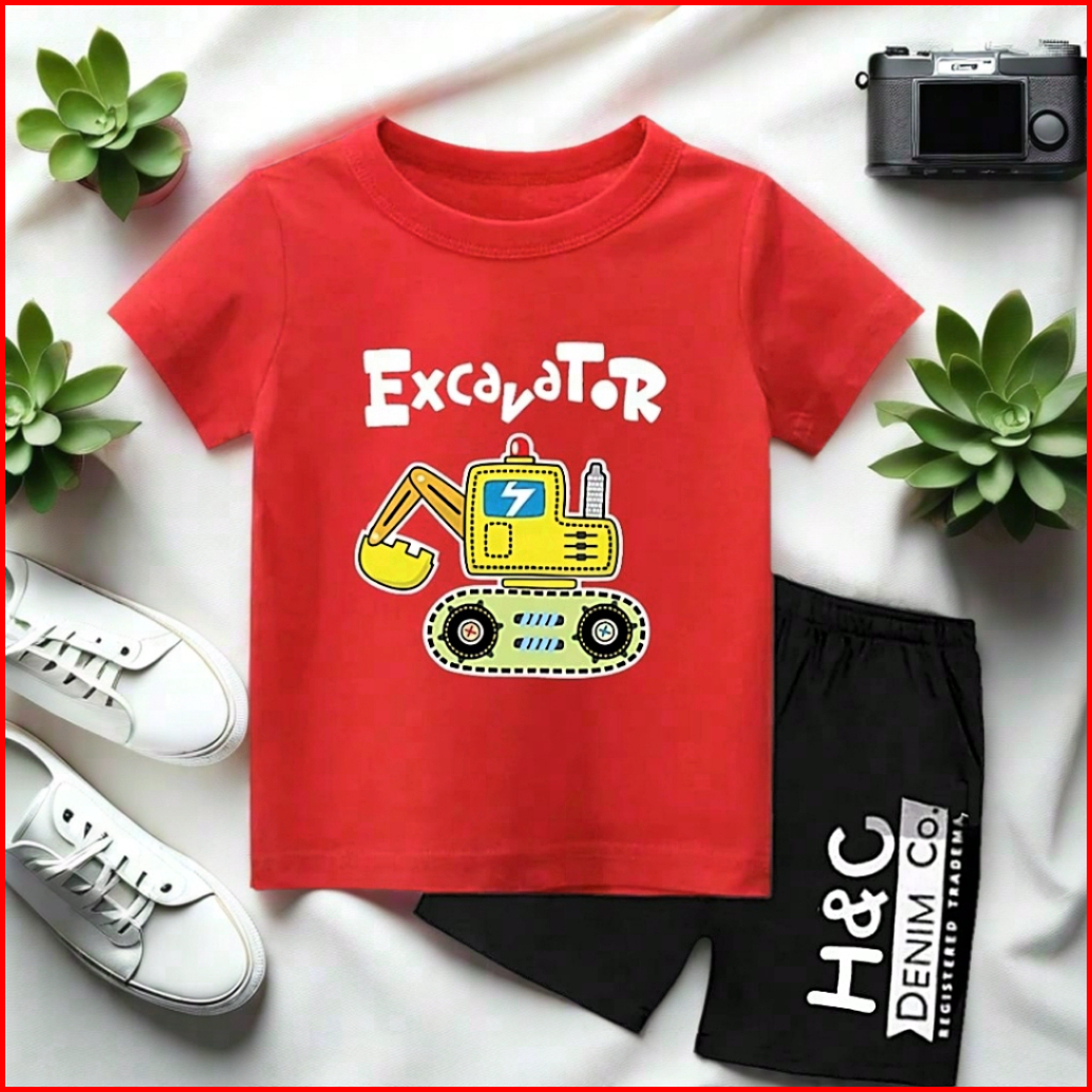 Setelan Baju Lengan Pendek Set Pendek Kaos Anak Laki Laki Motif Excavator