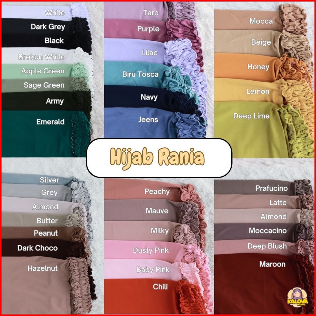 Dusty Pink, Deep Blush, Mauve, Purple, Silver, Maroon, Biru Tosca, Mocca, Butter, Almond, Latte, Black, Dark Grey, White, Broken White, Dark Choco, Peanut, Prafucino, Hazelnut, Navy, Jeens, Apple Green, Sage Green, Deep Lime, Honey, Emerald, Peach, Beige, Baby Pink, Moccacino, Chili, Grey, Lemon, Milky, Taro, Army, Lilac, Canary