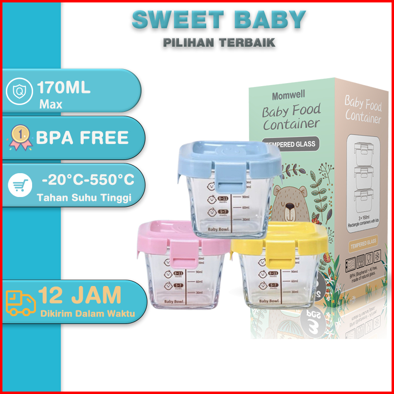 Sweetbaby Tempat Mpasi Kaca 3pcs Wadah Mpasi Kaca Penyimpanan Mpasi Glass Baby Food Container Mpasi Bpa Free Gfb02