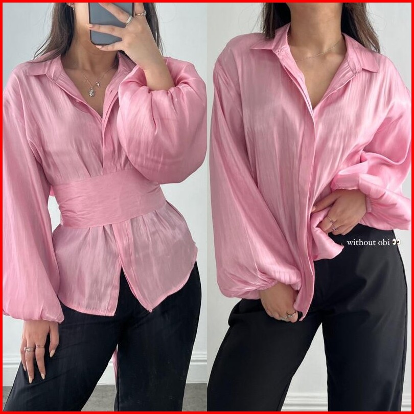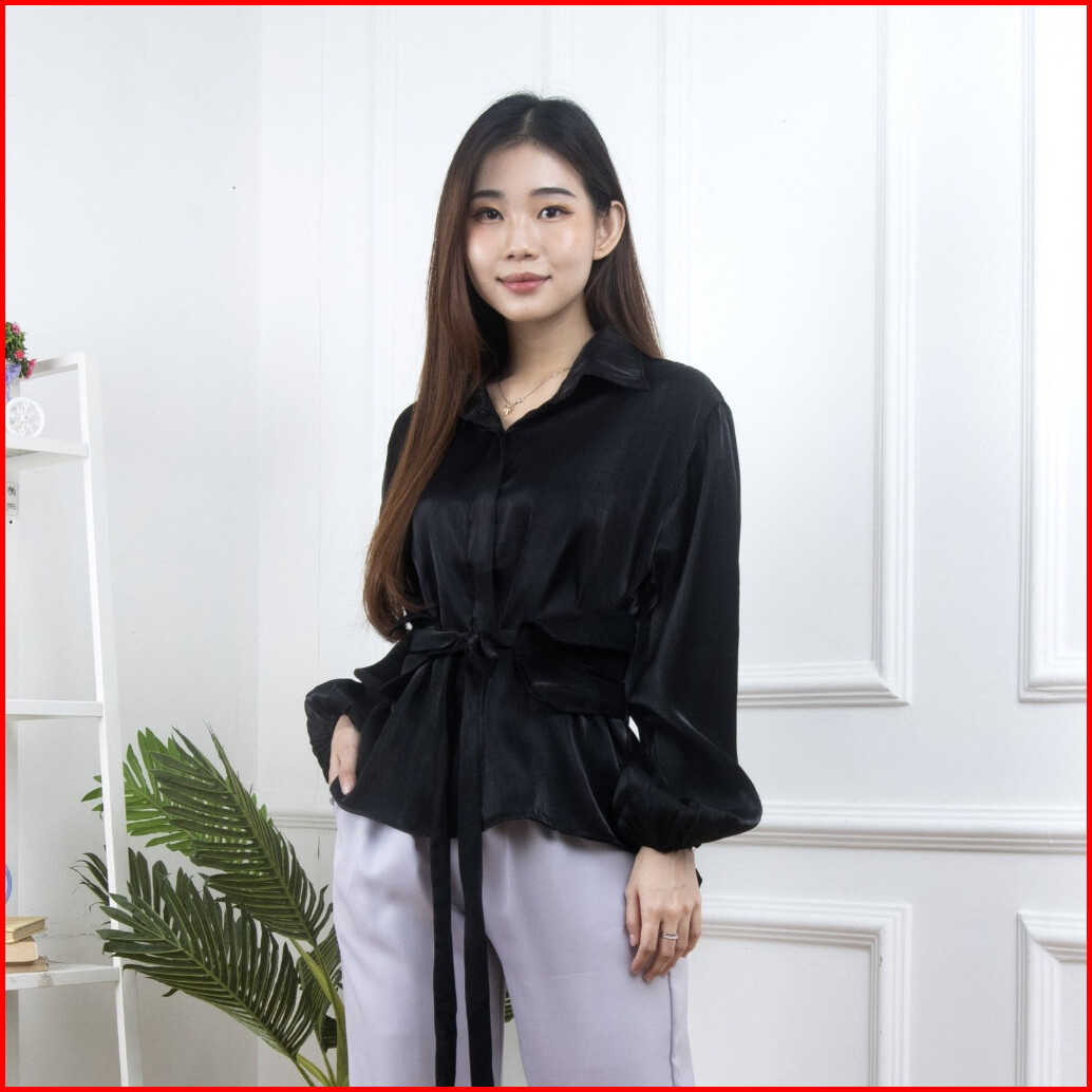 Kemeja Jasmine Shimmer Free Obi Belt Kemeja Wanita Semi Transparent Korean Style