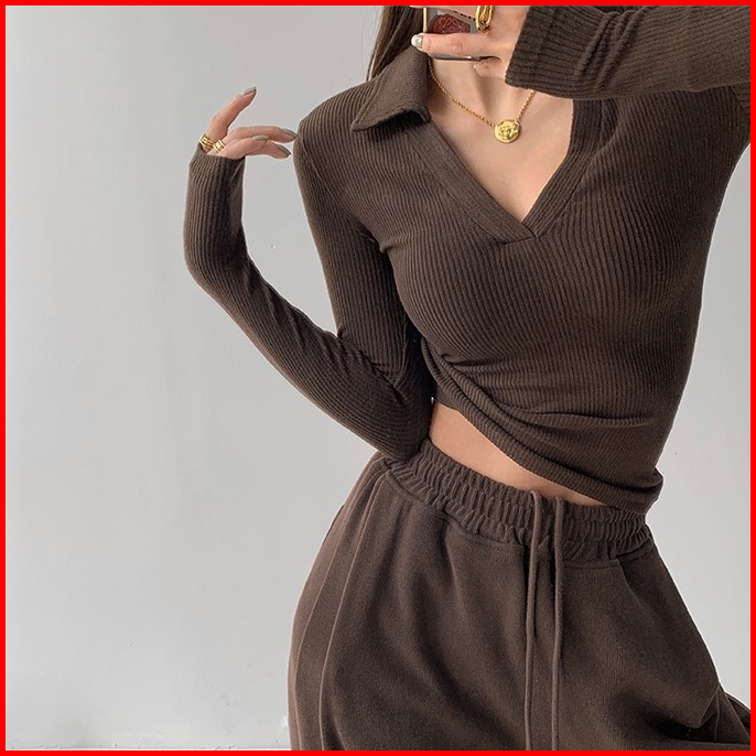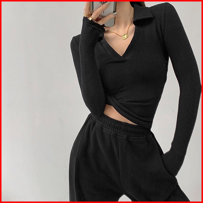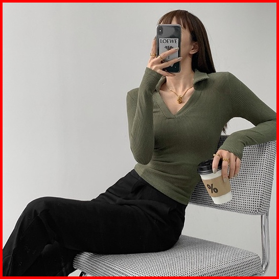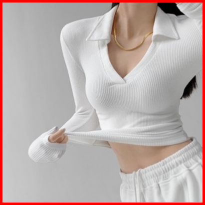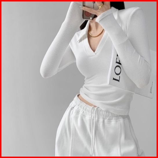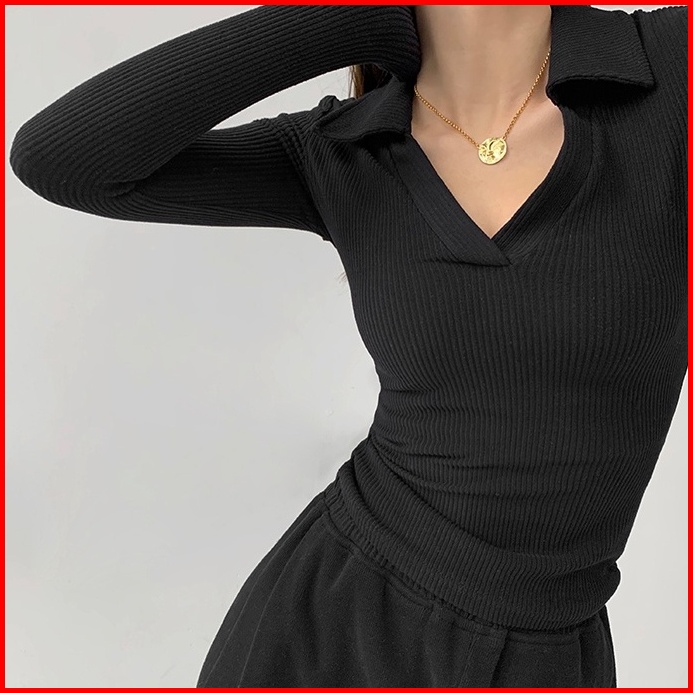 Misshoney V-neck Long Sleeve Ribbed Basic Polo 7304 S M L