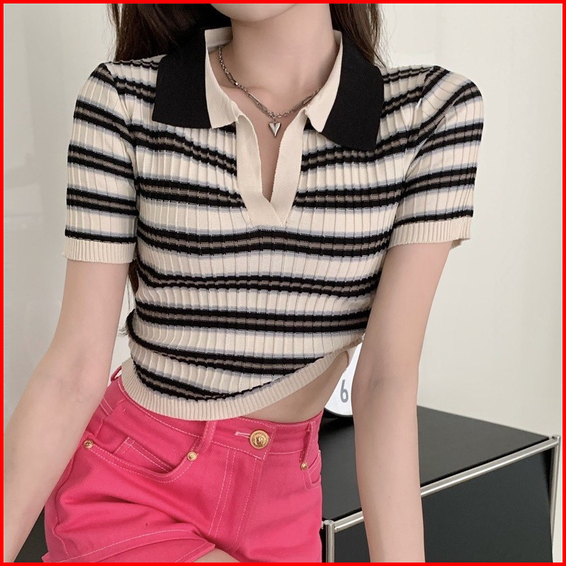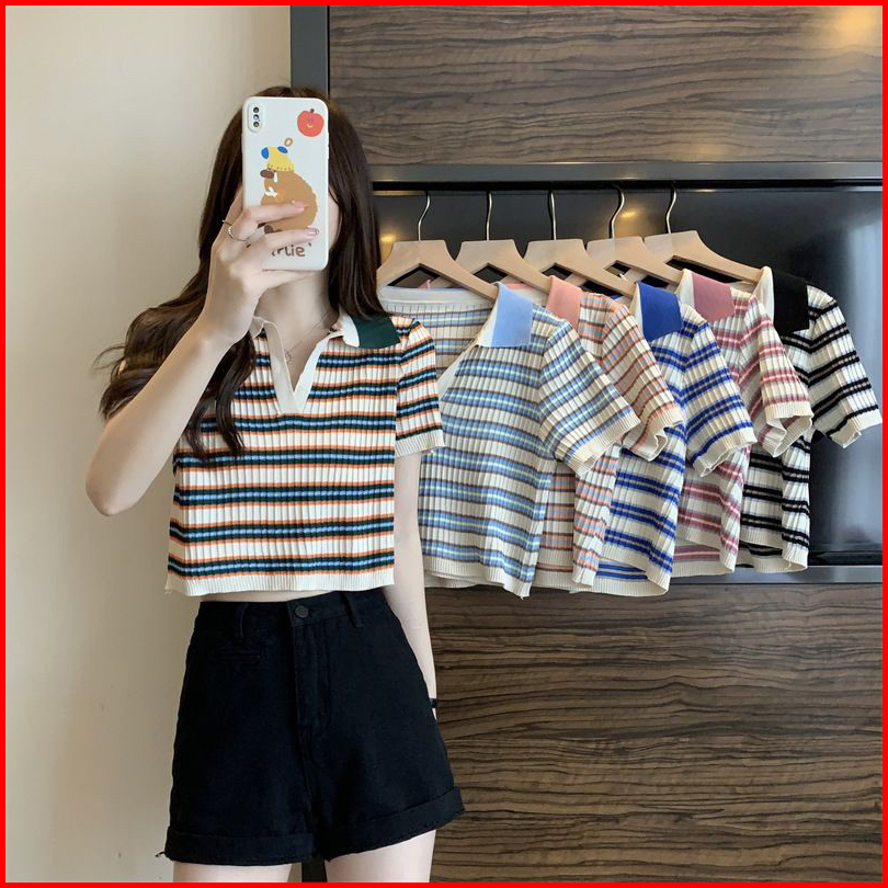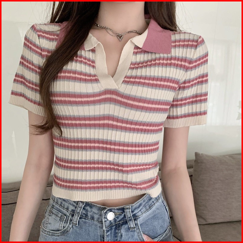 Atasan Rajut Lengan Pendek Salur Garis Garis Wanita Premium Baju Rajut Salur Garis Garis Lengan Pendek Premium Kaos Raju