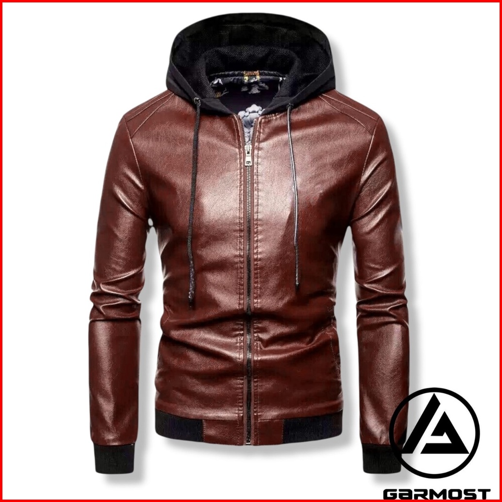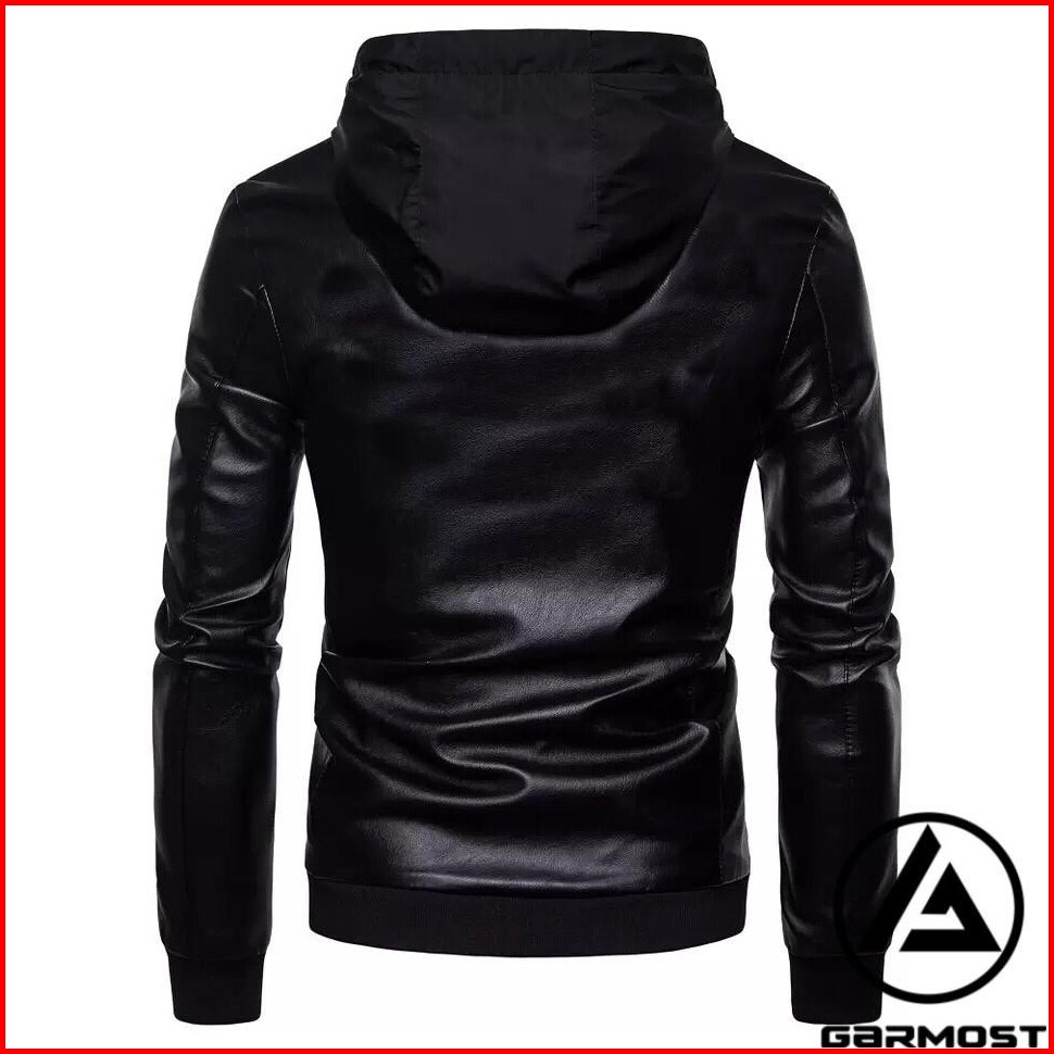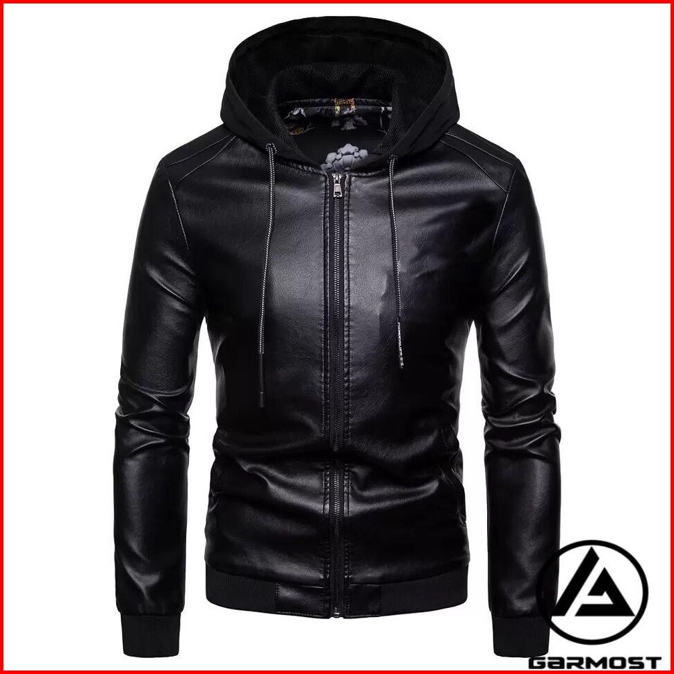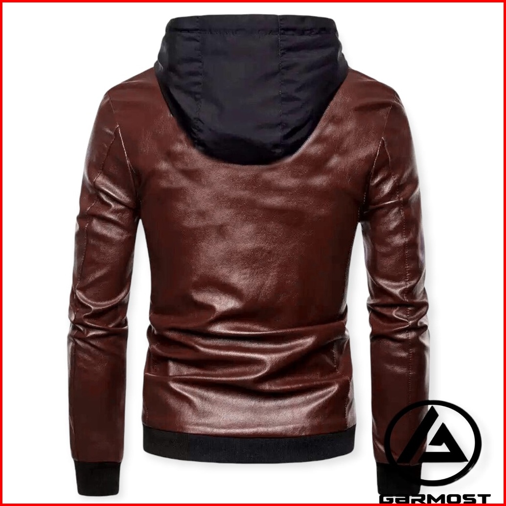 Jaket Semi Kulit Pria Hoodie Polyester Jaket Kulit Sintetis Pu Leather