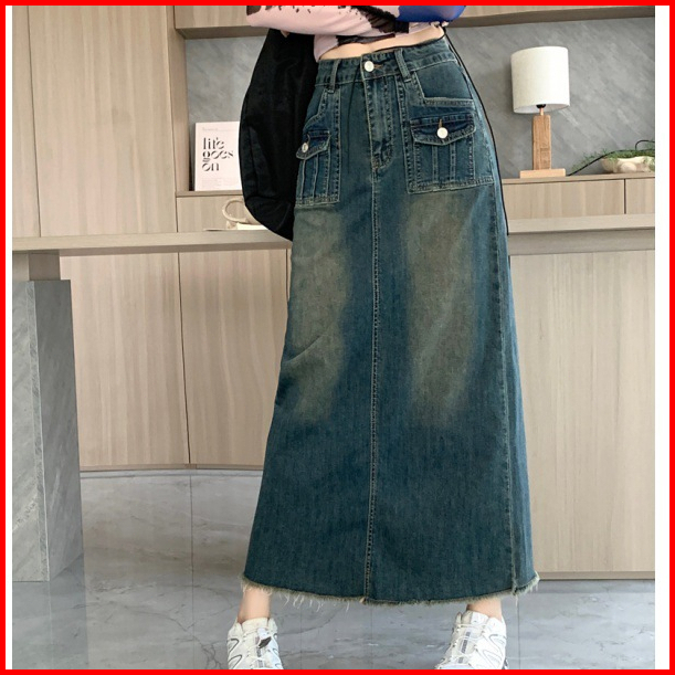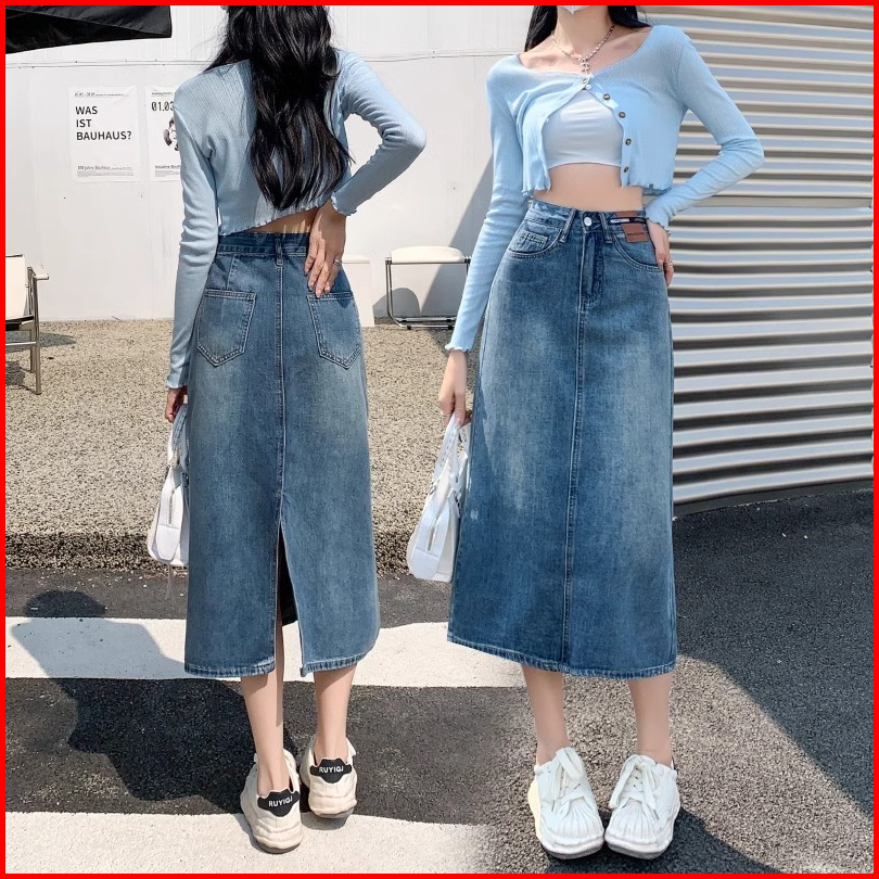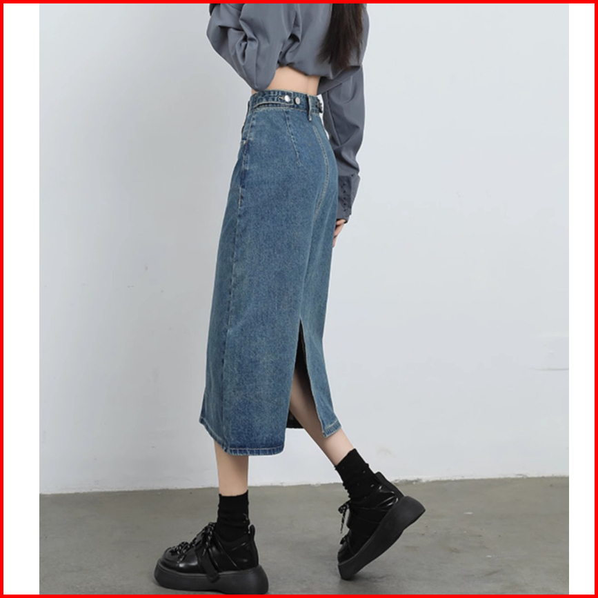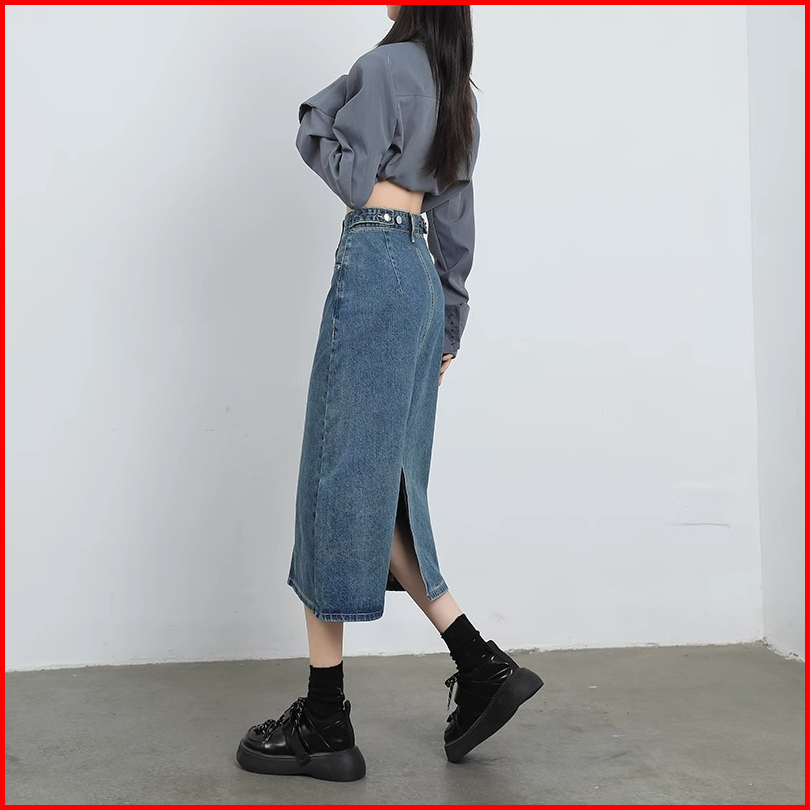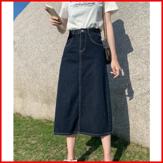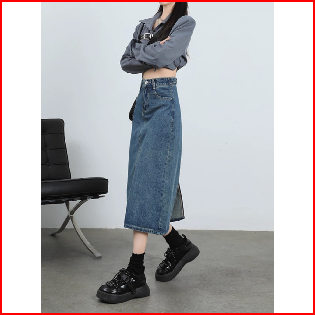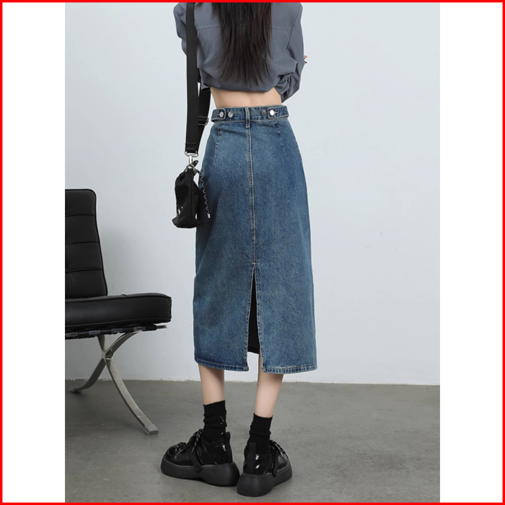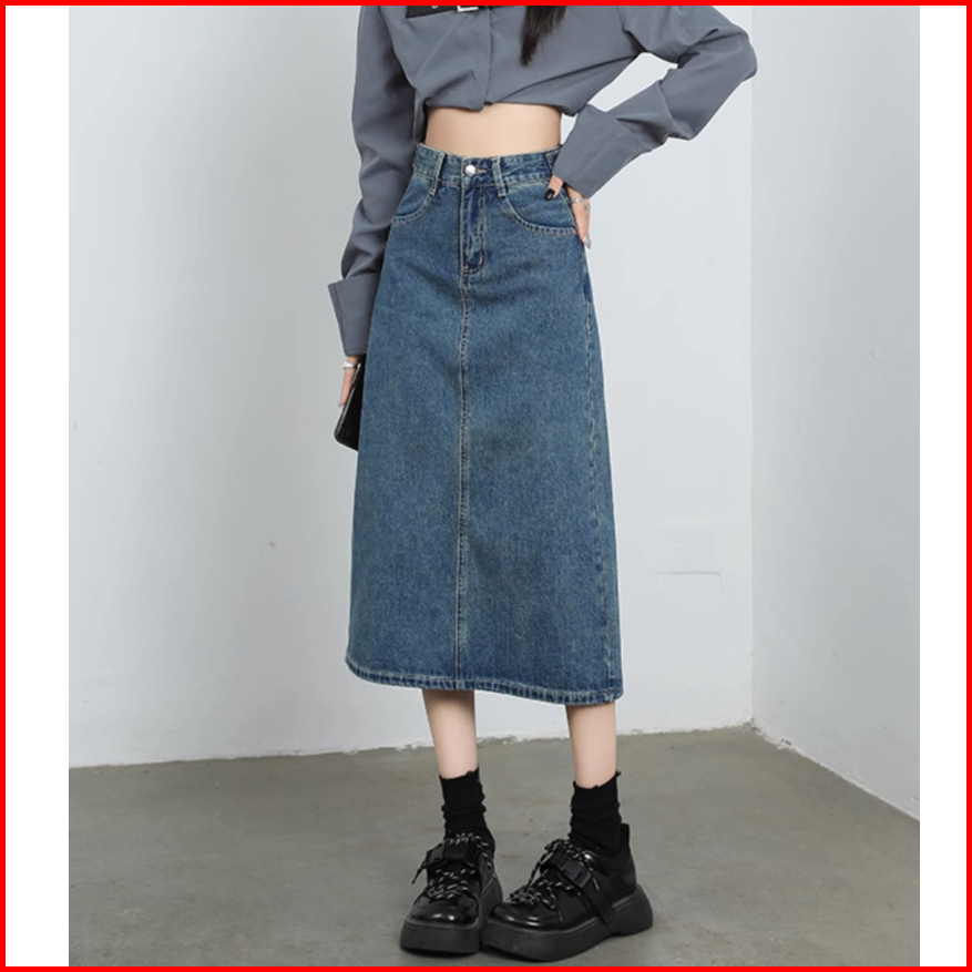 Denim Rok Wanita Pinggang Tinggi Serbaguna Is Thin -line Loose Mid Slong Skirt
