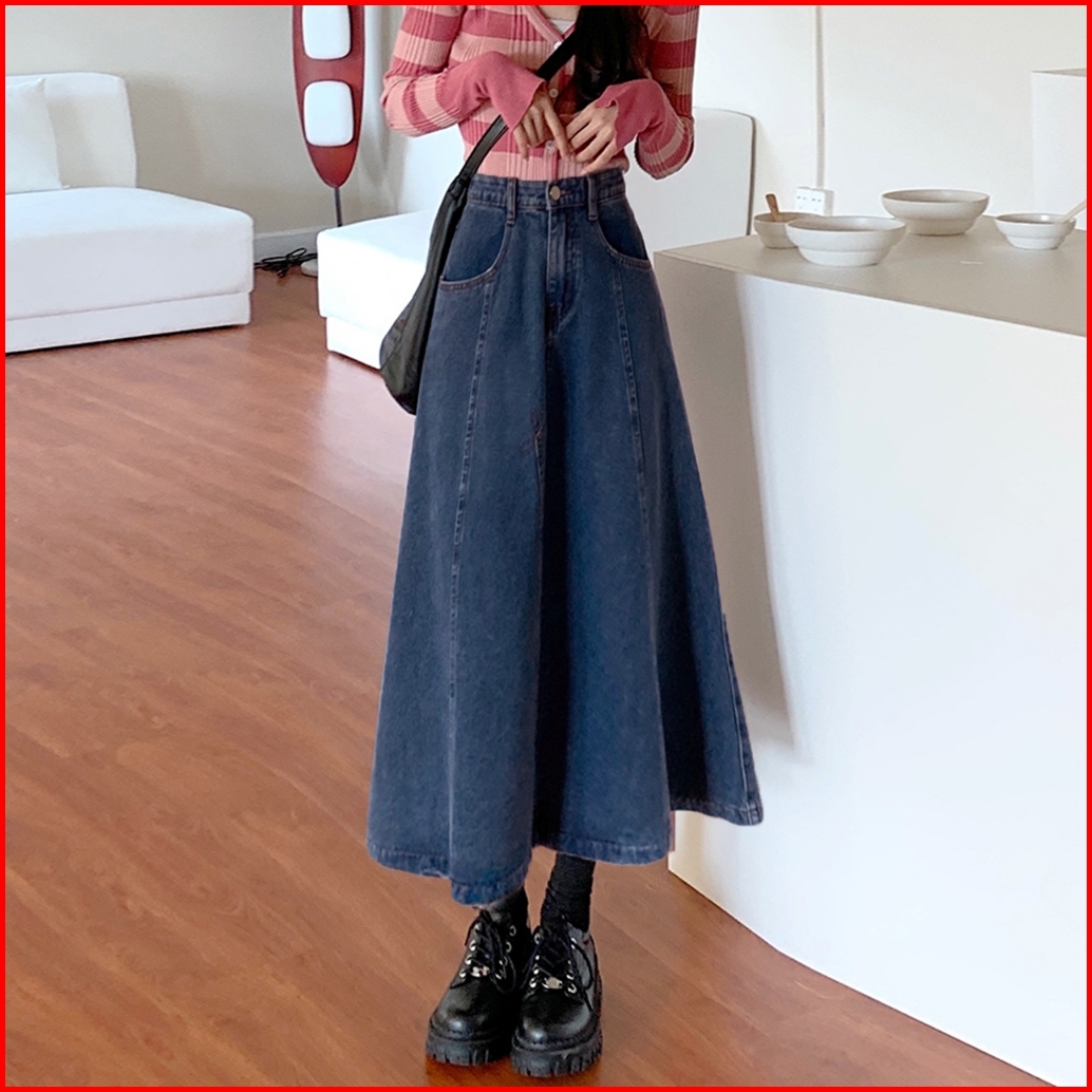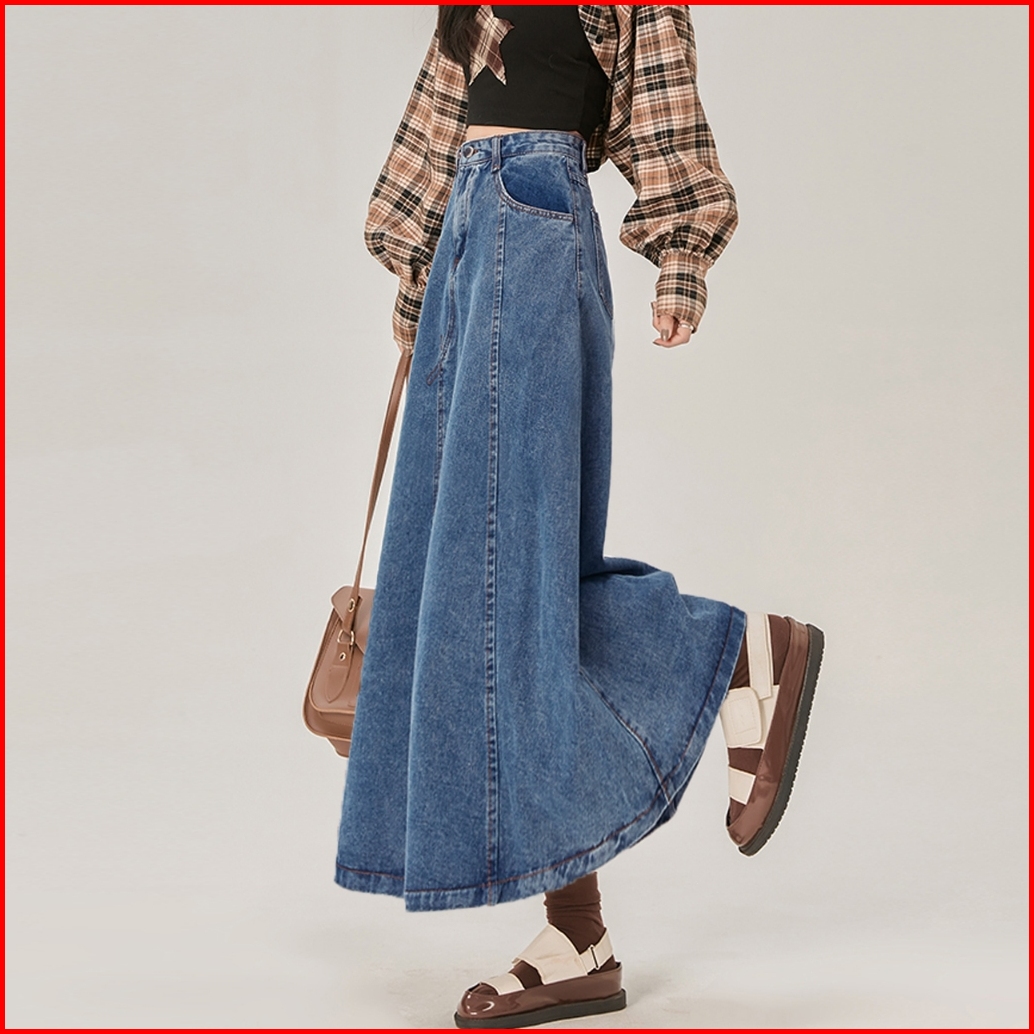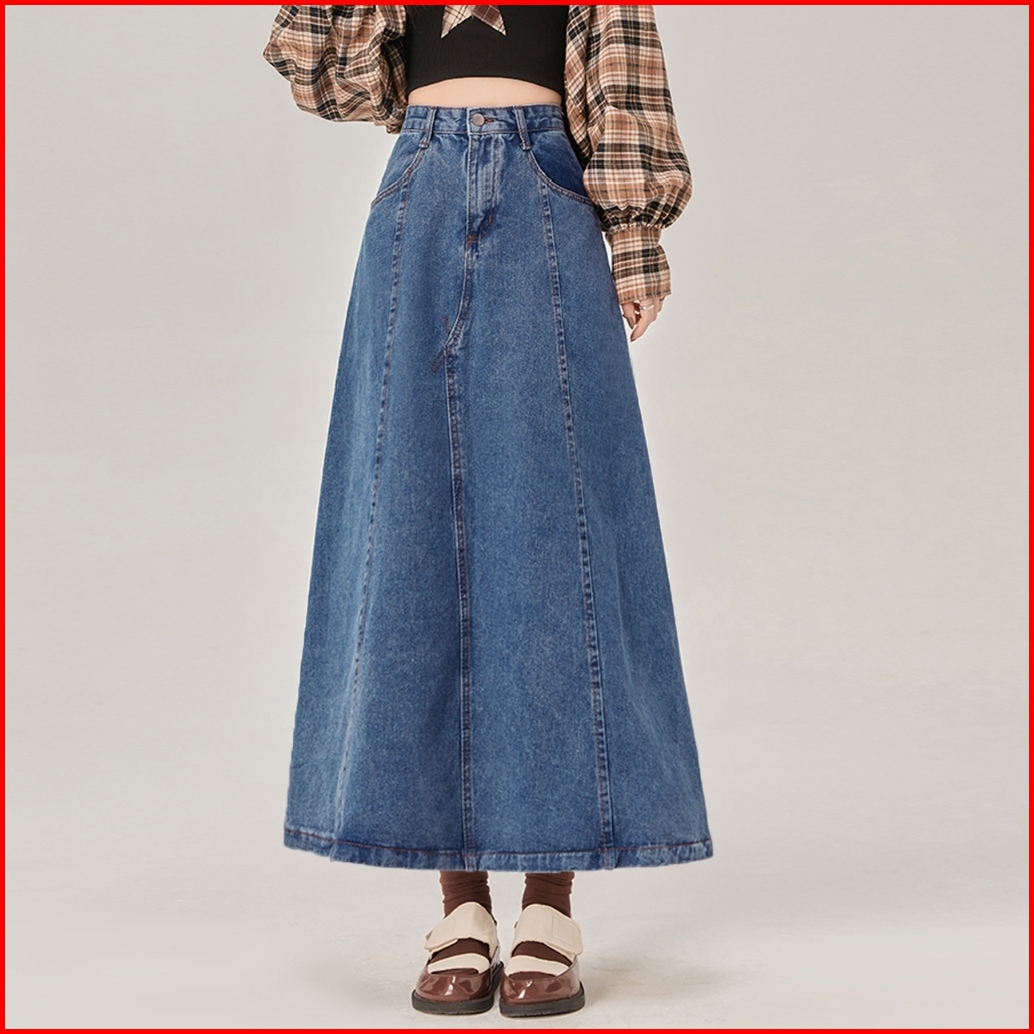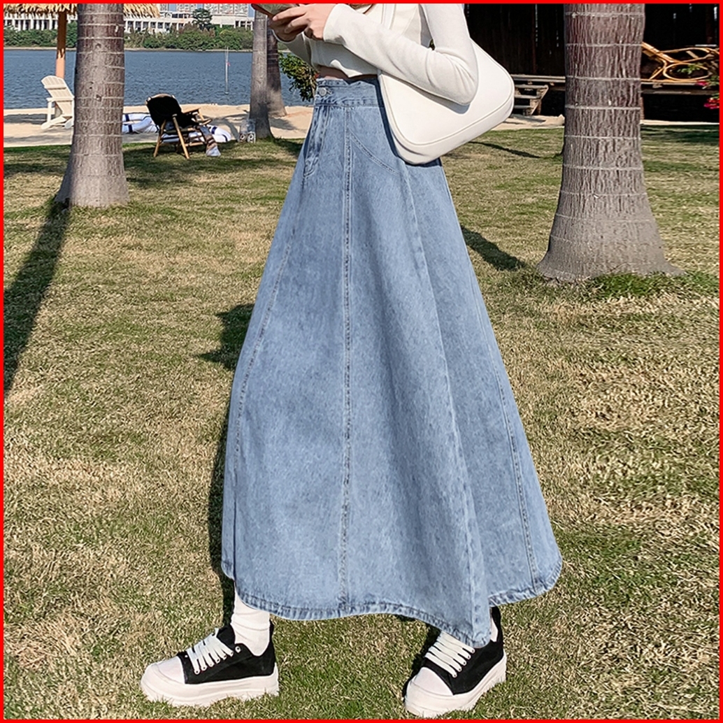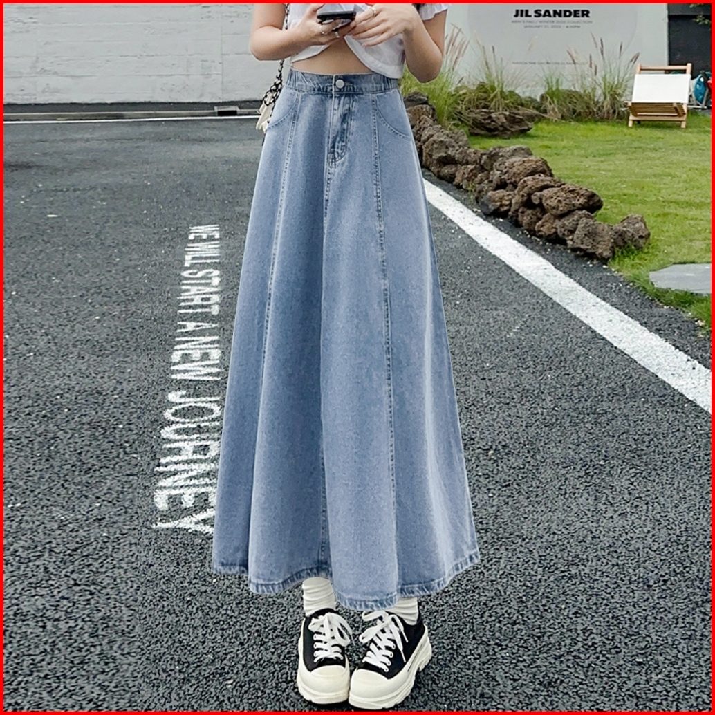 Denim Skirt Wanita Mid-length High Waisted Thin Loose Elastic Waist A-line Skirt