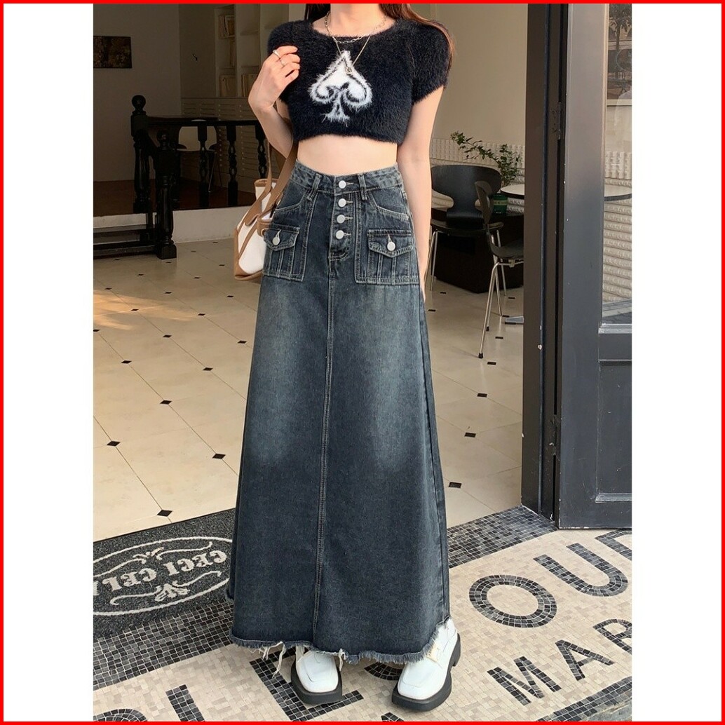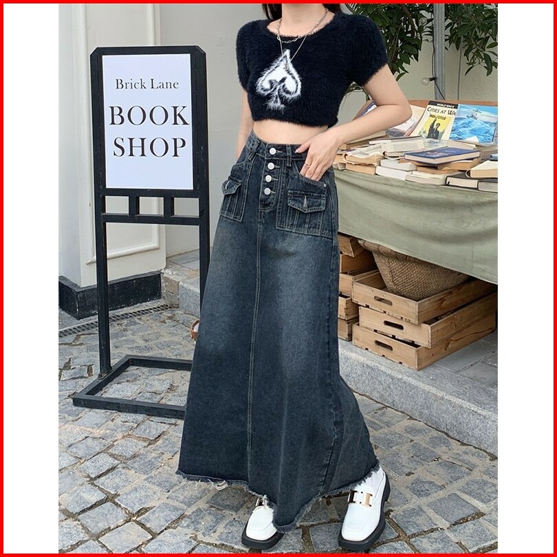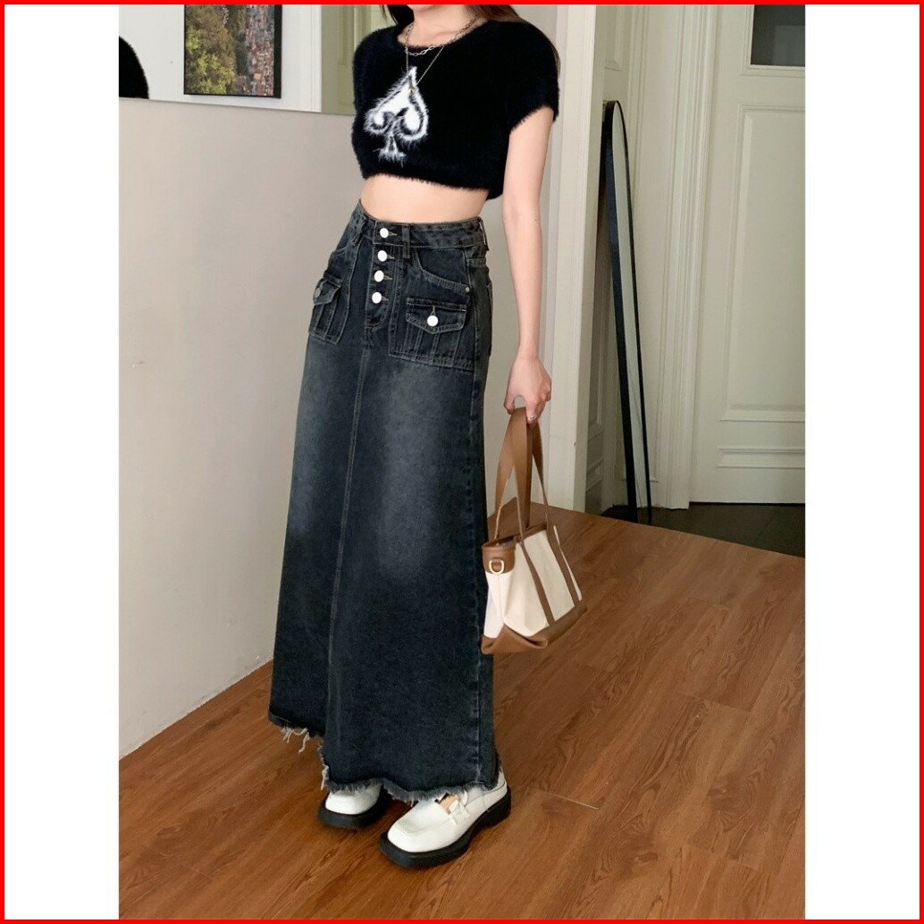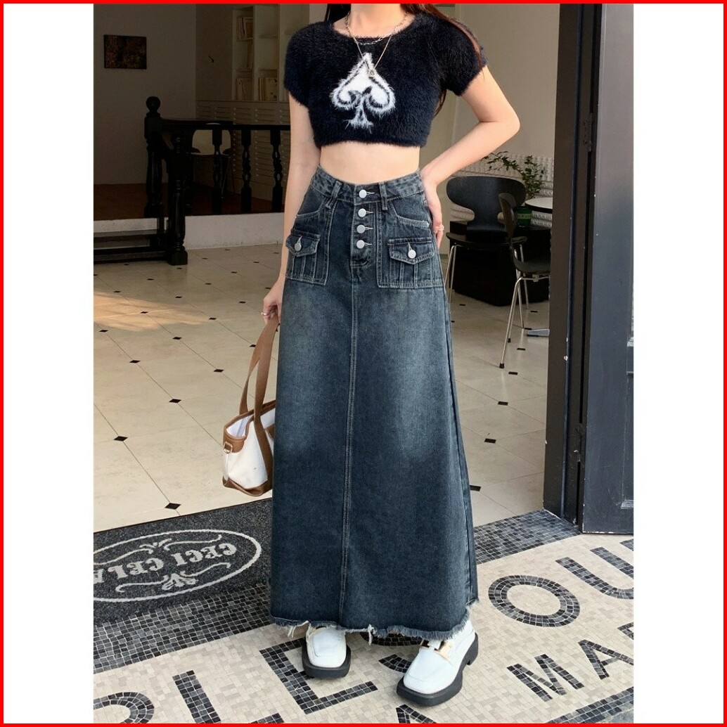 Rok Denim Skirt Terbaru Korean Style Panjang Highwaist Causual Baggy Vintage Rok Jeans A-line Panjang Import Kekinian Pr