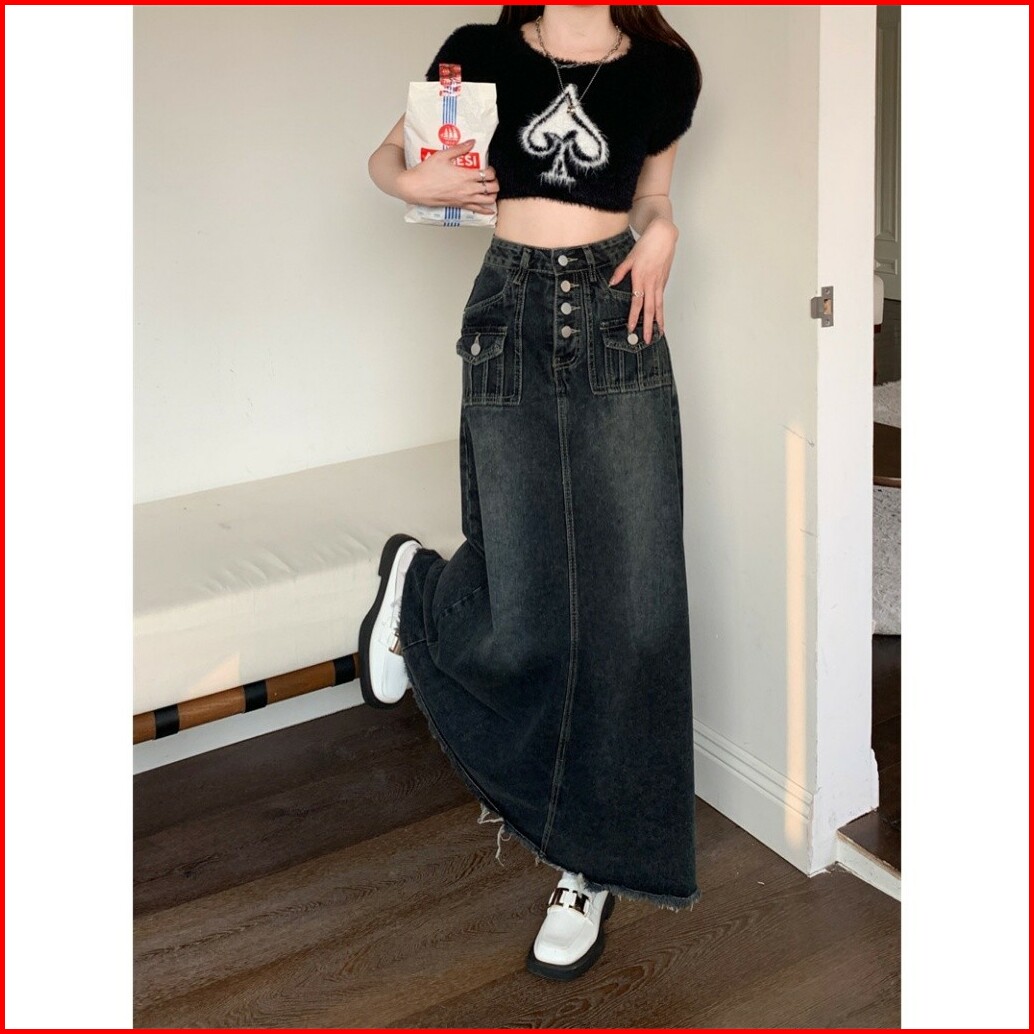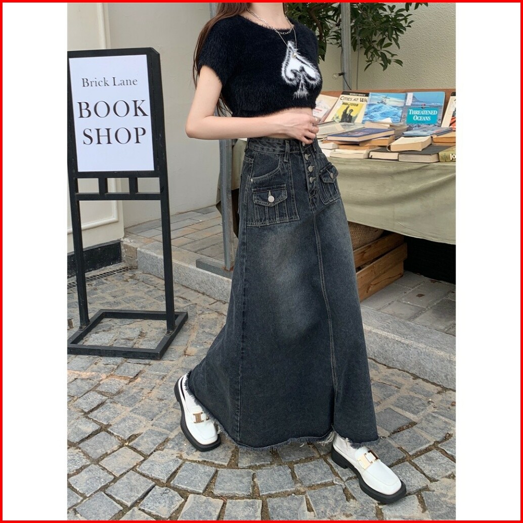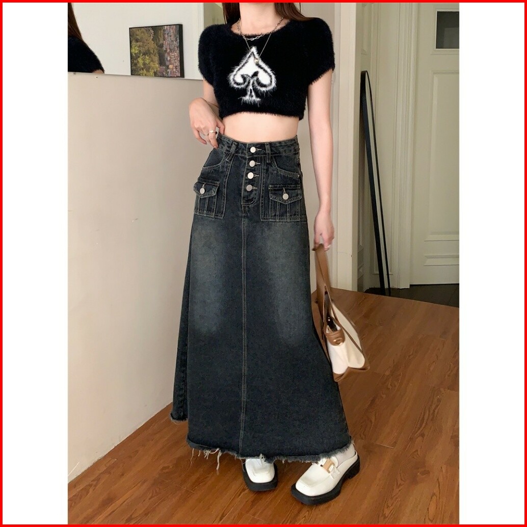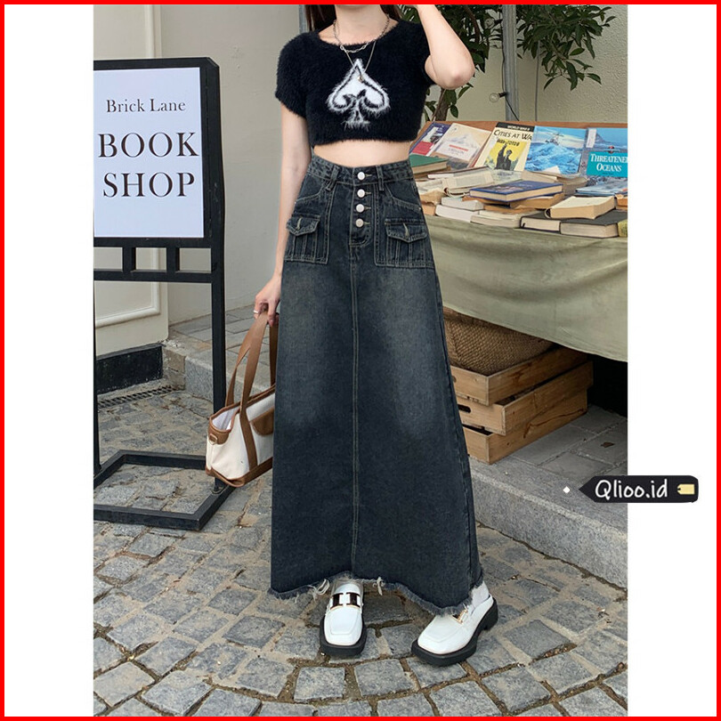 Rok Denim Skirt Terbaru Korean Style Panjang Highwaist Causual Baggy Vintage Rok Jeans A-line Panjang Import Kekinian Pr