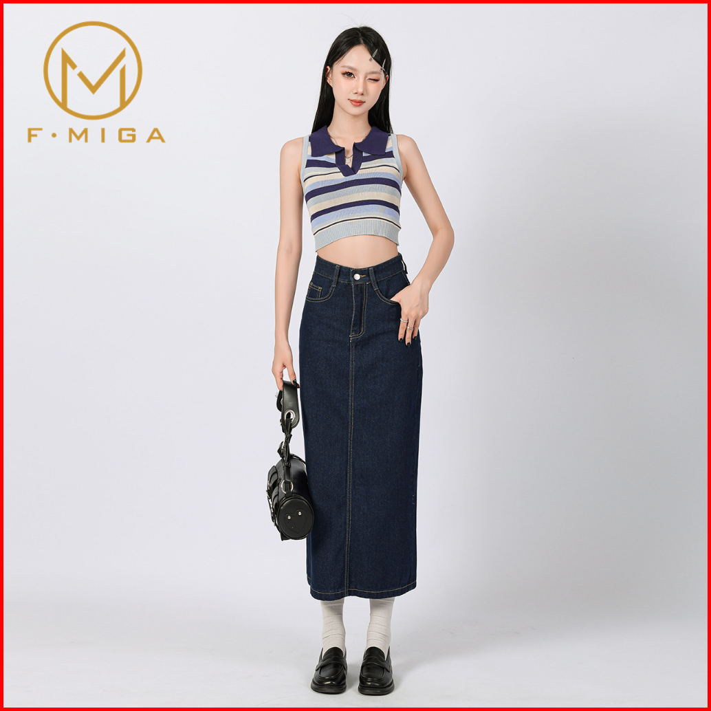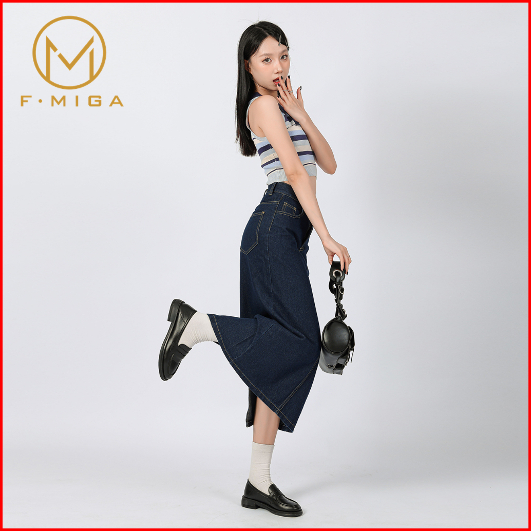 F.miga C54 High Waist Denim Rok Jeans Wanita - Dark Blue