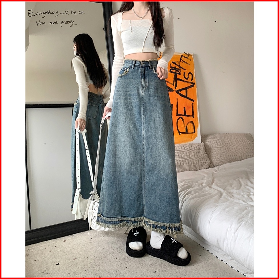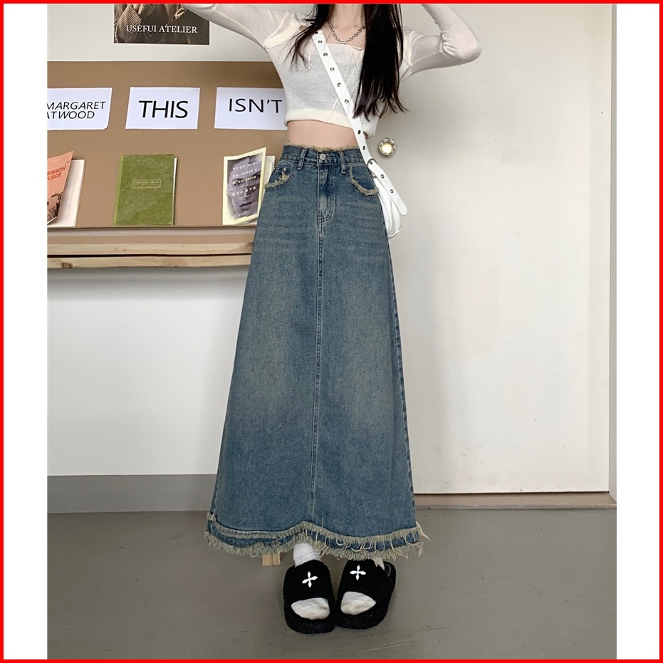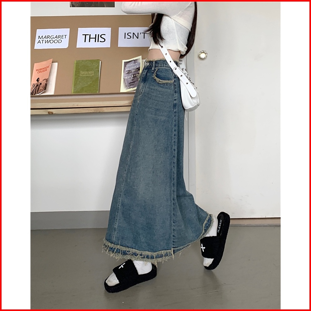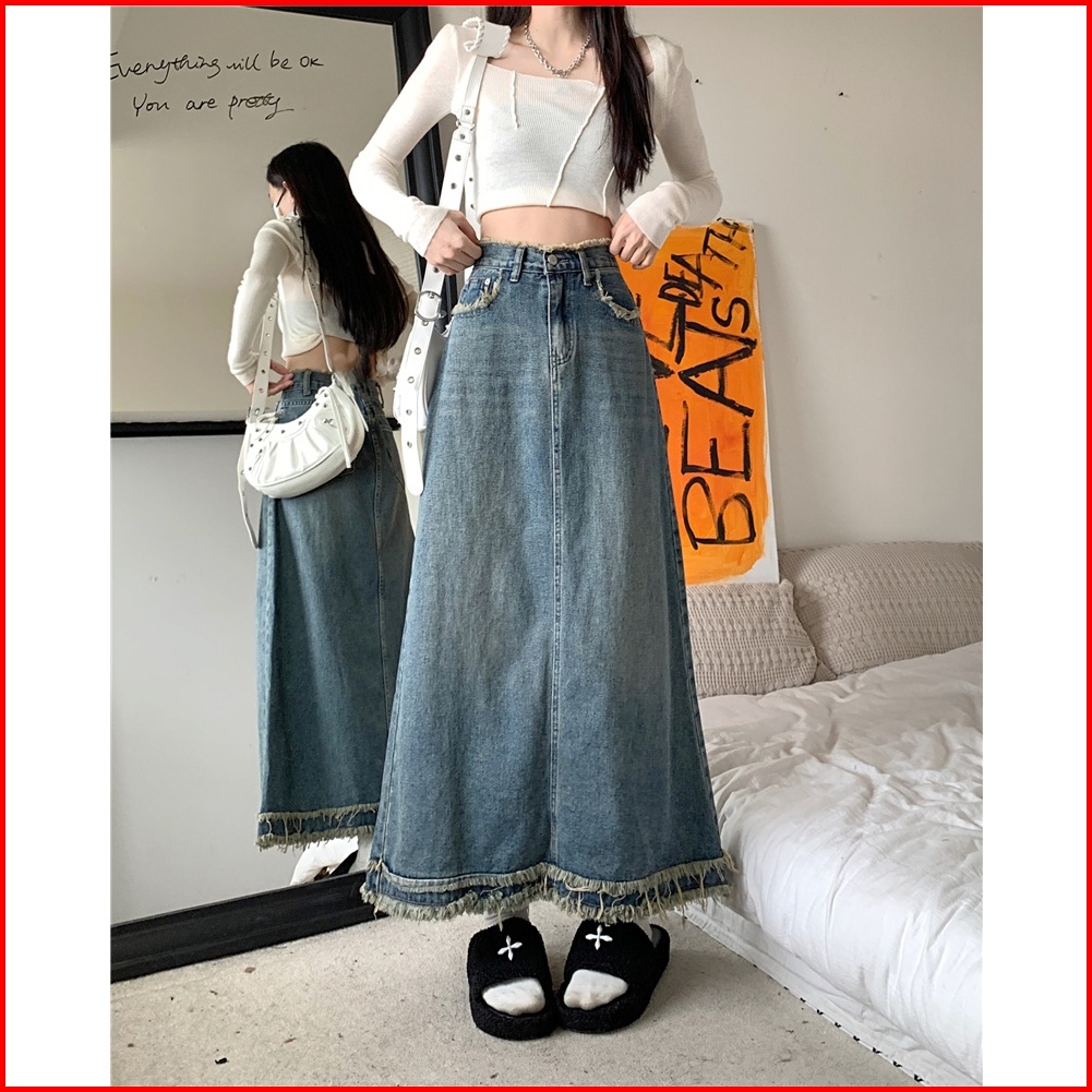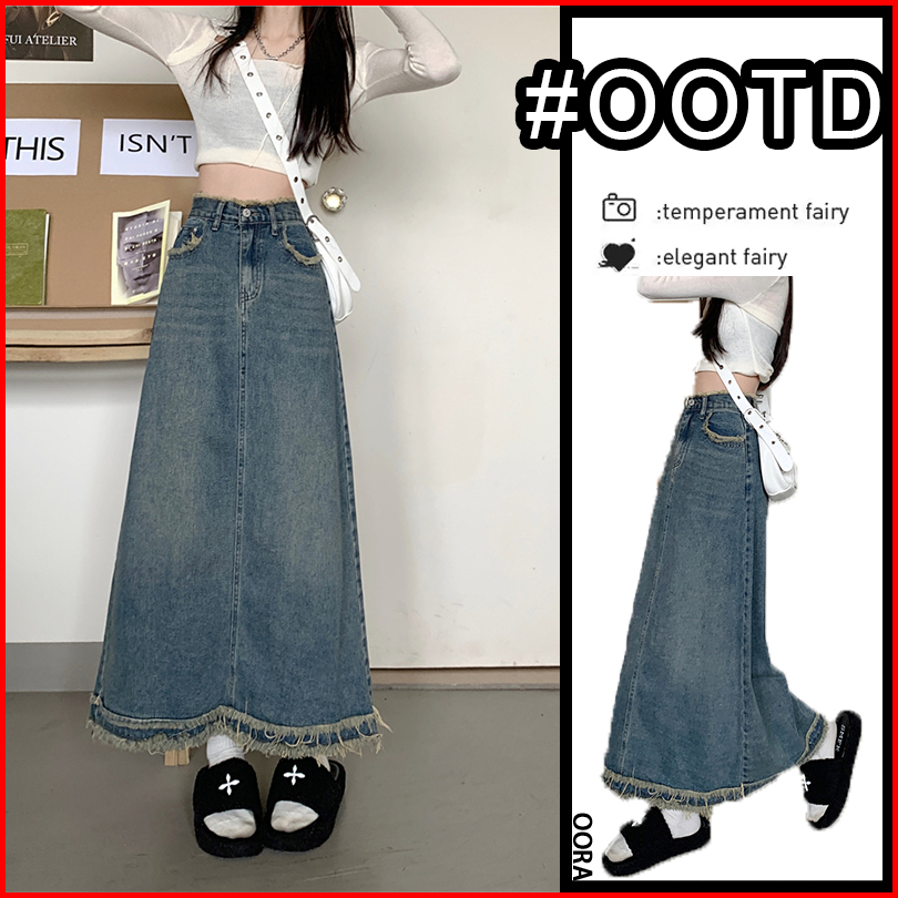Oora Rok Denim Bentuk A Rok Panjang Tepi Mentah Pinggang Tinggi Yang Melangsingkan Rok Denim Retro Longgar