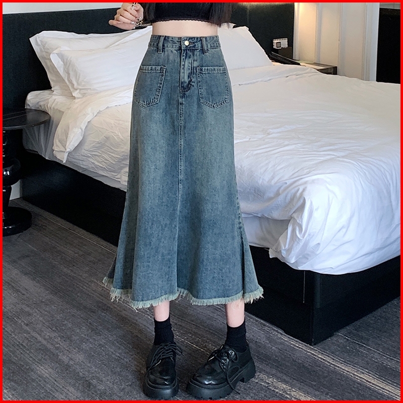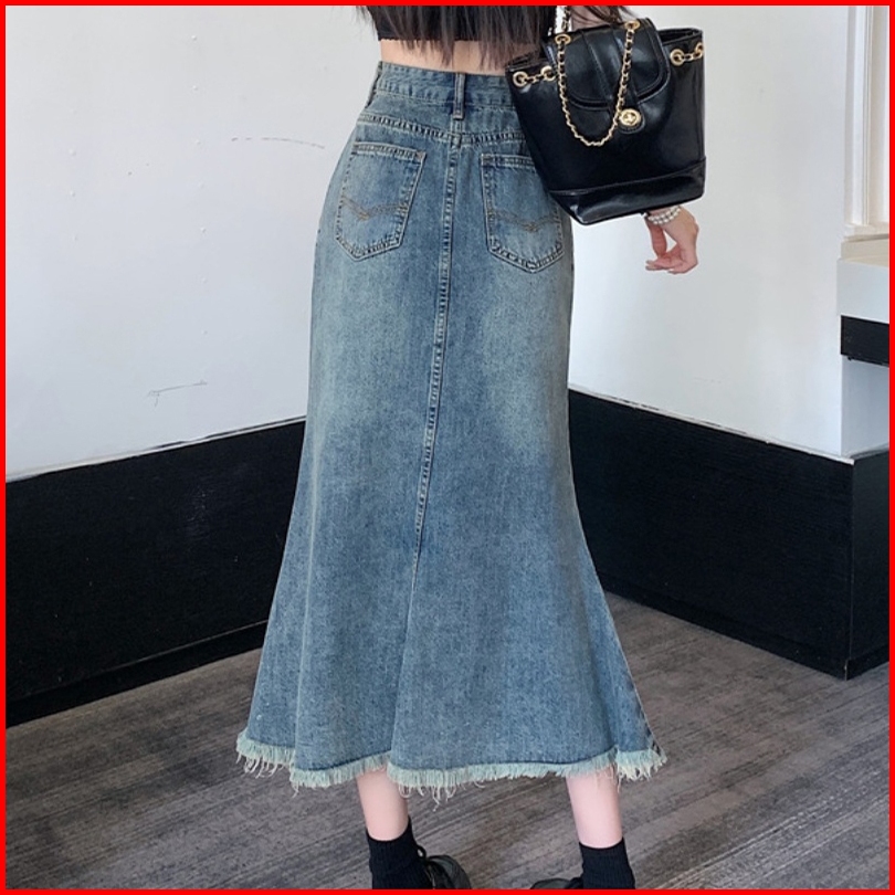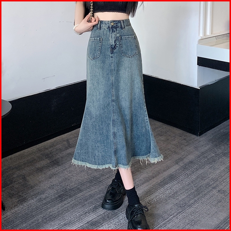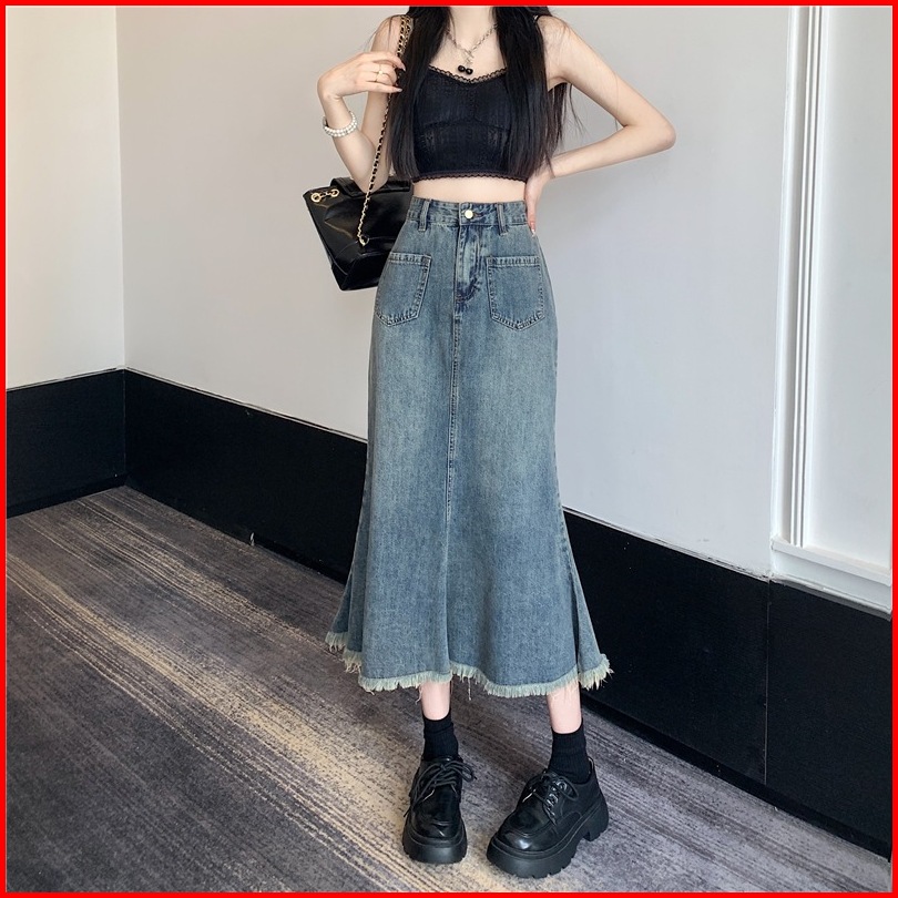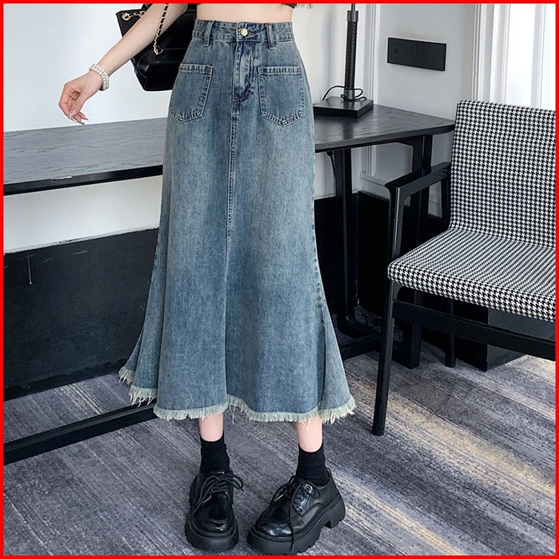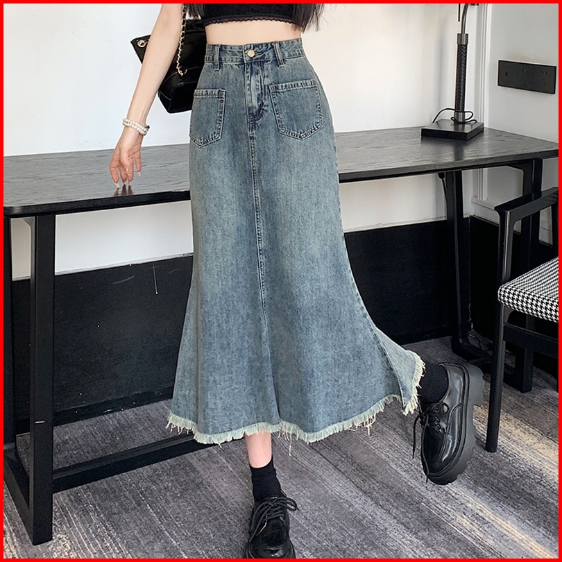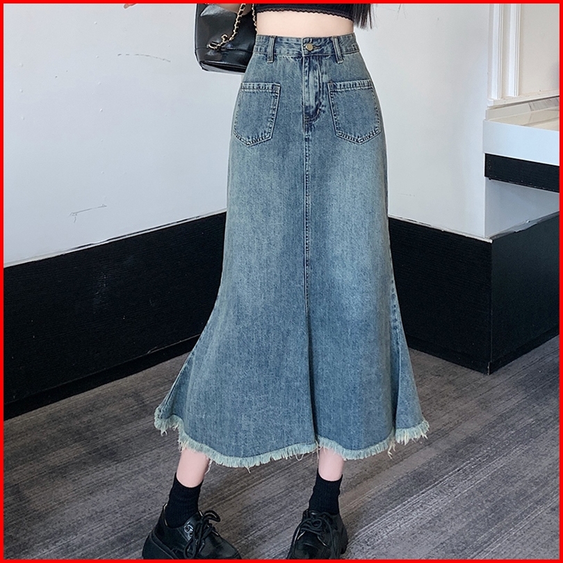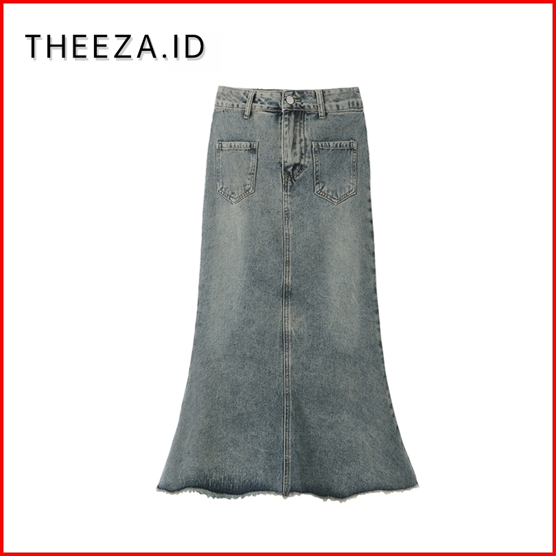 Theeza-korea Style Highwaist Rok Panjang Wanita Rok Jeans Wanita Rok Jeans Highwaist Rok Denim Panjang Rok Jeans Midi Hi