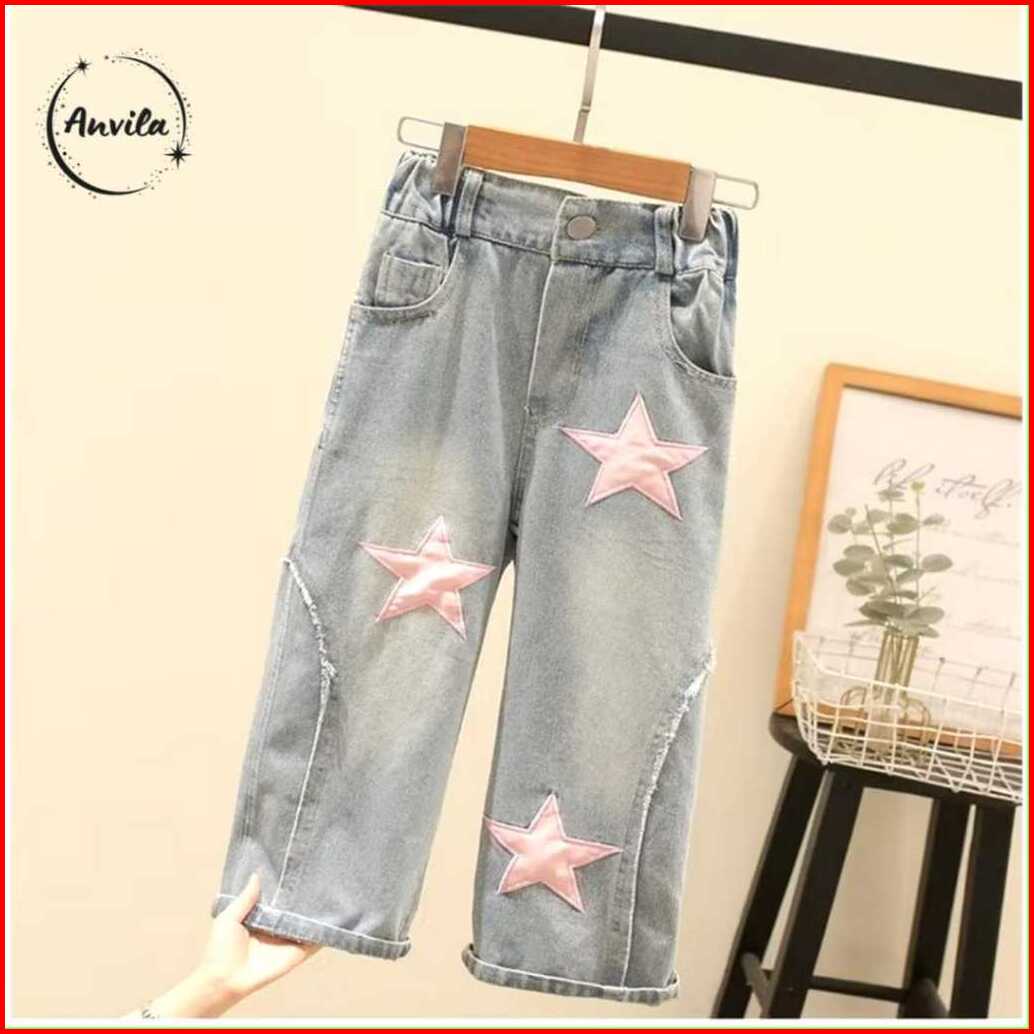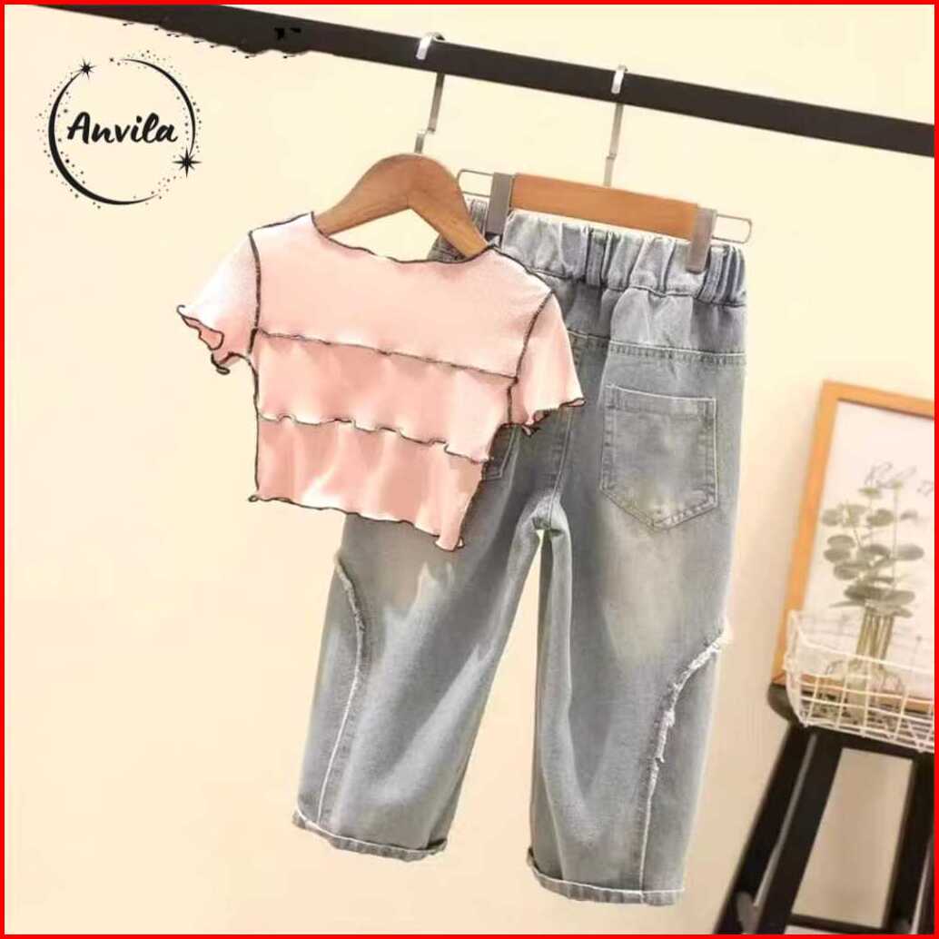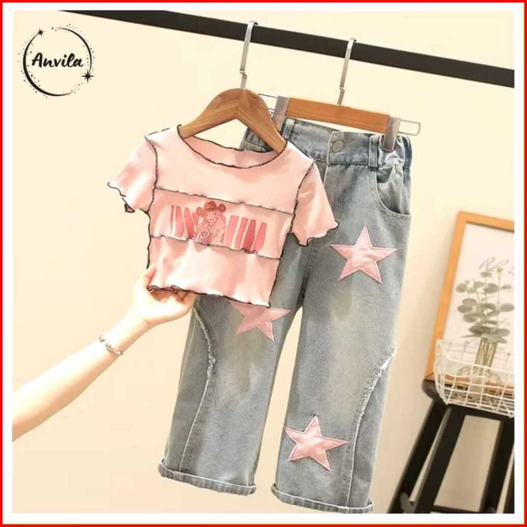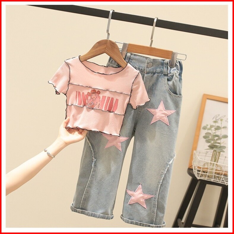 Setelan Anak Perempuan Import Knit Croptop Jahit Girl Bintang Jeans Rawis Kulot Model Kekinian