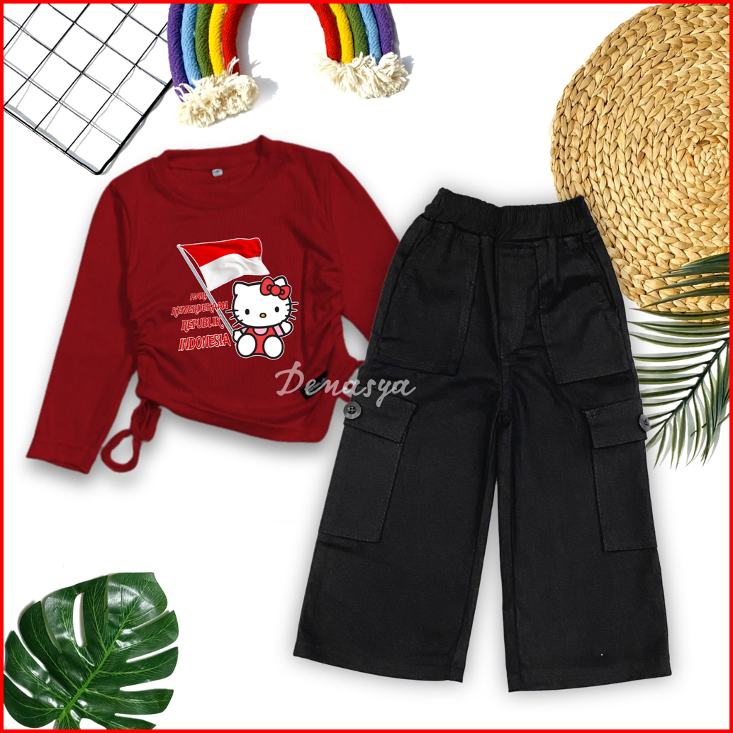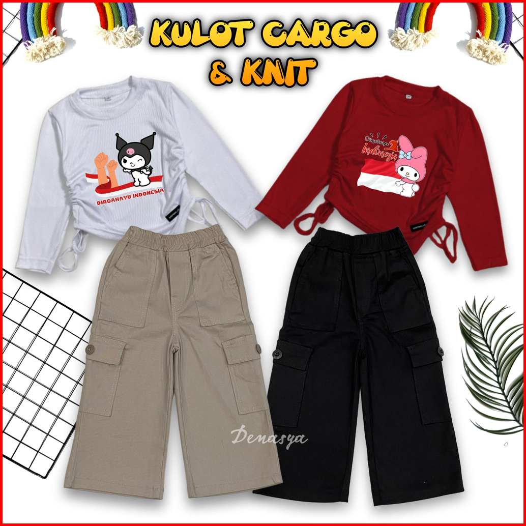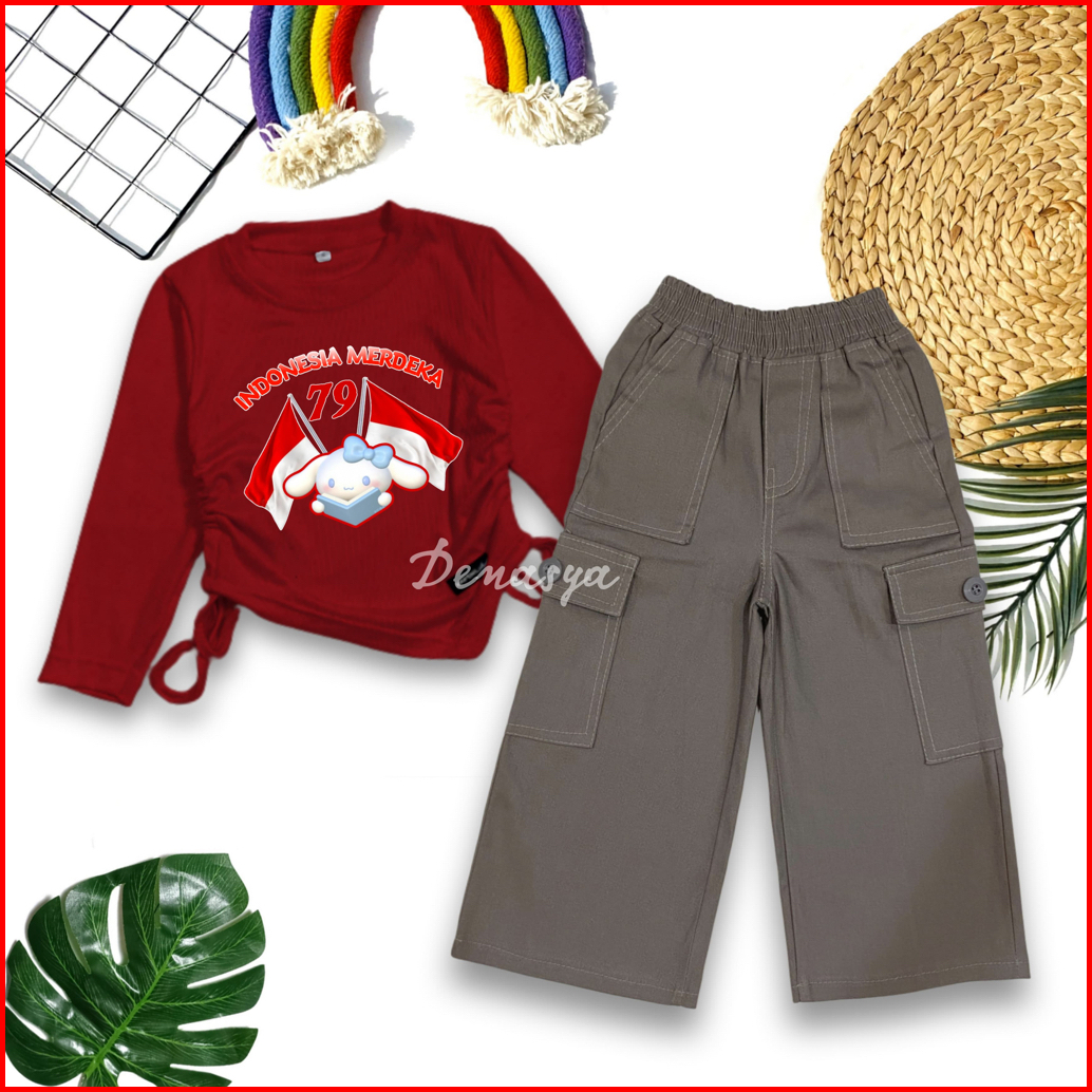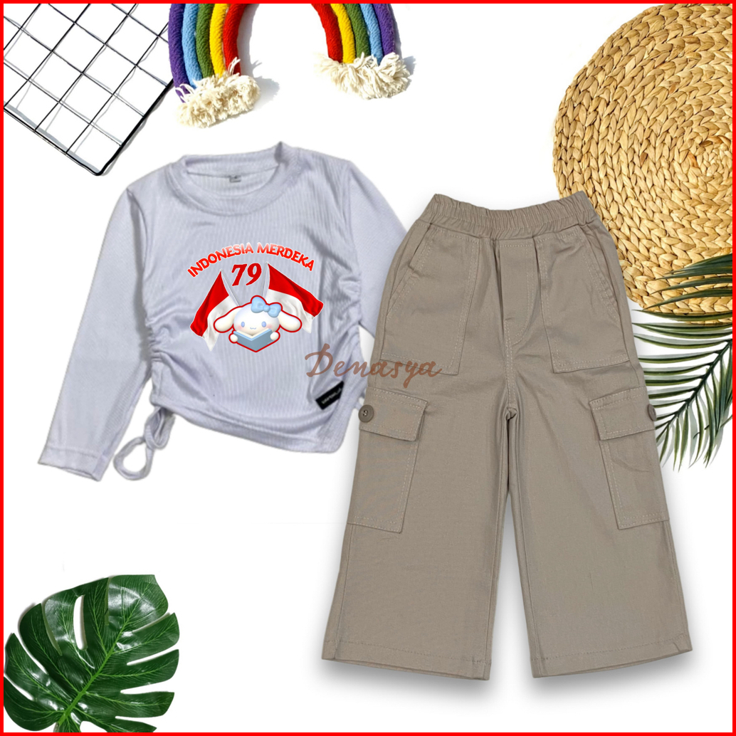 Setelan Anak Perempuan Kulot Cargo Katun Import Terbaru Knit Sablon Kemerdekaan Kuromi Melodi 1-12 Tahun