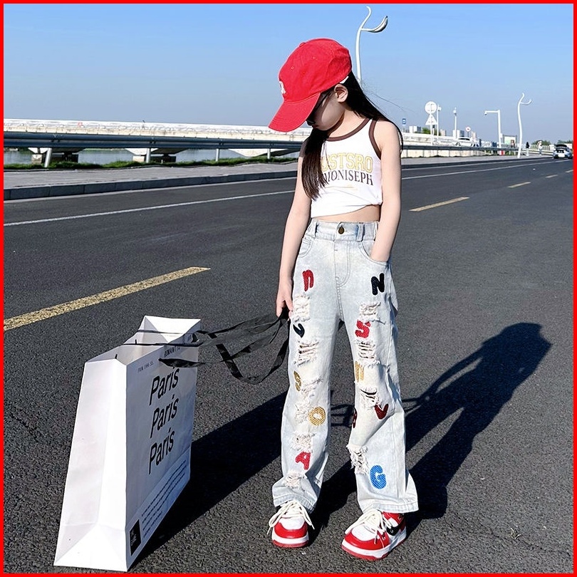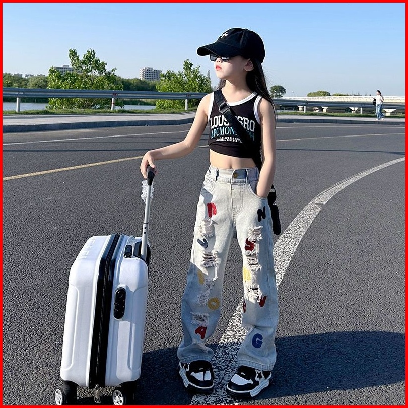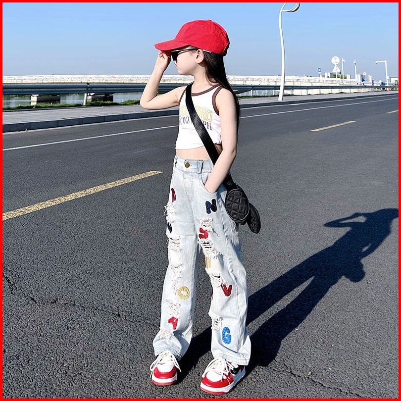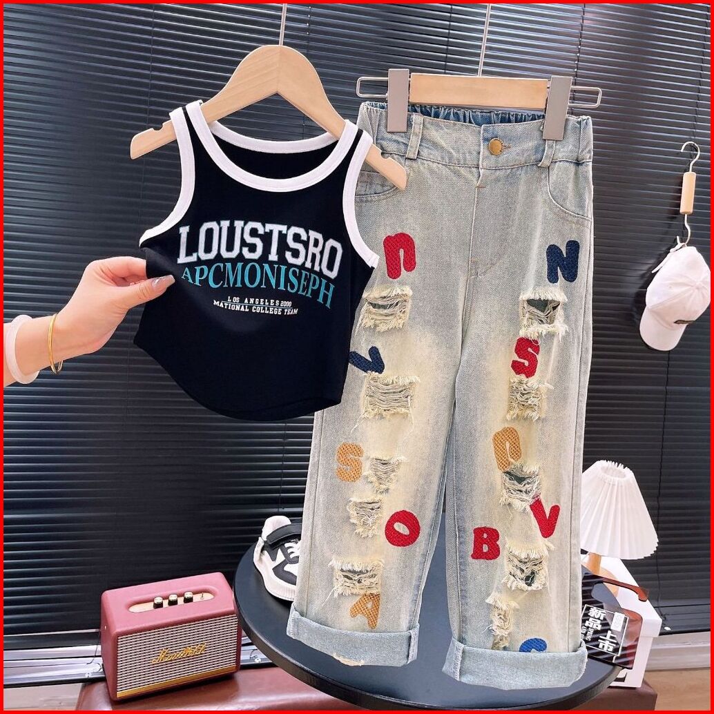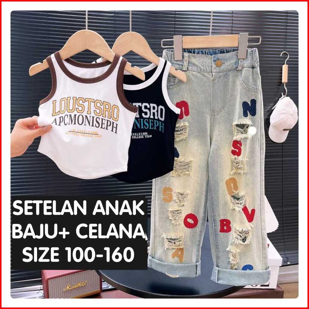 Loli-jkt Bs- 621 Setelan Anak Tanktop Loustsro Celana Jeans Ripped Bordir Sze 100-160